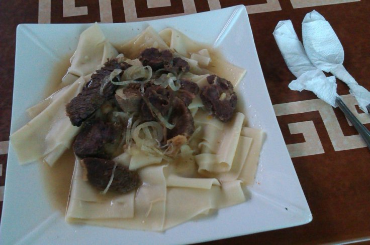 В аэропорту Алматы я испробовала конину еще раз. Уже в традиционном бешбармаке. Чтобы справиться с большими кусками жесткого мяса пришлось, как следует, поработать челюстями, на что потребовалось некое время. Но, учитывая мою хищную природу, удовольствия вгрызаться в плоть копытного так было однозначно больше. Да и поскольку мясо было скорее тушеным, вкус был более мягким и плавно втекающим. Но вывод все же не утешительный – конина мне не очень. Слишком затратна в пережевывании.