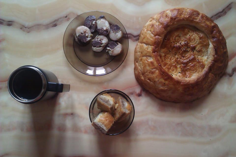 Другой кулинарный экстаз приготовил для меня совершенно обычный Бишкекский продуктовый универмаг. Огромный прилавок с золотистыми насыпями восточных сладостей, многих названий из которых я просто не слышала никогда! Халва, лукум, пахлава, с орешками и пряностями, пропитанные медом… ммм… Я не смогла удержать себя от покупки хотя бы нескольких видов этих чудесных иноземных услад жизни. И с того самого момента каждый мой день начинался чаем с какой-нибудь восточной сластью. Больше всего, мне пришлись по нраву простые выпеченные из теста небольшие фигурные цилиндрики и шарики, судя по всему обжаренные в масле и богато пропитанные медом, достаточно твердые и при этом сочно-медовые, с немного пряным привкусом, видимо от теста, и очень сытные. Есть их можно было только ложкой, потому что с них все время аппетитно сочился мед.