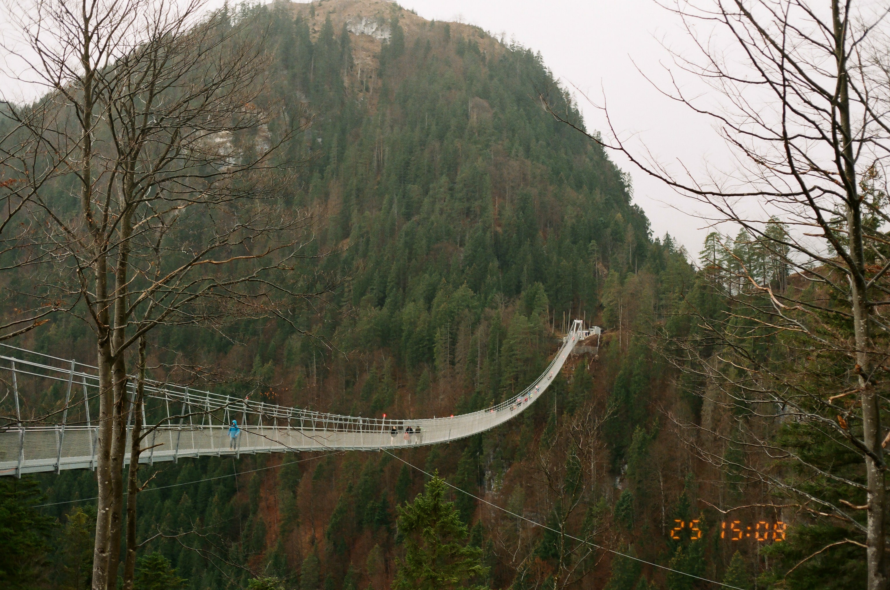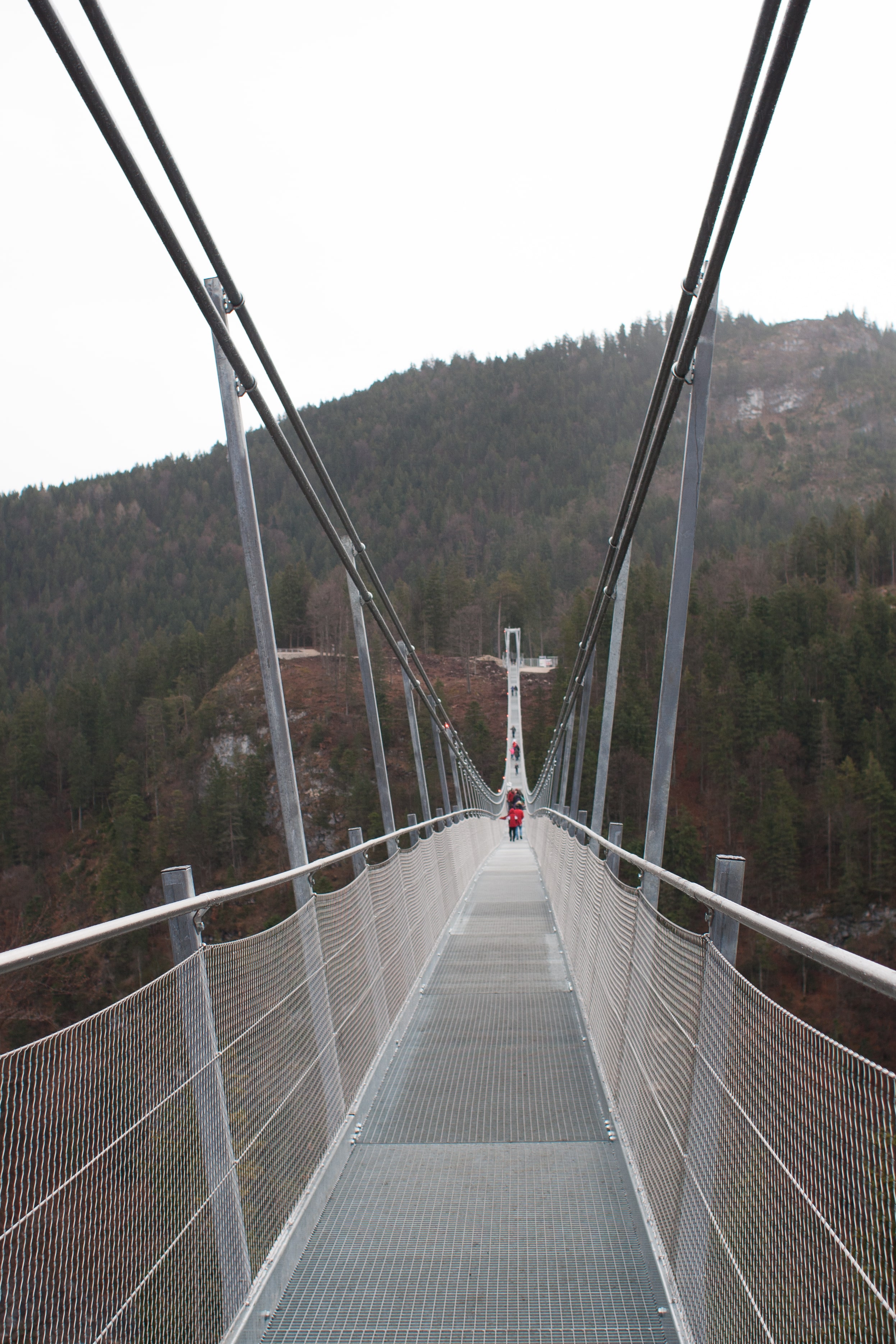 Поболтав немного на немецком с нашим милым хозяином, мы выяснили, что в округе присутствуют несколько стоящих нашего внимания объектов. В первую очередь, это замки Нойшванштайн и Линдхоф, знаменитые местные термы и висящий мост Хайлайн 179. В термы мы решили пойти после катания, замки оставили на десерт, а вот мост нас привлек своей близостью и диковинностью. Погода – шептала, но мы смело отправились в путь. Минут за 20 добравшись до места, оплатив вход и парковку, мы с воодушевлением стали подниматься в гору.