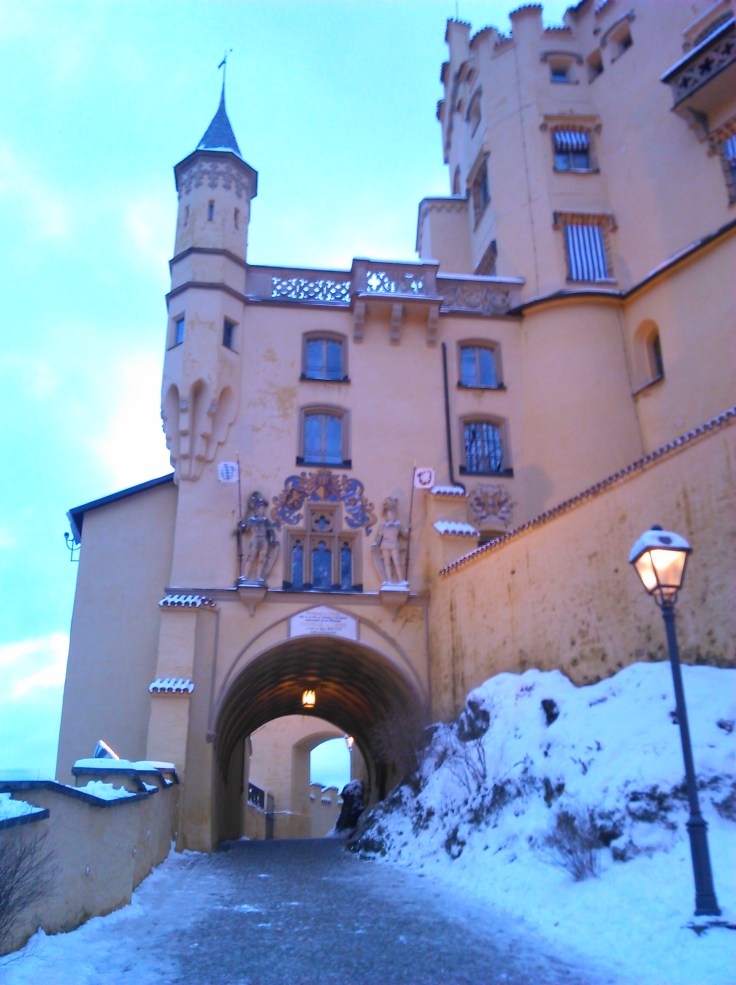 После того, как мы пришли в себя и пообедали, было решено отправиться на встречу к замку Нойшванштайн, более известному как Замок спящей красавицы, с которого, по легенде, Уолт Дисней срисовал замок для своего мультфильма. Проехав по навигатору энное количество километров и, облизнувшись в окна машины на прекрасный вид замков, мы подъехали к кассе. И тут же узнали, что посетить Нойшванштайн – не удастся, ибо все билеты проданы. (Это вообще отдельная тема – какие, скажите на милость, могут быть ограничения по билетам в огромный замок?!). С горя мы купили билеты в соседний замок – Шванштайн (ныне Хохеншвангау), который был поблизости и имел долгую средневековую историю, начиная с 12 века, когда служил крепостью для местных рыцарей. И это в отличие от Нойшванштайна, который строился в 19 веке. Особенно сильно мы обрадовались, что не попали в Ной, когда узнали, что добираться туда нужно пешком 40 минут через лес и в гору, по сравнению с 10 минутами пологой дорожки и ступенек до соседнего оранжевого Шванштайна.