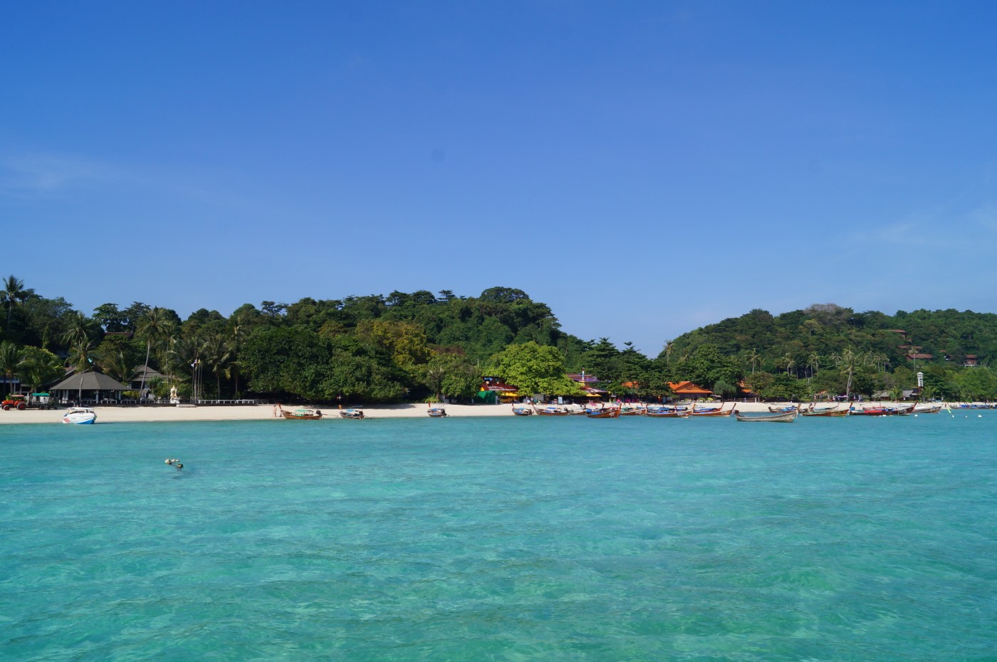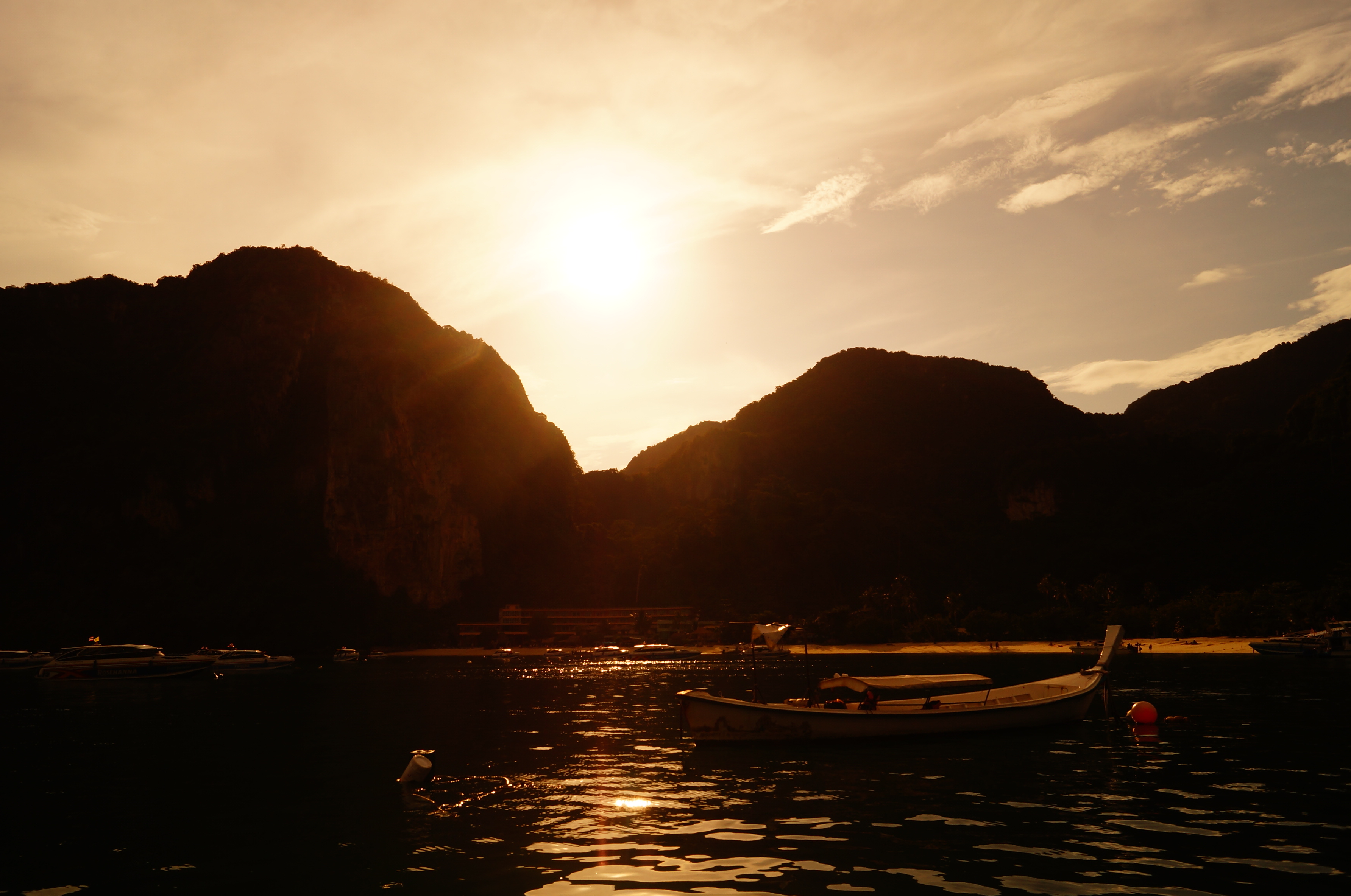 Этот день мы, как и было запланировано, провели на острове Пи Пи Дон на большем из двух островов Пи Пи. Из двух бухт, та, где располагался наш отель, оказалась уединенной, на противоположной стороне острова. На этой стороне, в отдалении от основной туристической деревни, находилась всего пара-тройка отелей, и попасть сюда можно было только со стороны залива. Зато, наша бухта оказалась удивительно живописной. Вообще, тайские острова, по праву считаются одними из самых живописных мест в мире. Сочная зелень пригорков и скал, белый песок пляжа, пронзительно голубое небо, изумрудно-сочное море и разноцветные ярко раскрашенные плоскодонные лодки, стоящие на якоре у самого берега – все это делало место похожим на идеальный тропический рай. Рядом с нашим отелем располагалась “цыганская деревня”, как гласила табличка. Она включала в себя несколько построенных рядом друг с другом кафешек и ресторанчиков на любой вкус и вид. Судя по всему, морепродуктами все эти пляжные ресторанчики были обязаны как раз рыбакам именно с этих лодок.