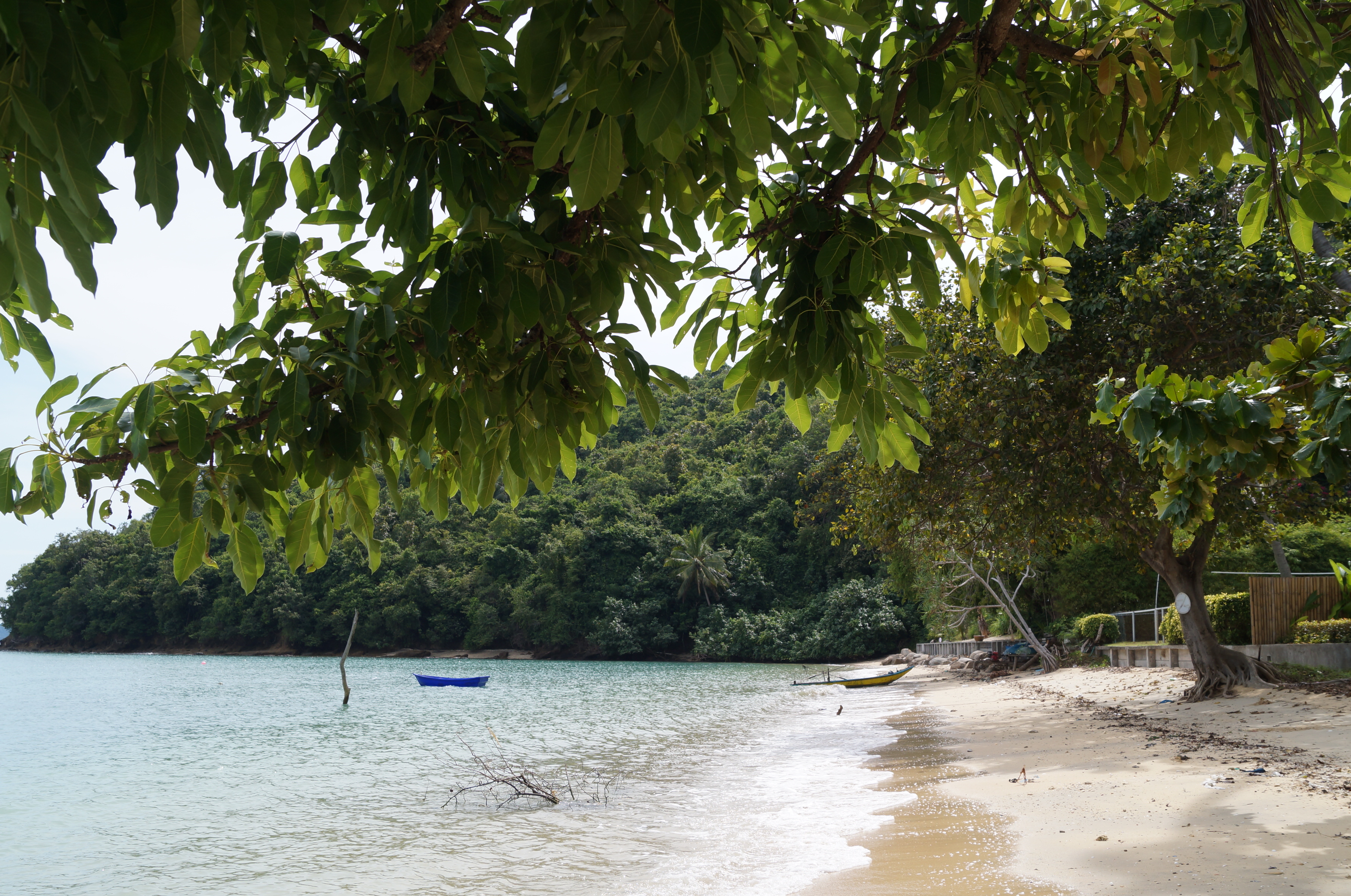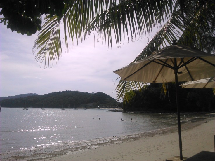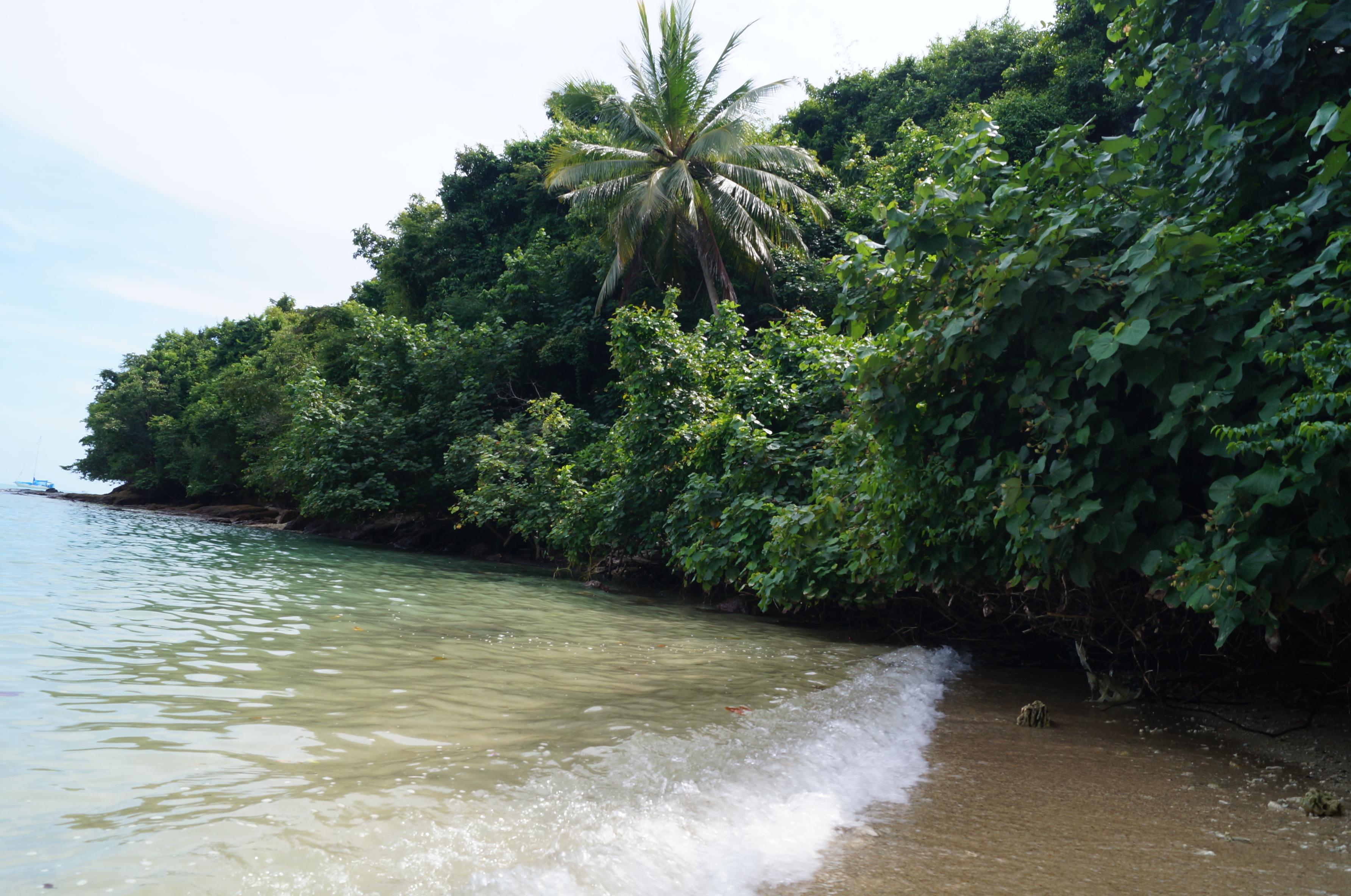 Ради развлечения, мы решили пешком обойти остров вокруг. Пройдя насквозь через его центр, где мне досталось мороженное из дуриана (только представьте это!), мы вышли с противоположной стороны в небольшую дикую бухточку и, свернув налево, пошли по тропинке вдоль берега. Постепенно, тропинка становилась все уже и более дикой, все больше нас настораживая. Но мое любопытство было сильнее, к тому же поворачивать назад было лень. Поэтому мы пошли дальше, чем превратили легкую прогулку вдоль берега в некое подобие перехода через джунгли. Тропинка шла то вверх, то вниз, то от берега, то вновь возвращалась к нему, то полностью скрывалась под травой, то вновь открывалась коричневатой землей. Запыхавшиеся, но довольные и гордые собой, мы таки вышли к нашему пляжу, обойдя полострова.
