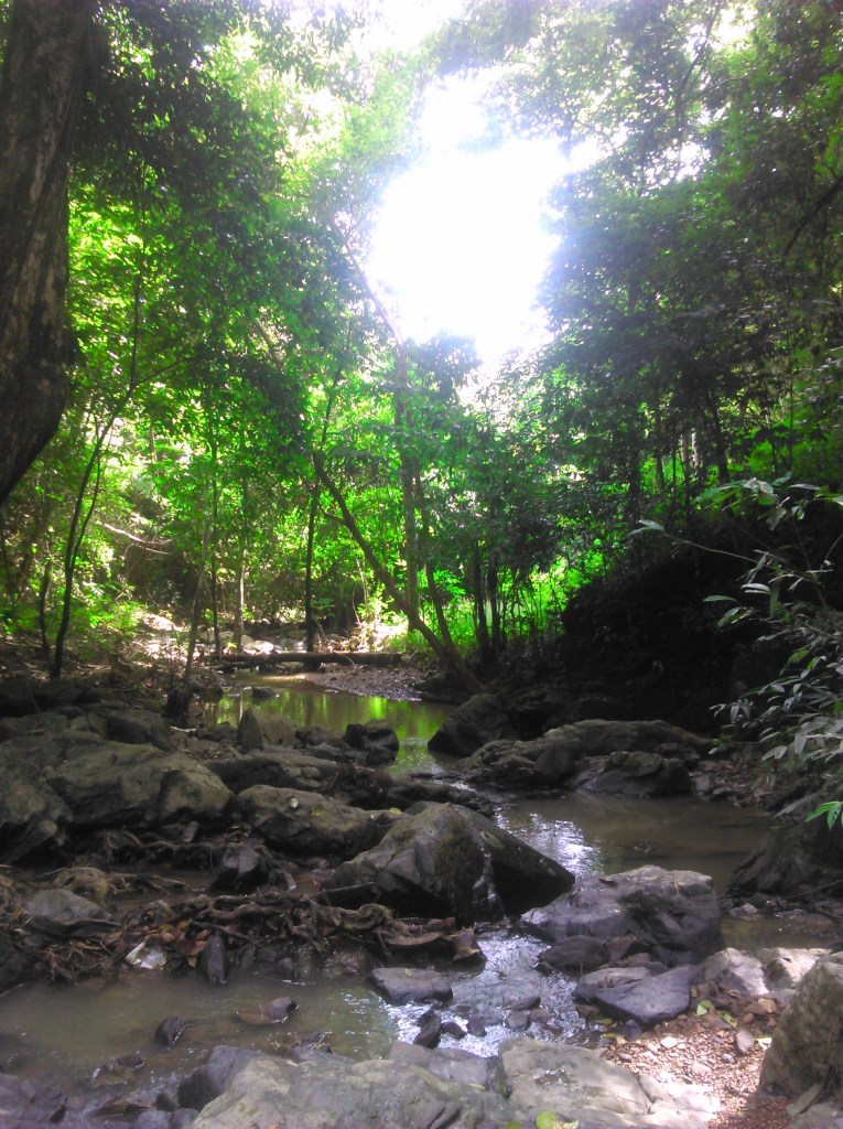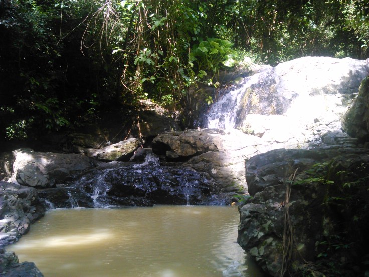 Не удовлетворившись этим водопадом, мы пошли дальше. Преодолев склизкие мокрые камни, грязь и едва не спотыкаясь о корни кустов и деревьев, поднявшись вверх, мы добрались до второго водопадика. Который был раза в 3-4 меньше предыдущего и не образовывал водоема. Мы прошли его мимо и его, в надежде, что дальше нам повезет больше. И нам таки повезло больше. Прокарабкавшись еще несколько метров по камням, грязной тропинке и между деревьями мы выбрались к уютному водоему, со всех сторон окруженному тропической зеленью и с плоской каменной площадкой на одной стороне. Посреди прудика, глубиной с мой рост, выступал большой плоский камень. Тропинка продолжалась и дальше, отчего я, не в силах унять любопытства, слазила туда глянуть. Там в почти непролазных джунглях обитал источник ручья. Я вернулась, чтобы комфортно расположиться и насладиться нашим спокойным уединением, ибо кроме нас на всех водопадах никого не было.