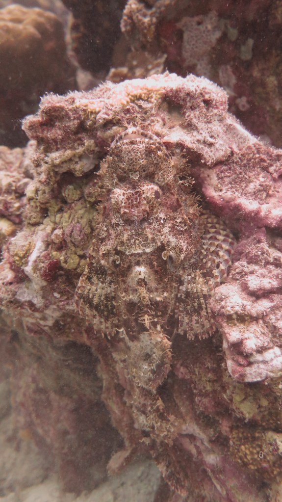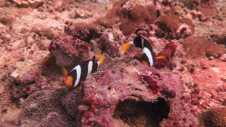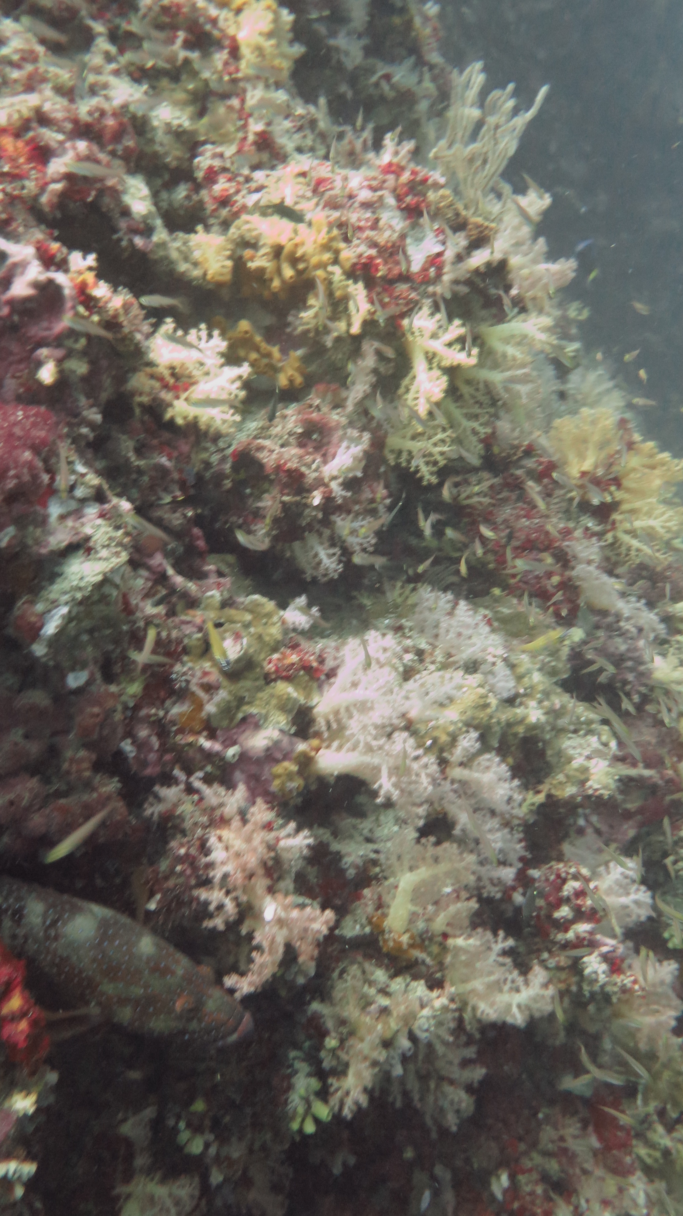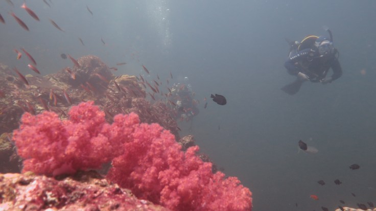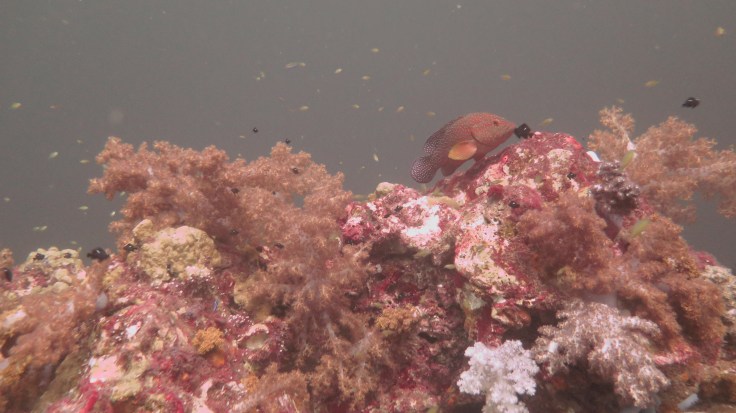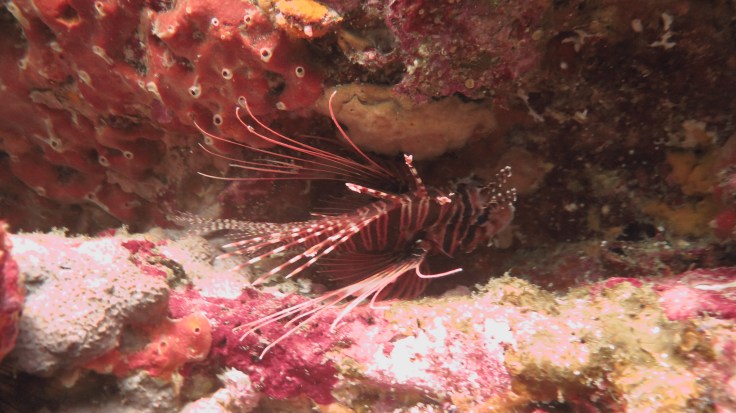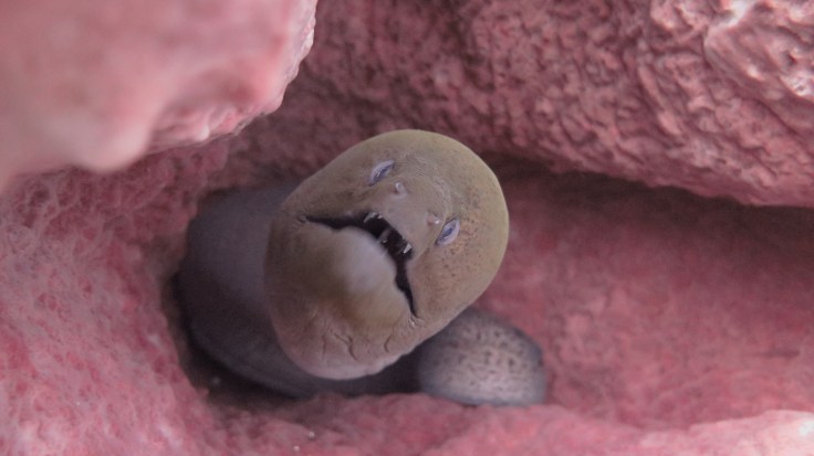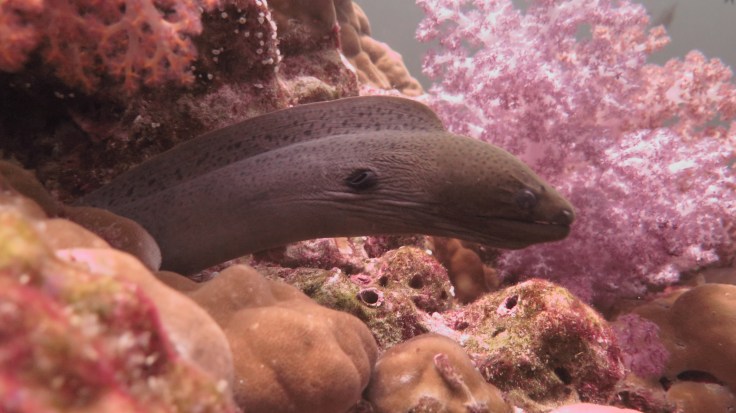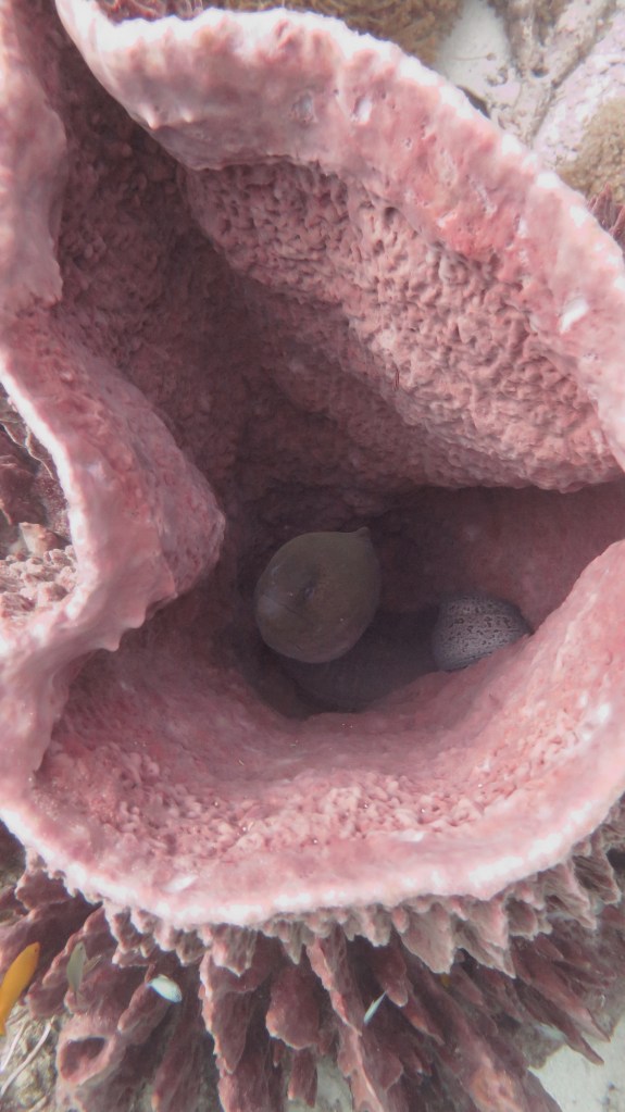 Погрузившись не очень глубоко, мы поплыли над рифами, мимо большой стаи увесистого тунца, мимо странных бочкообразных красновато-розовых образований, зияющими сверху, назначение которых я так и не поняла. Из своего природного любопытства я решила внимательно изучить одно из них. “Бочка” была, наверное, полтора метра в высоту и метр в диаметре с рифлеными краями, шершавой темной внешней поверхностью и гладкой розоватой внутренней. Как только я, приблизившись, заглянула внутрь – я немедленно в испуге отпрянула, ибо внутри обнаружилась взрослая мурена, которая была, похоже, напугана не меньше моего. Вообще, в этот дайв нам повезло на мурен, мы видели целых 5 или 6 штук, включая одну мелкую.