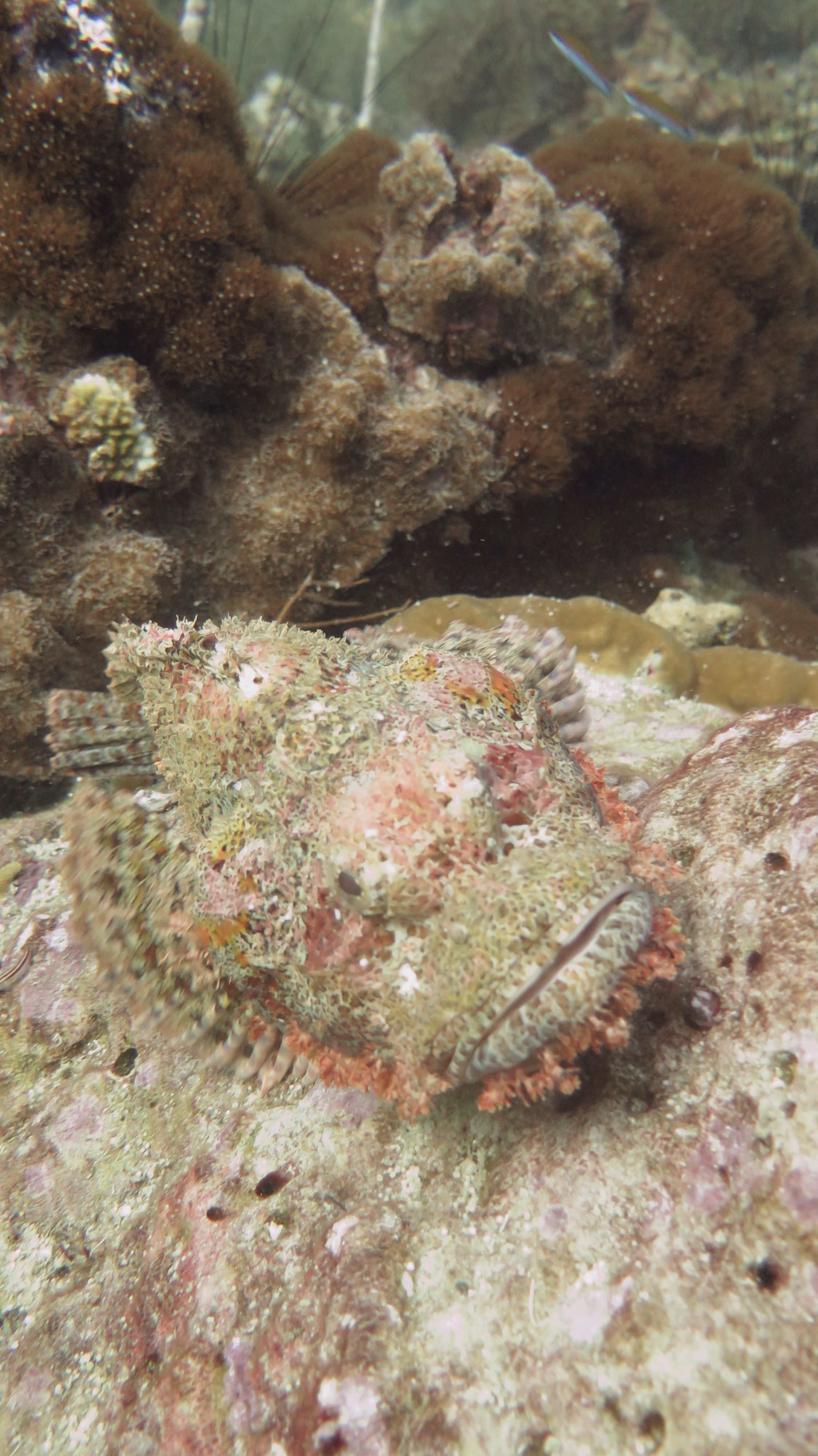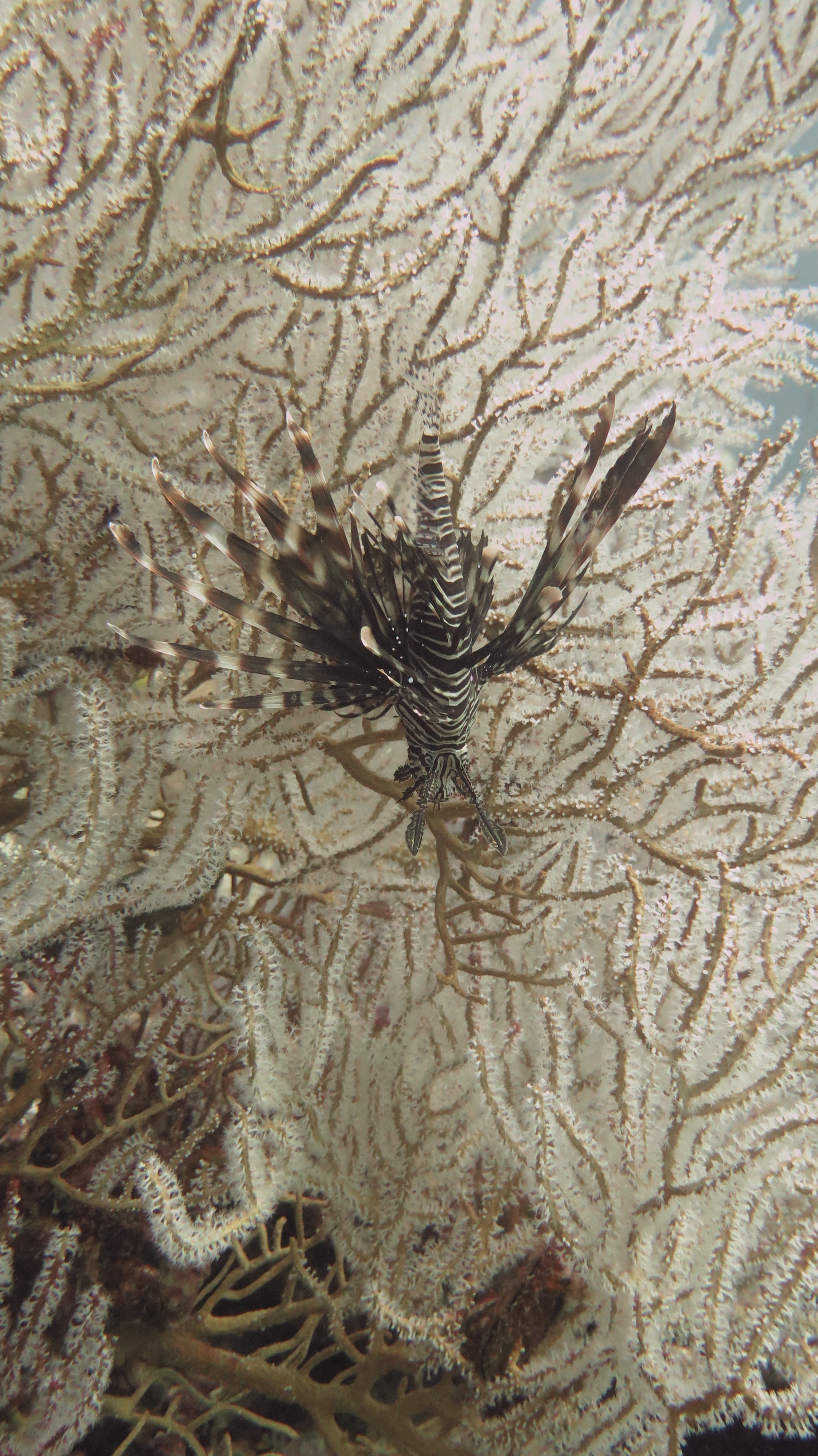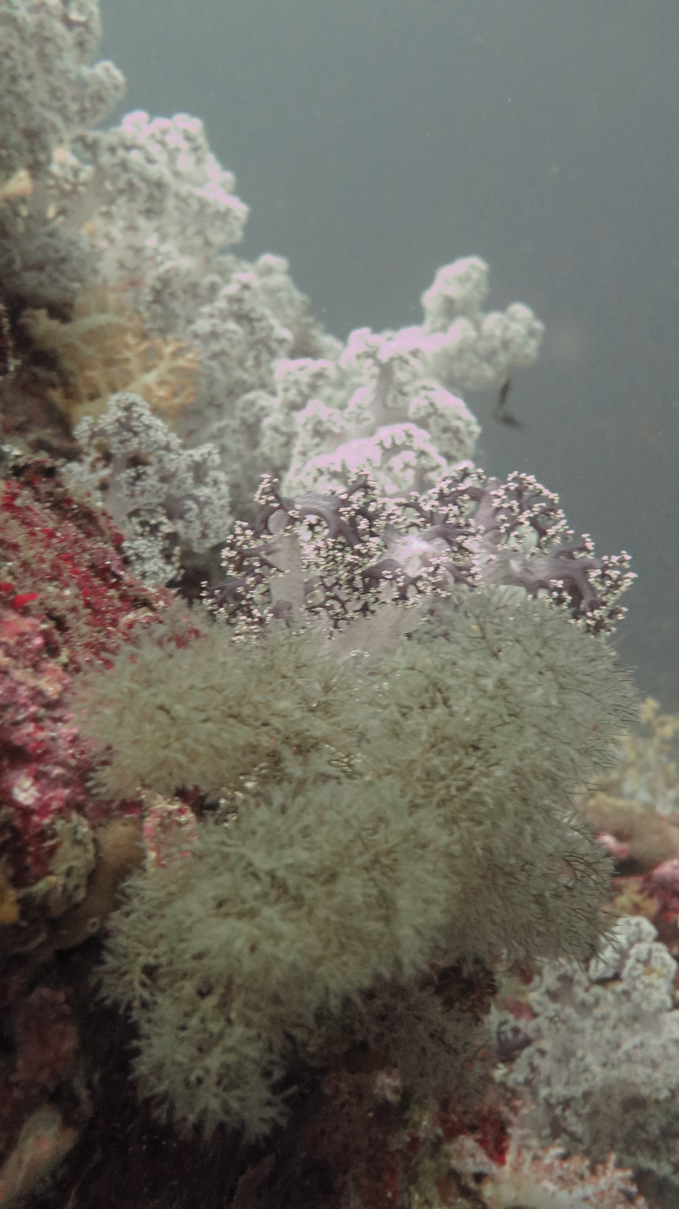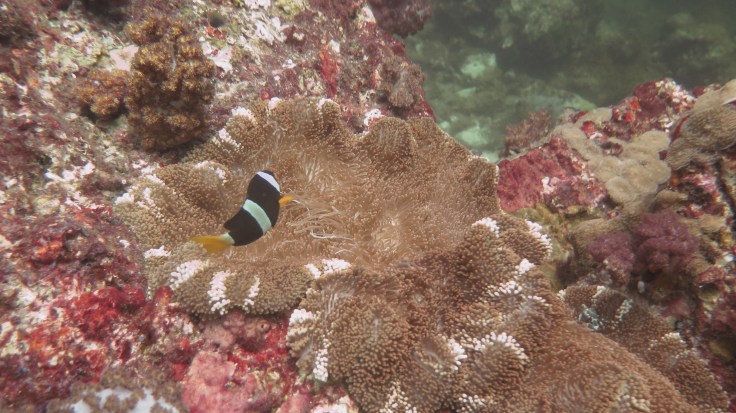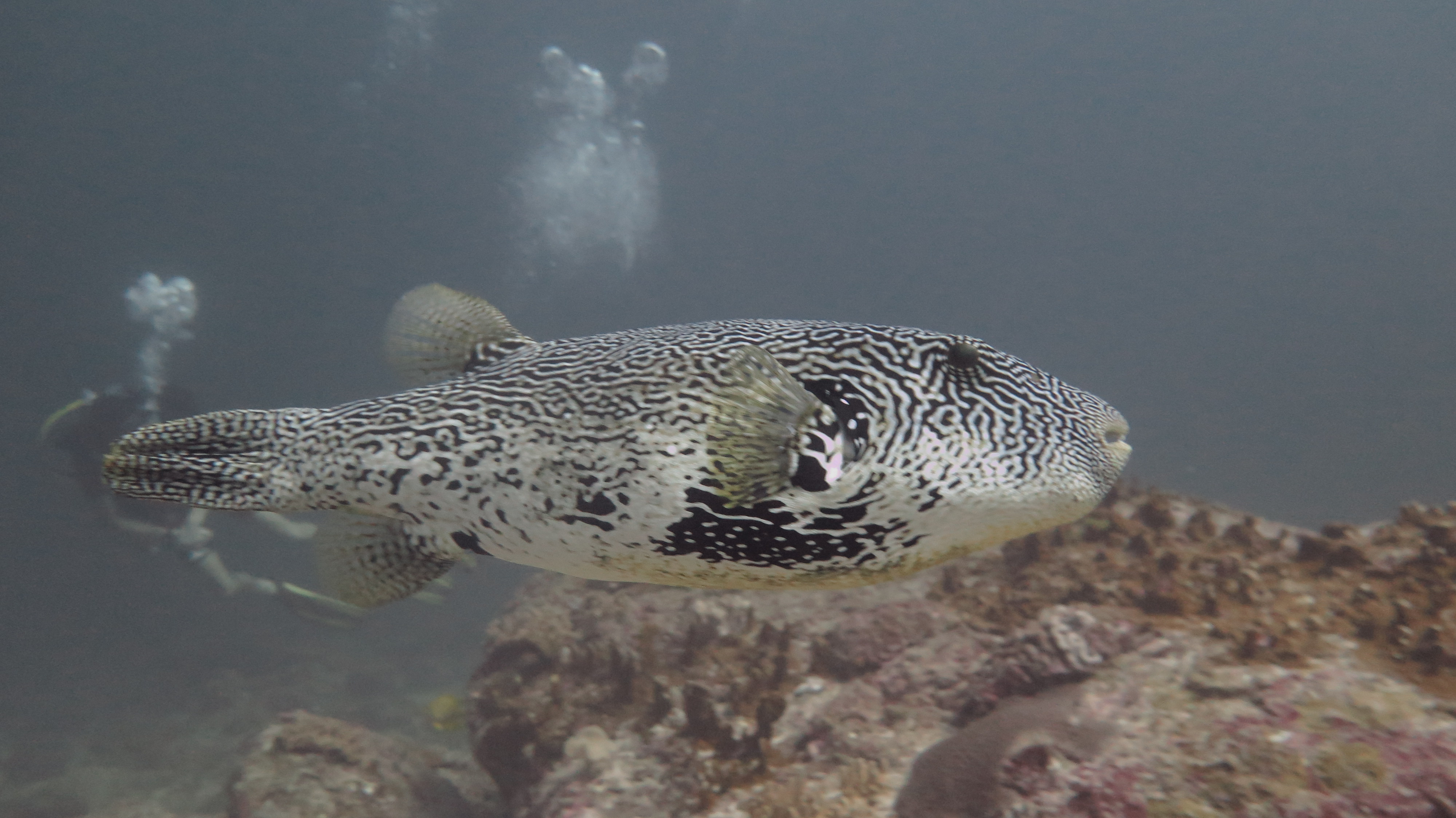 Погрузившись не очень глубоко, мы поплыли над рифами, мимо большой стаи увесистого тунца, мимо странных бочкообразных красновато-розовых образований, зияющими сверху, назначение которых я так и не поняла. Из своего природного любопытства я решила внимательно изучить одно из них. “Бочка” была, наверное, полтора метра в высоту и метр в диаметре с рифлеными краями, шершавой темной внешней поверхностью и гладкой розоватой внутренней. Как только я, приблизившись, заглянула внутрь – я немедленно в испуге отпрянула, ибо внутри обнаружилась взрослая мурена, которая была, похоже, напугана не меньше моего. Вообще, в этот дайв нам повезло на мурен, мы видели целых 5 или 6 штук, включая одну мелкую.