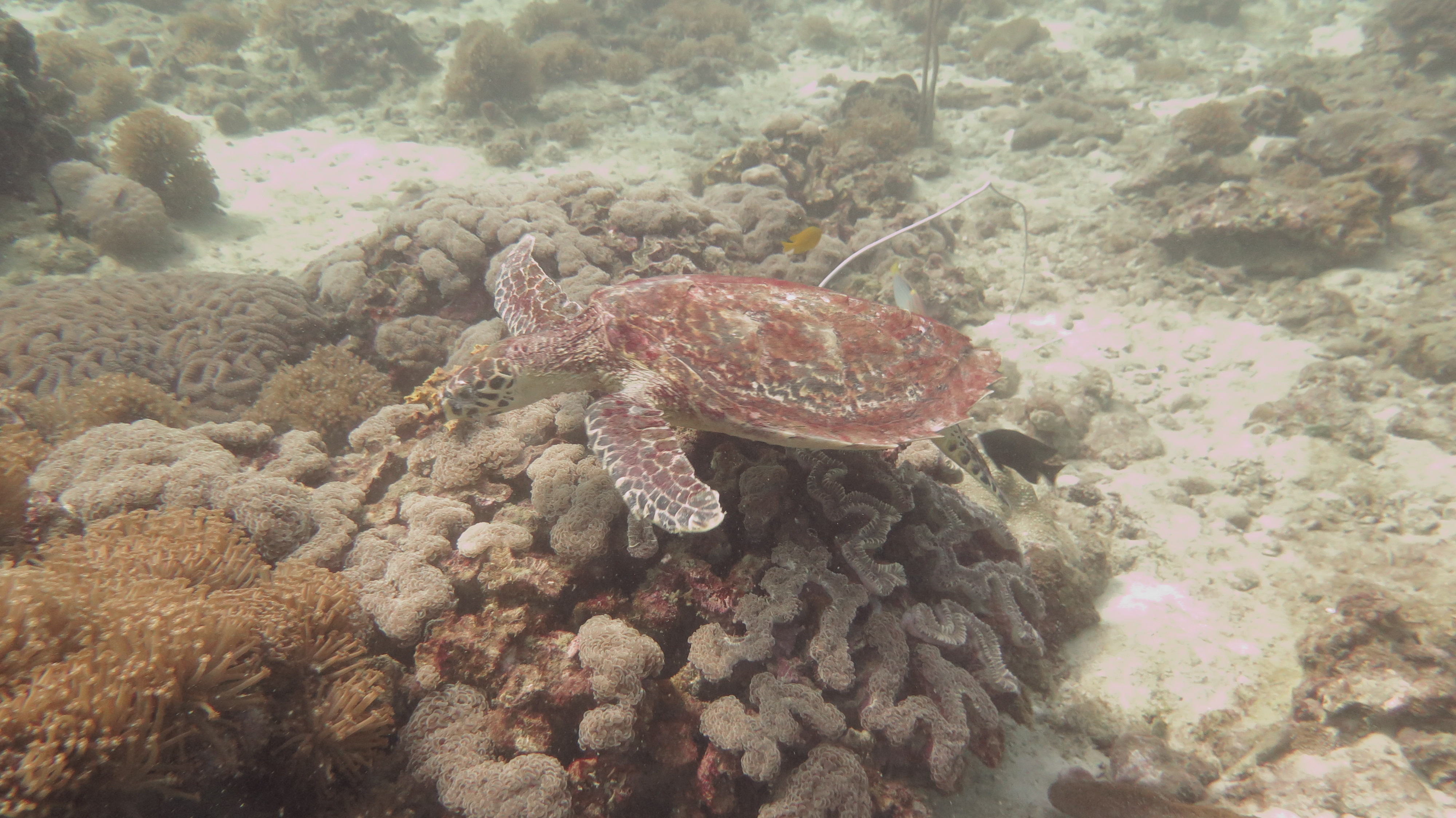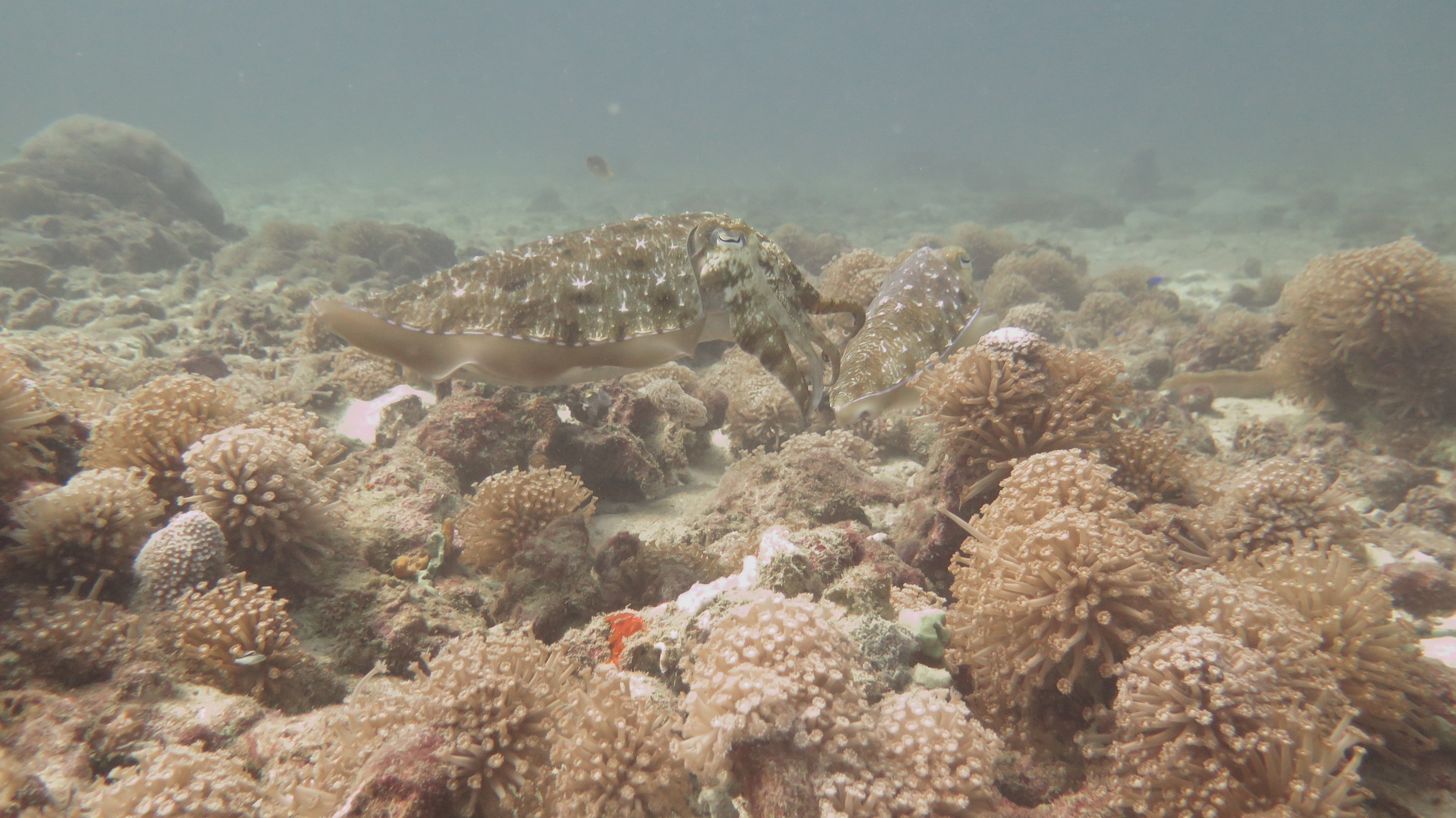 На втором сайте, мы сходили налево, за черепахами. И почти в первые же минуты столкнулись нос к носу с двумя важными каракатицами! Большие, с полметра в длину, упитанные, словно с трудом втиснутые в свои колыхающиеся мини-юбочки, играющие по своей прихоти, цветом и рисунком своей кожи, они сначала стояли на месте, надеясь, что мы просто проплывем мимо. Но поняв, что просто так от нас не отделаться, быстренько уплыли, угрожающе сделавшись более темными и рисунок свой более резким. После каракатиц нам встретилась маленькая метровая черепашка. У меня начинает создаваться превратное впечатление, что морские черепахи бывают только подростково-маленькими, поскольку других я не видела еще ни разу.