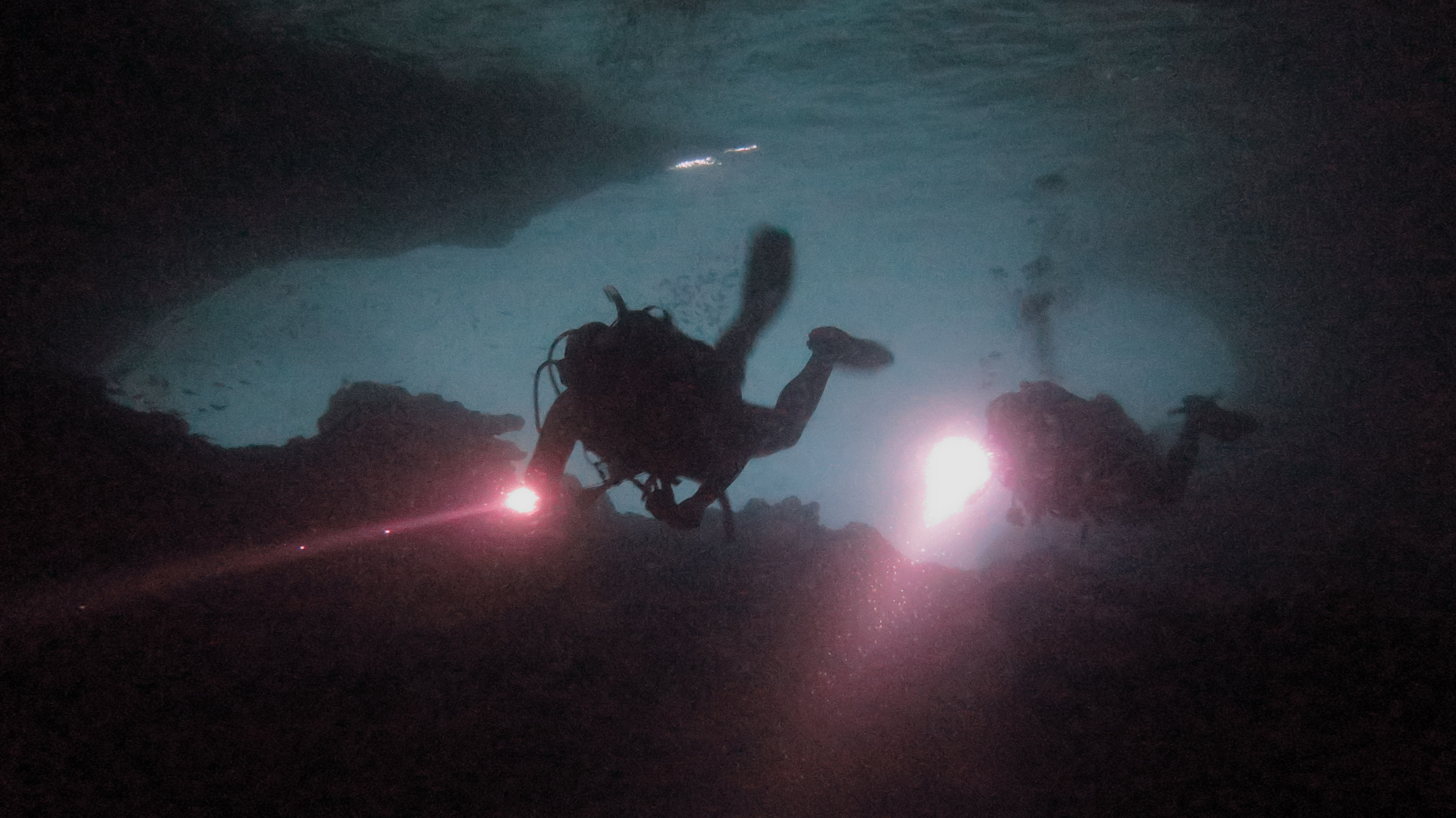 Но главными объектами в это погружение все же были гроты. Заплыв в первый из них, мы, как полагается, включили свои фонари. И тут, потрясающее зрелище предстало моим глазам: в свете прожектора фонаря танцевали миллионы малюсеньких, размером с ноготь, прозрачных медузок! Они были везде вокруг нас, куда бы ни падал свет фонаря. Они наполняли воду в гроте, превращая ее в какой-то медузий бульон. Они ритмично колыхались на волнах все вместе, и при этом каждая из них танцевала в своем собственном ритме и своем собственном направлении. Словно ты не в воде, а в медузах плывешь! В море из микромедузок! Удивительное зрелище и переживание, одновременно восхитительно забавное и умилительное, когда смотришь на этих бесстрашных бултыхающихся крохотулек, но в то же время слегка тревожное и угрожающее, поскольку эти милашки вполне себе ощутимо жалили. И если бы не мой полный мокряк (не изолированный гидрокостюм с проникающей под него водой, покрывающий все тело кроме стоп, кистей рук и лица), быть мне жестоко разжалованной во все места!