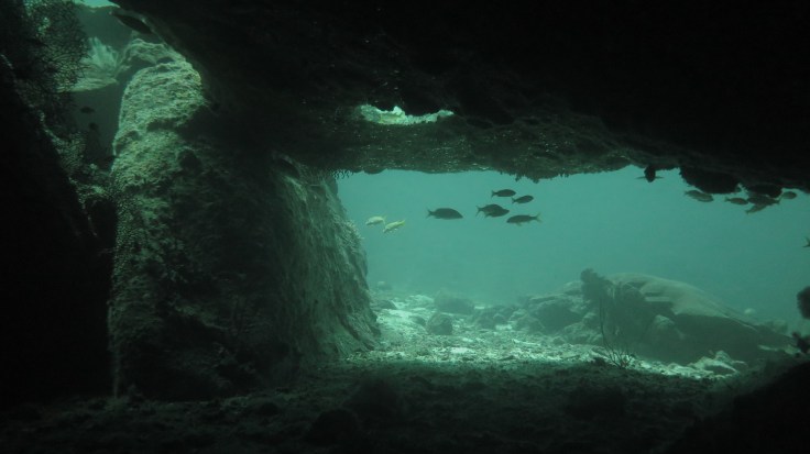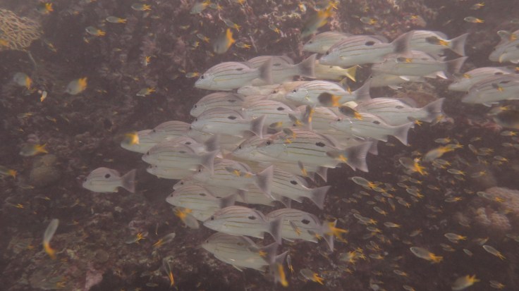 На обратном пути из грота мы встретили большой косяк желтых рыбешек, которых прозвали “желточками”. Наблюдая их, я не переставала удивляться такому чудо-организму, как косяк рыб. Можно бесконечно наблюдать, как одна конкретная рыбешка становиться частью большого организма со слаженными и продуманными движениями. Не устаю поражаться выдумкам матери-природы!