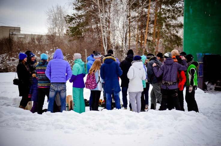 Придя на место, где уже собралась кучка сумасбродов и уже сигали с неба, я с пристрастием обозрела всю ситуацию. Огороженная решетками площадка была занесена снегом, посреди нее стояла металлическая башня с пяточком наверху. Рядом с башней – вытоптанный островок с копошащимися людьми, фото- и видеооператорами и незарастающая вытоптанная тропа непосредственно к башне с зияющим ртом входной двери. Рядом с группой жаждущих на двух ковриках покоились сумки, вещи, одежда, термосы и, самое главное, несколько касок и комплектов страховок. Народец весело галдел, кого-то одевали в страховку ловкие руки помощников, кого-то другие, не менее услужливые руки – раздевали, кто-то подписывал врученную на планшете подписку. И все это под периодические предупреждающие окрики сверху: «НА ЭКЗИТЕ!». Чуть поодаль, наискосок, пара ребят работала «на приеме» и освобождала ошалевших, спустившихся с небес из цепких лапок той самой веревки.