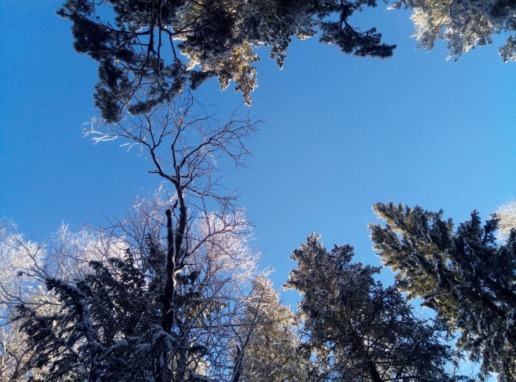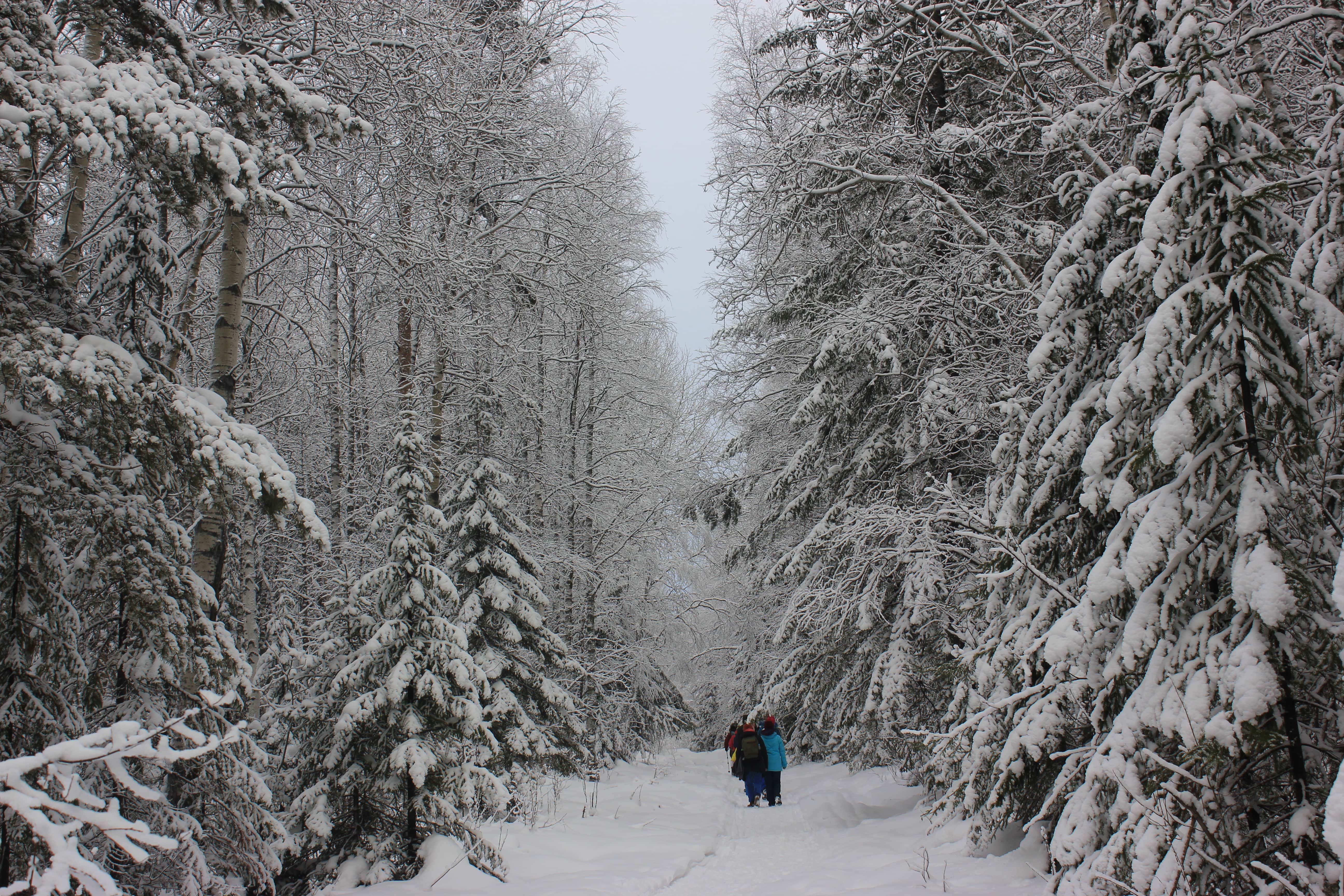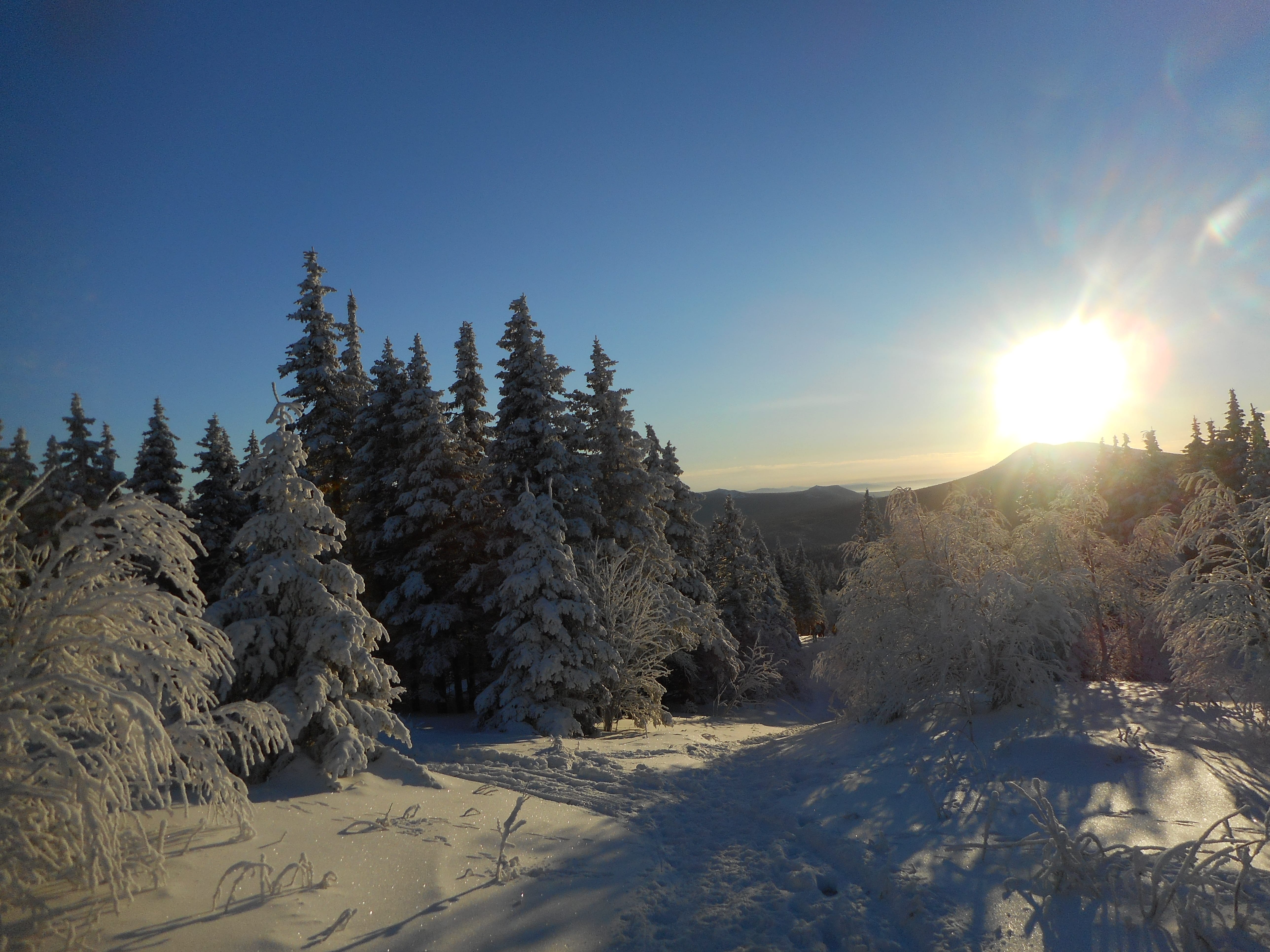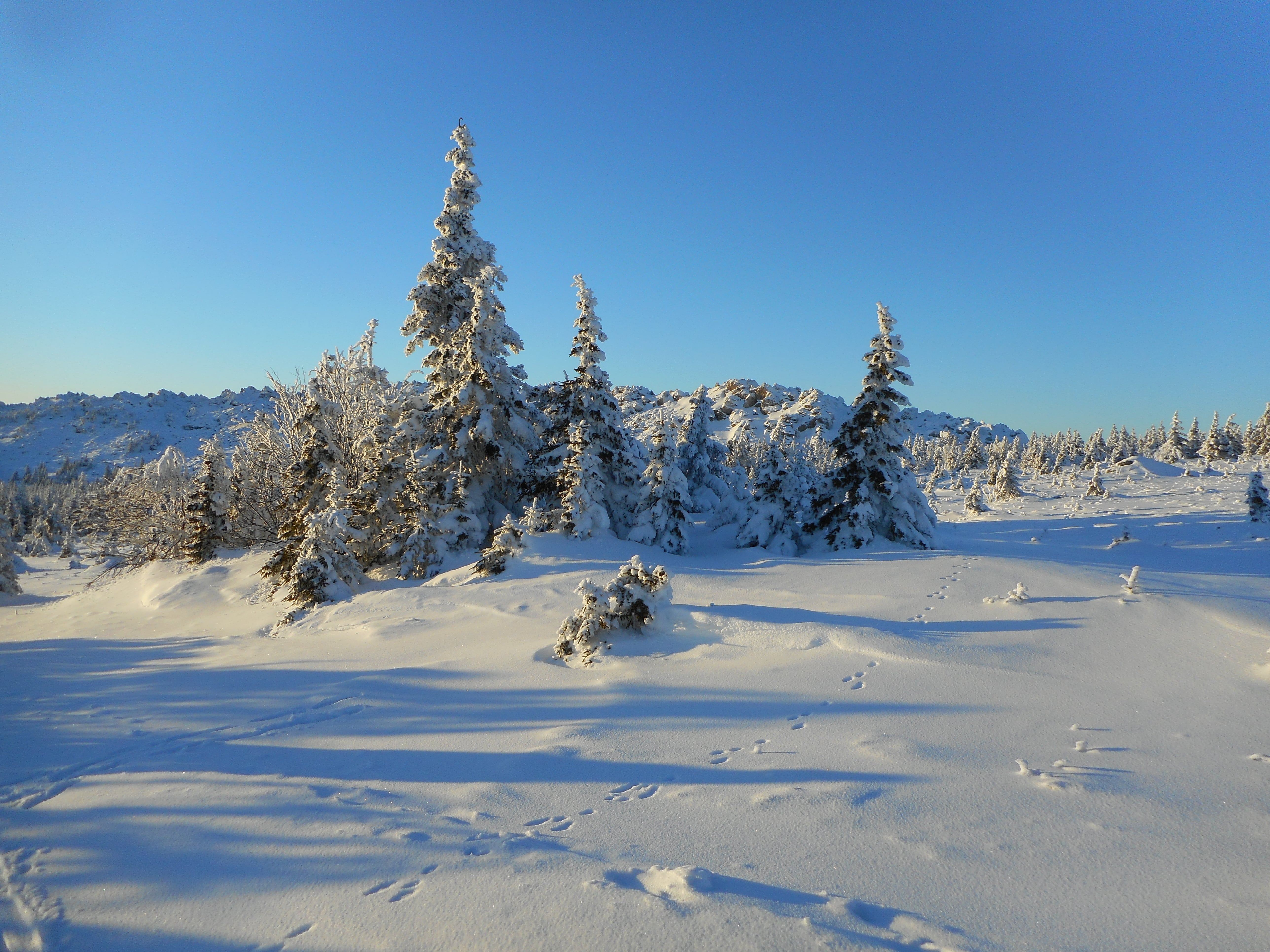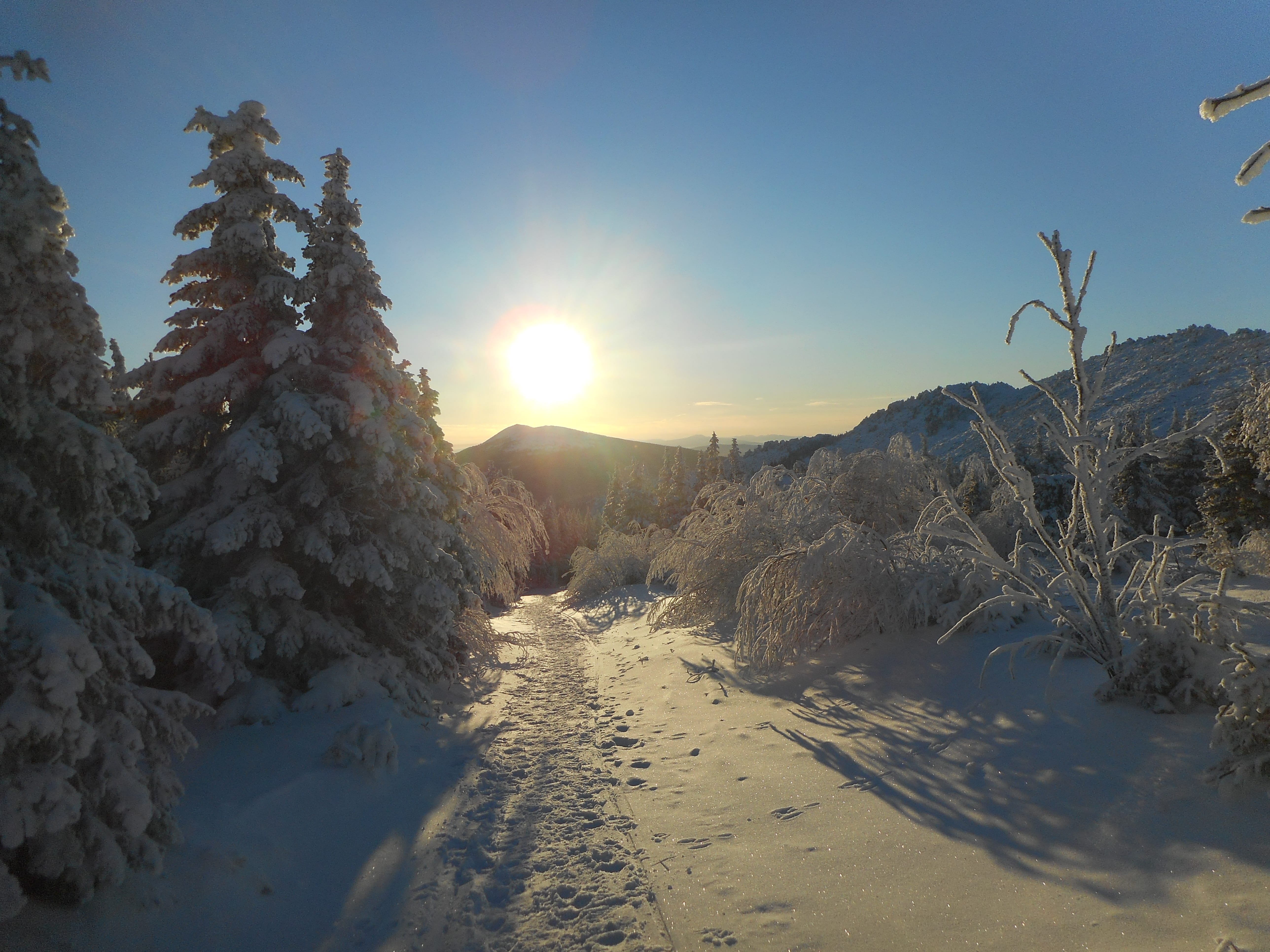 Сначала я чувствовала себя прекрасно – ноги несли меня уверено по снегу, легкие вдыхали свежесть зимних реликтовых лесов, тело вырабатывало тепло. К тому же все наши тяжелые рюкзаки так предусмотрительно увез снегоход. Но уже через 1,5 часа все изменилось: я начала запыхиваться и жалеть, что не взяла себе палки-ходилки, потому что народ с ними слишком уж бодро шел. Как назло, именно в этот момент, когда мое внимание было сосредоточено на каждом шаге, а взгляд на тропе перед собой и мне уже не хватало сил на оглядывание окрестностей, небо стало расчищаться и лес озарился и заискрился от земли до верхушек крон.