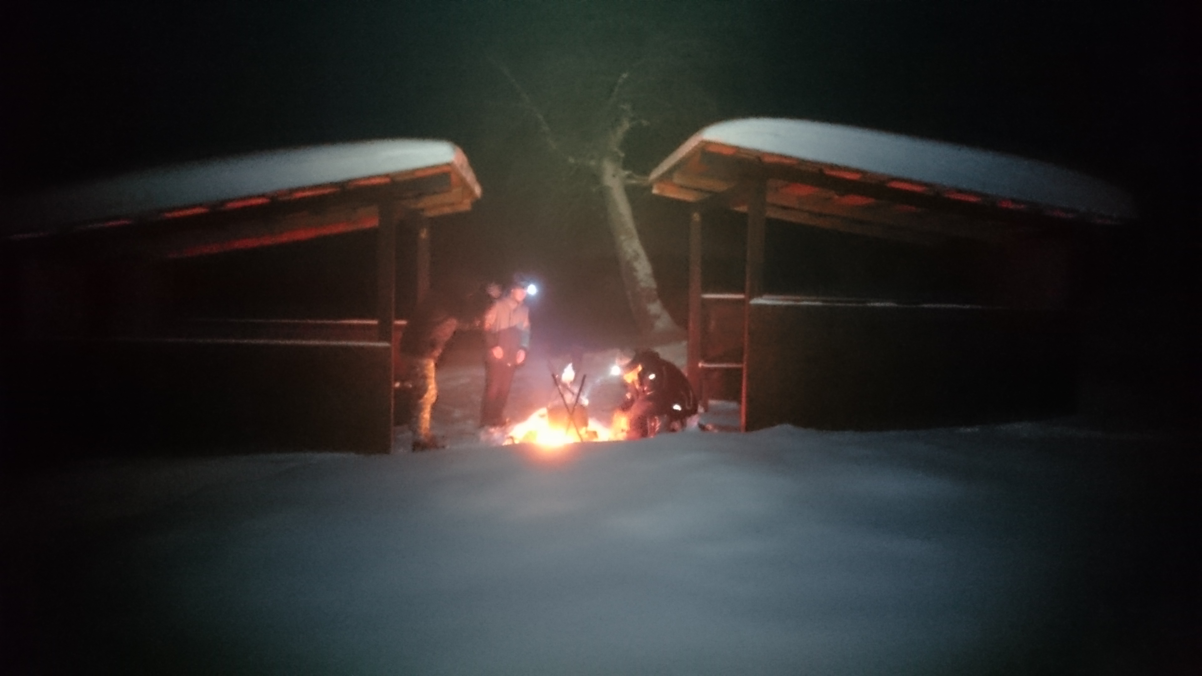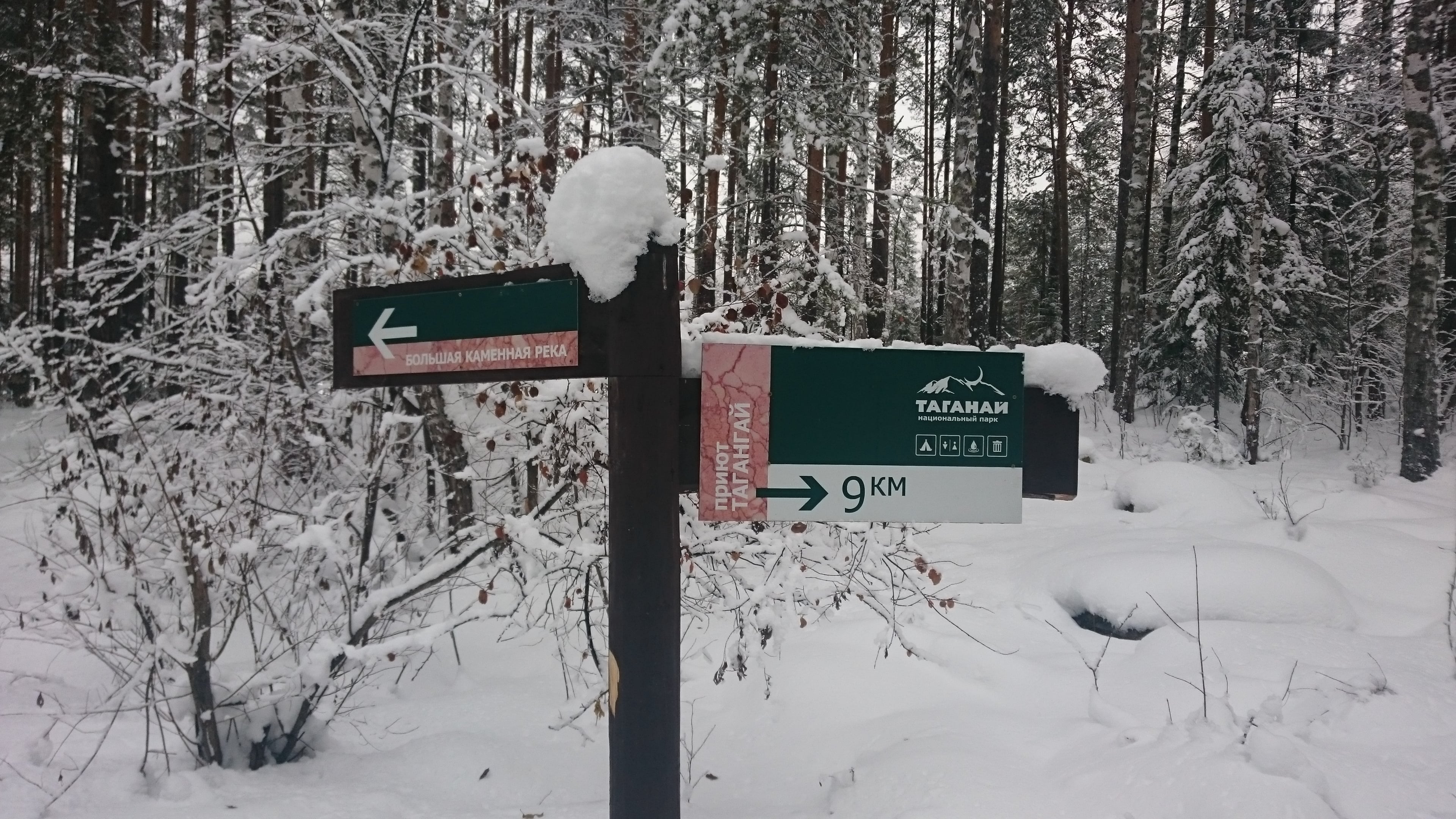 Мы вышли в 14.00 вполне себе бодро. Переход до кордона оказался легким, поэтому никто еще не чувствовал усталости. Однако, с каждым километром, пройденным по рыхлому снегу в гору, наш общий темп начал сильно замедляться. На развилке с указателем, заявляющим, что нам подниматься нужно еще 3 километра, я пала духом. Вскоре я подумала, что еще 2 шага и я сдохну. И точно через 2 шага у меня лопнула мозоль на ноге. Малодушно воспользовавшись этой возможностью сесть я очень методично и крайне неспешно осматривала место боевого ранения и наклеивала пластырь, но все равно не успела достаточно отдохнуть. Пришлось подниматься и толкать себя дальше.