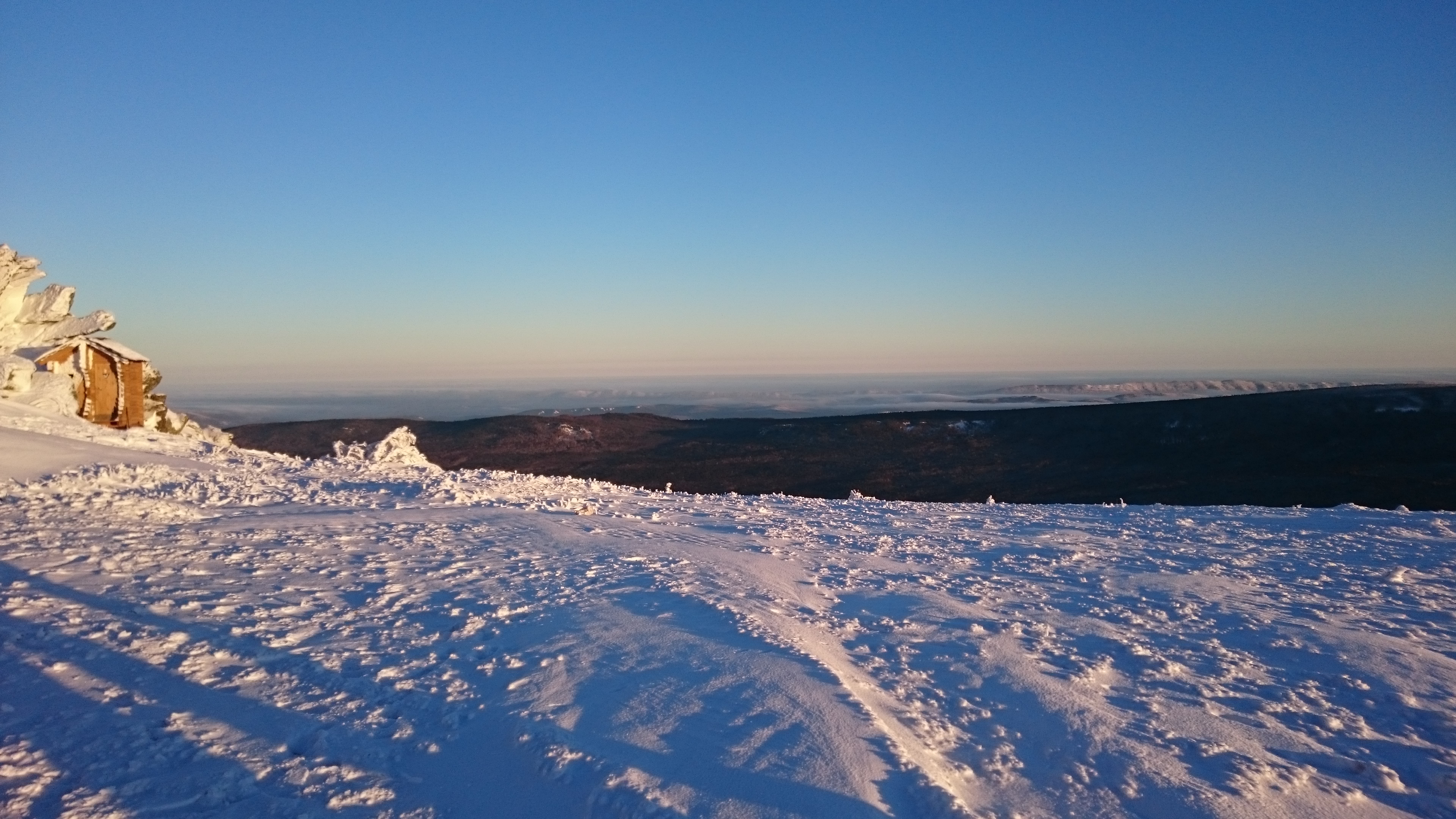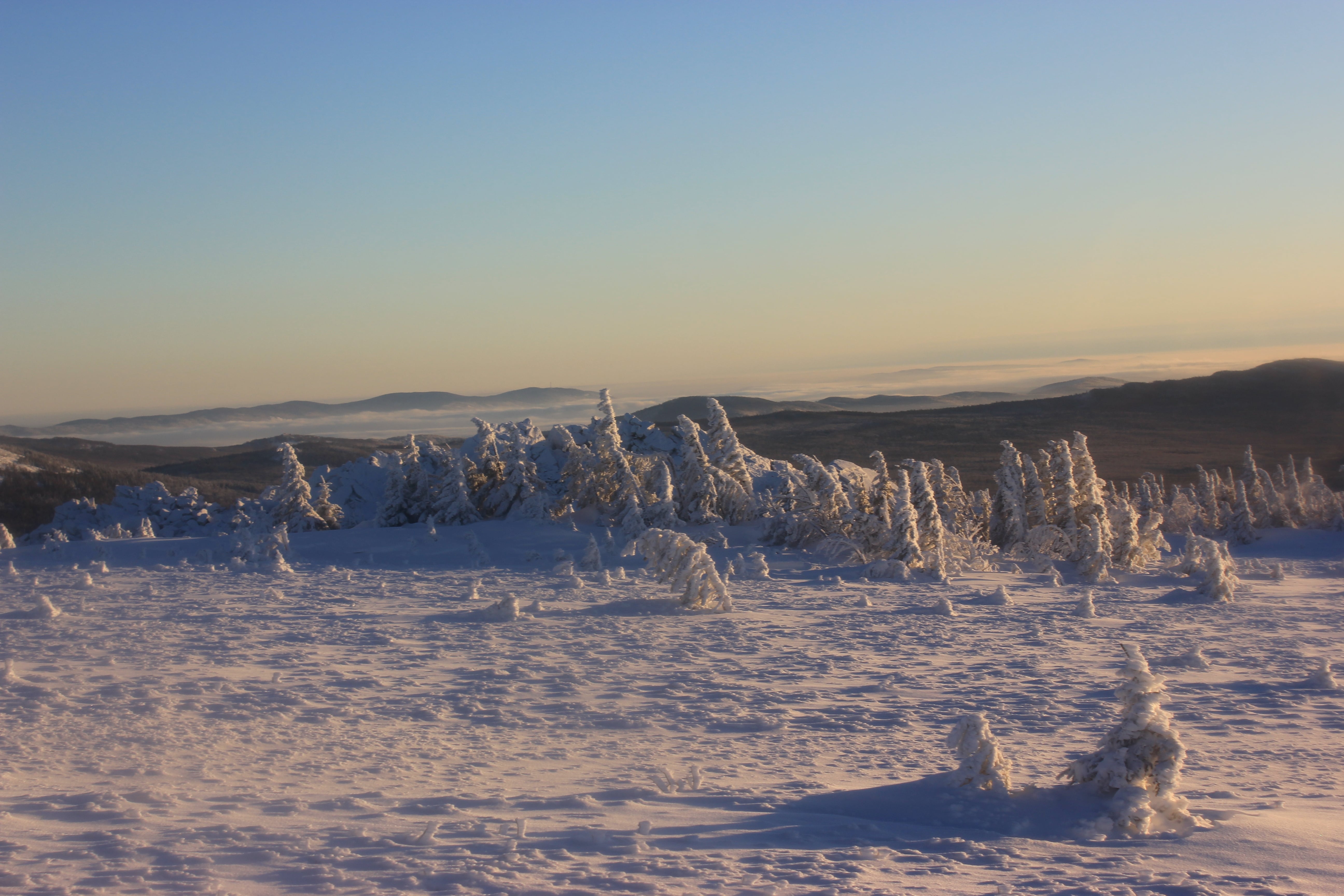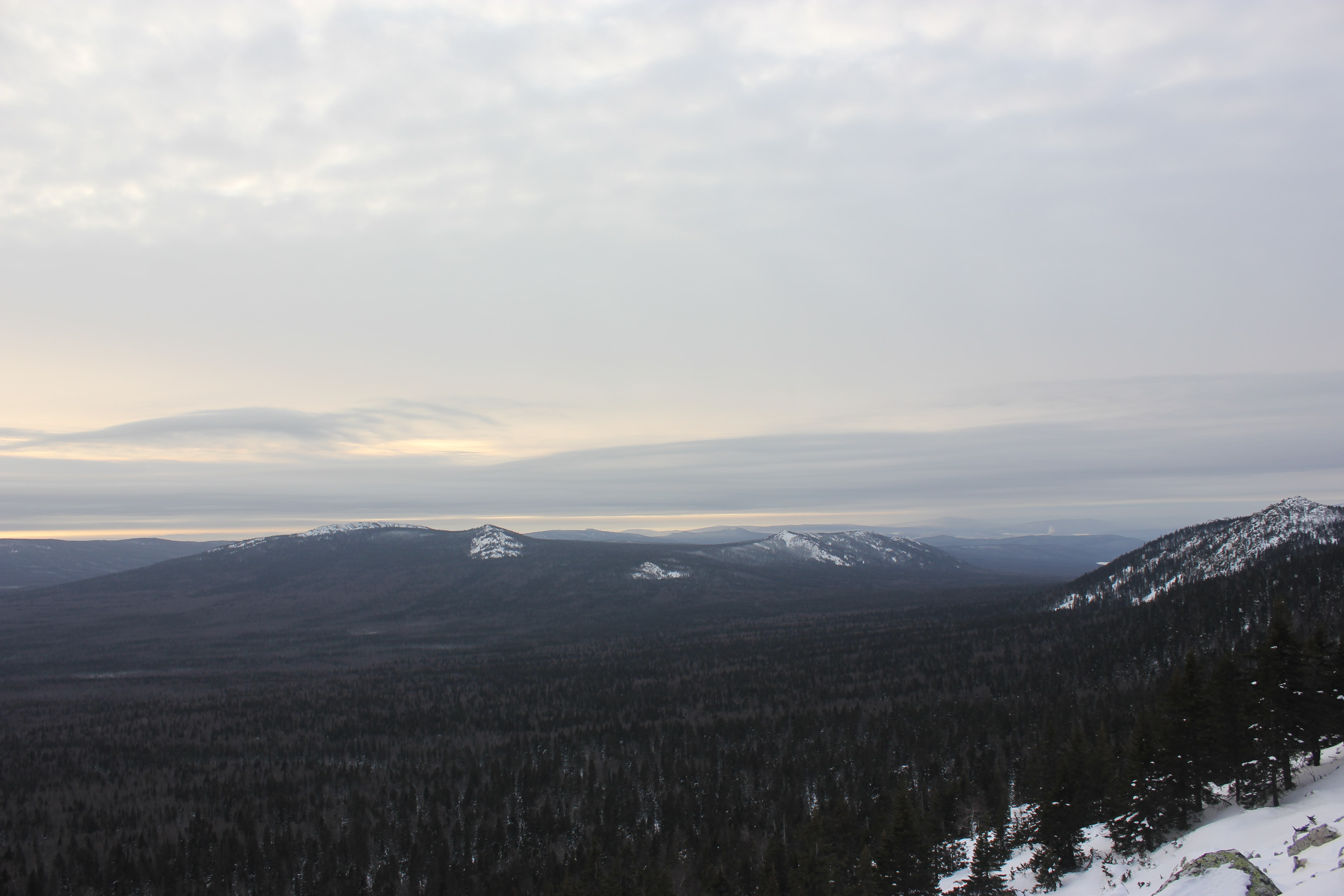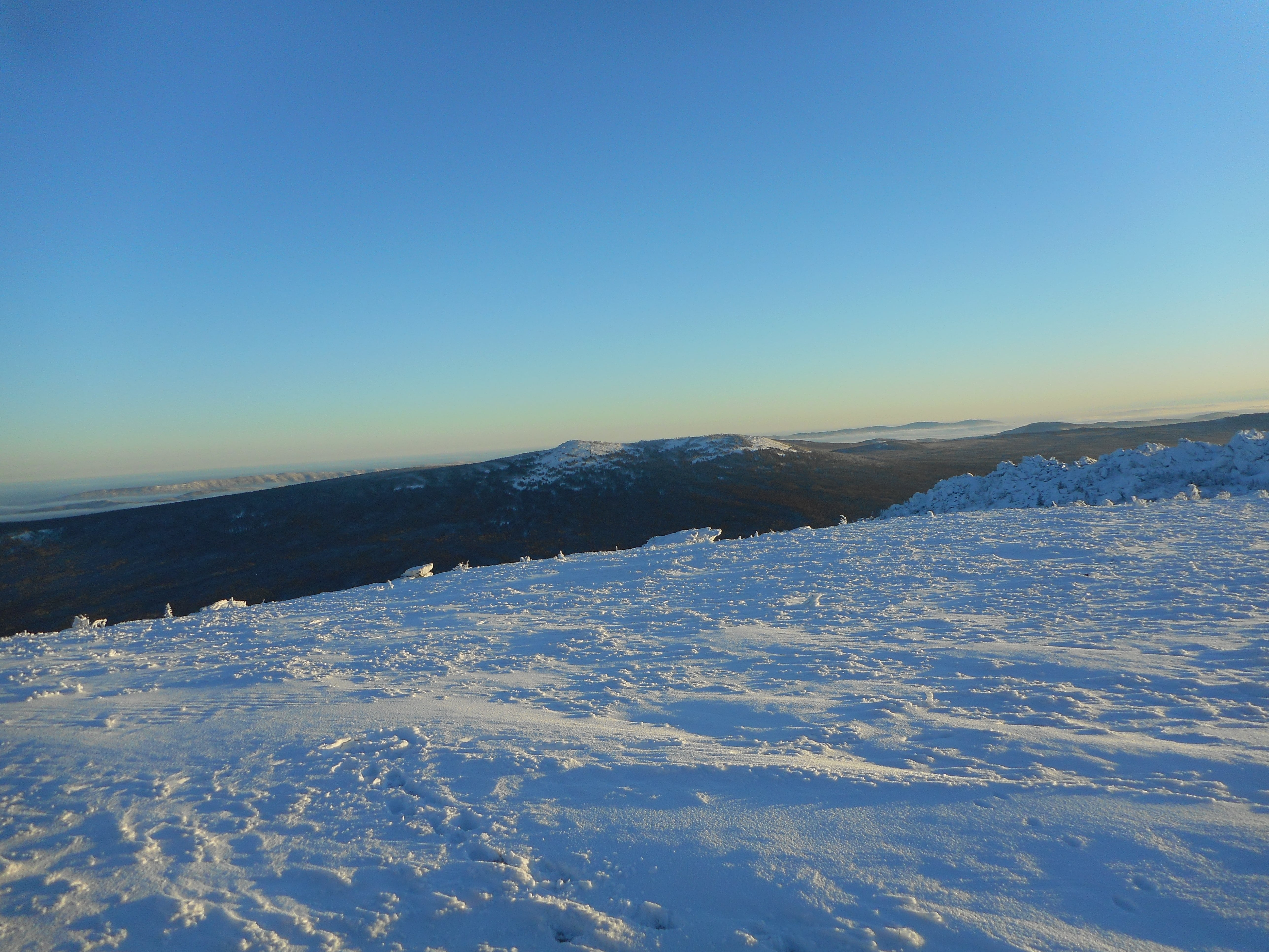 Но вид, скажу я вам, безусловно стоил труда. Мы стояли на продуваемой 4мя ветрами голой вершине на высоте 1114 метров, а перед нами лежали горные холмы – хребет Таганай, поросший седым от снега лесом, пустынный, слепящий, совершенно иной мир, дом ветров, укрытый ярко синим небом с холодным белым солнцем. “Таганай” в переводе с башкирского означает “подставка для Луны” и словно в подтверждение этого прямо перед нашими глазами, в приступе хвастовства и самолюбования, почти полная восходящая луна лежала в ложбине между вершинами.