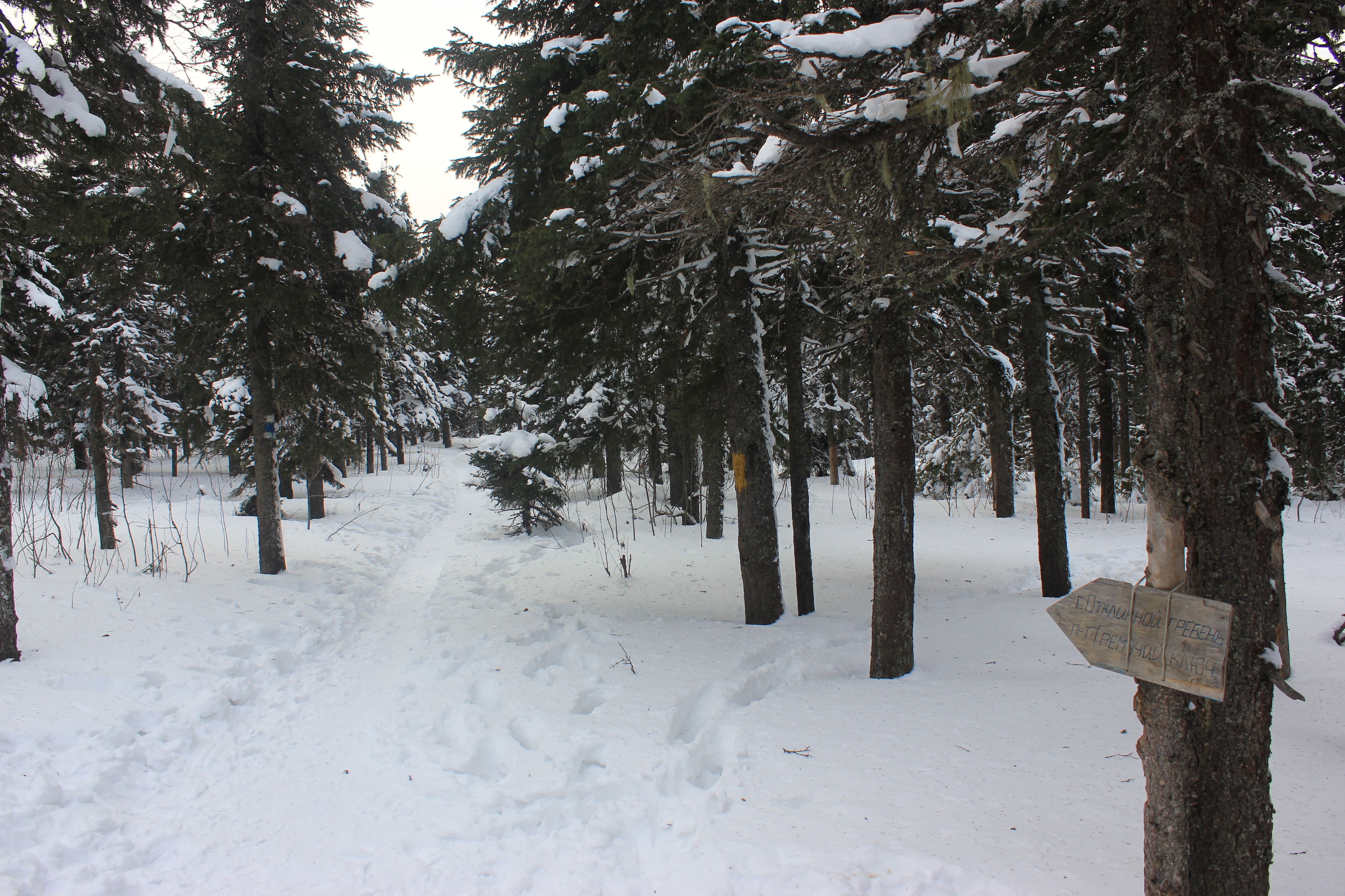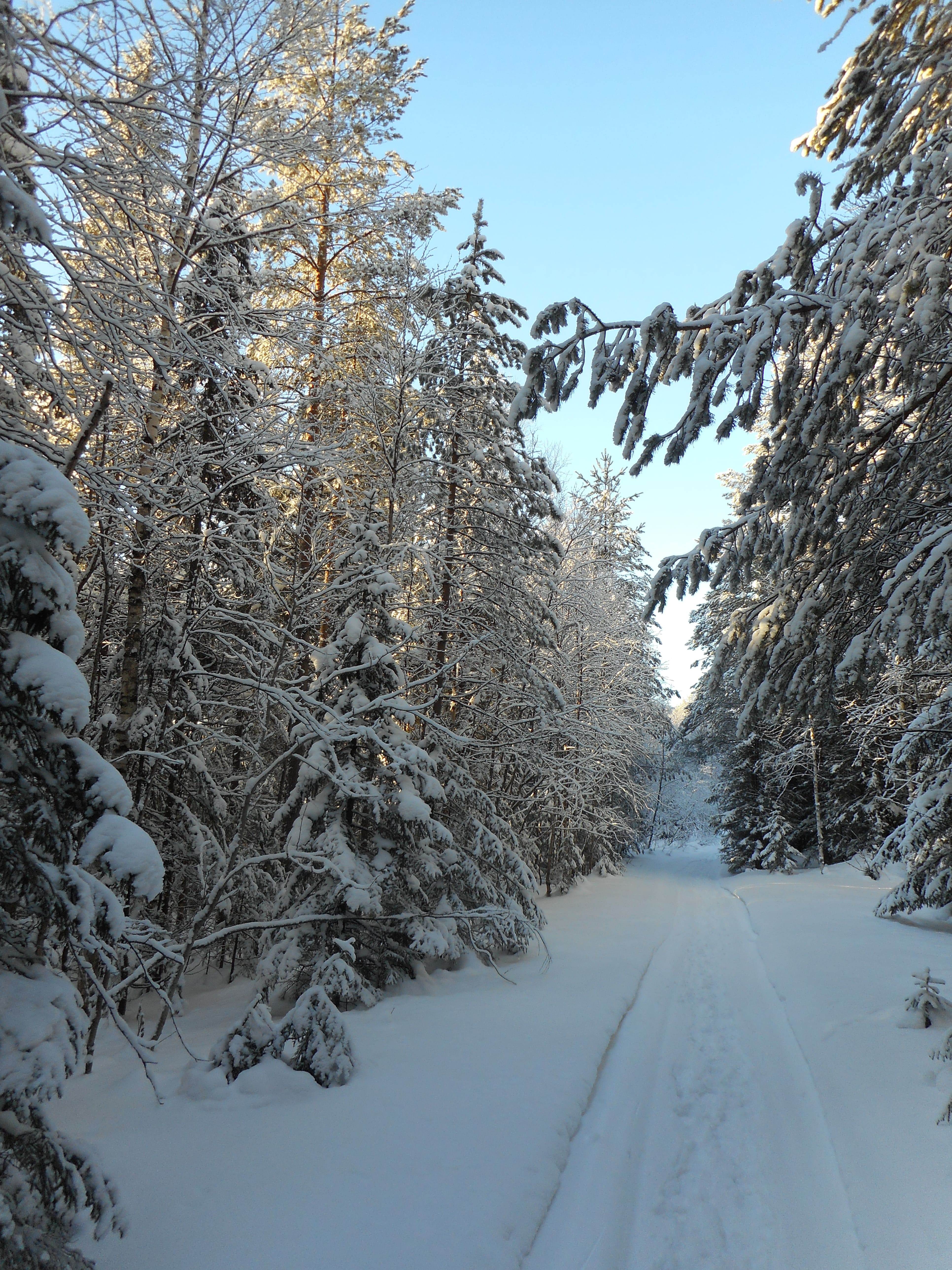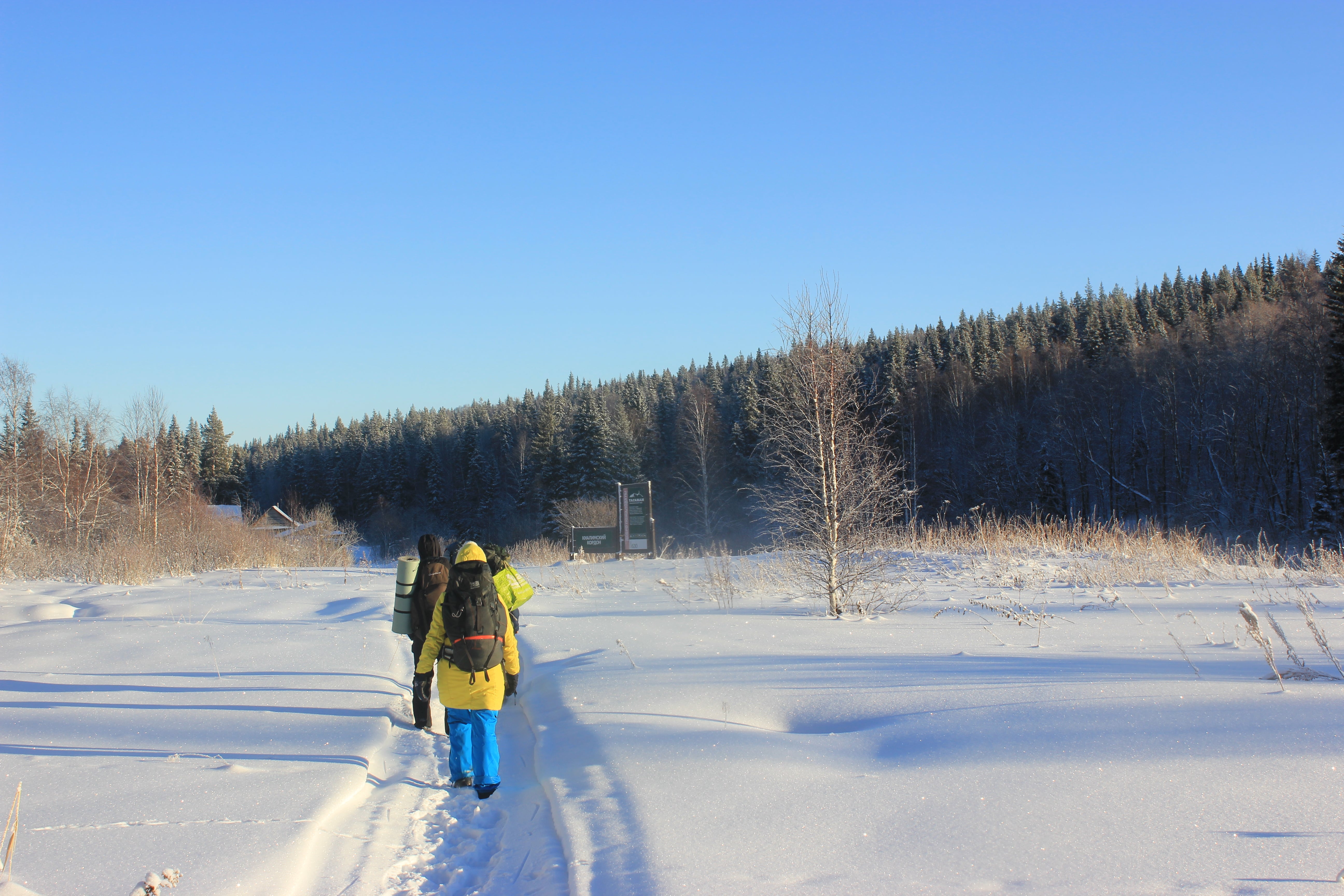 Около 9.30 утра, взвалив привычным движением свои пожитки на плечи, мы отправились в обратную дорогу под восходящее солнце. День обещал быть погожим, не смотря на легкий морозец в 13 градусов. Как ни странно, шлось мне легко: прямая широкая утрамбованная снегокатами дорога, на которой спокойно помещались 2 человека в ширину и тренированные 4мя предыдущими днями ноги, делали свое дело. Даже груз рюкзака уже не мог помешать мне наслаждаться прогулкой. Чуть ли не впервые за весь поход я смотрела по сторонам, любуясь красотами родных мне мест и даже болтала на ходу. Удивительно, как человеческое тело быстро приспосабливается ко всему.