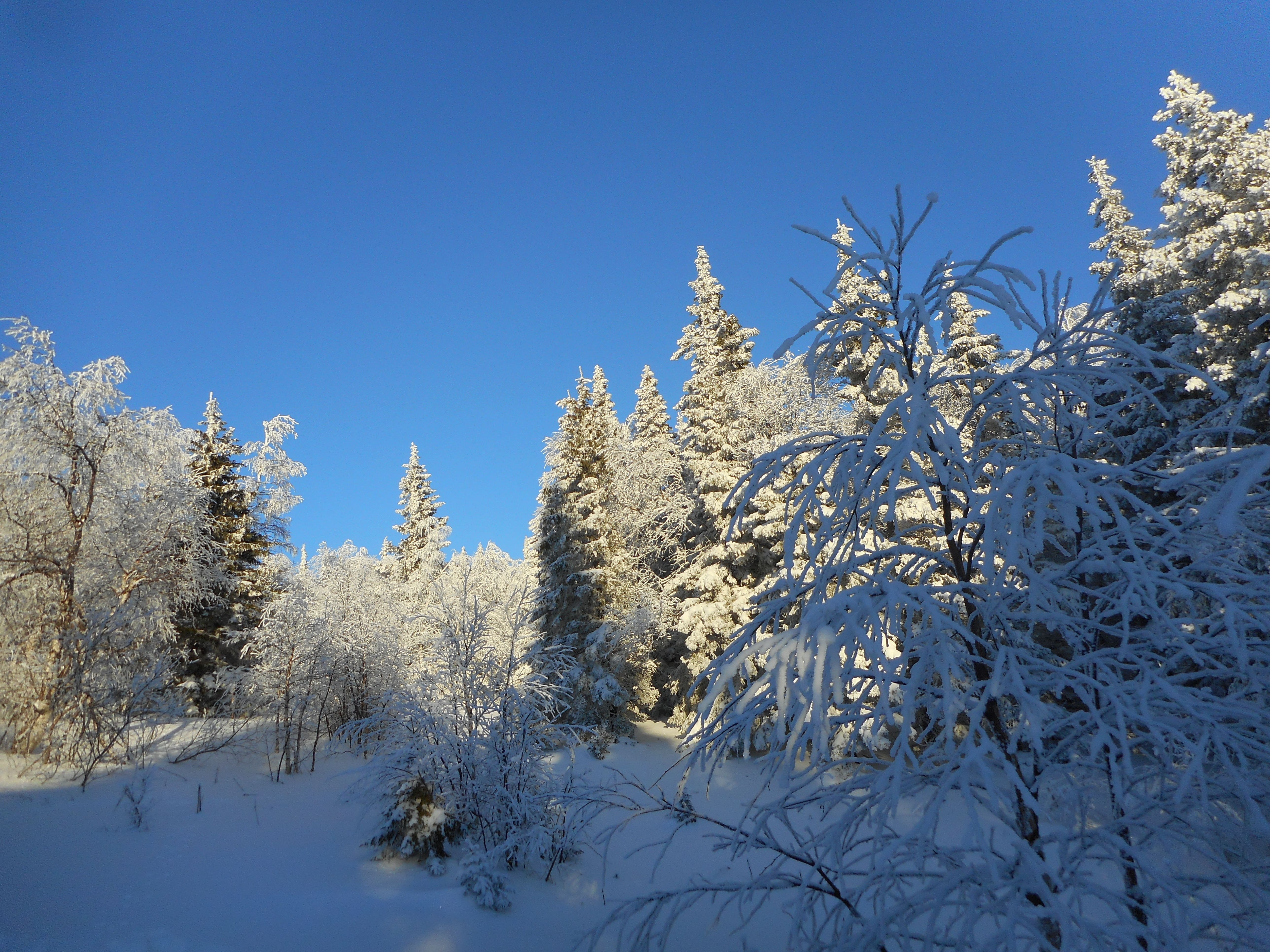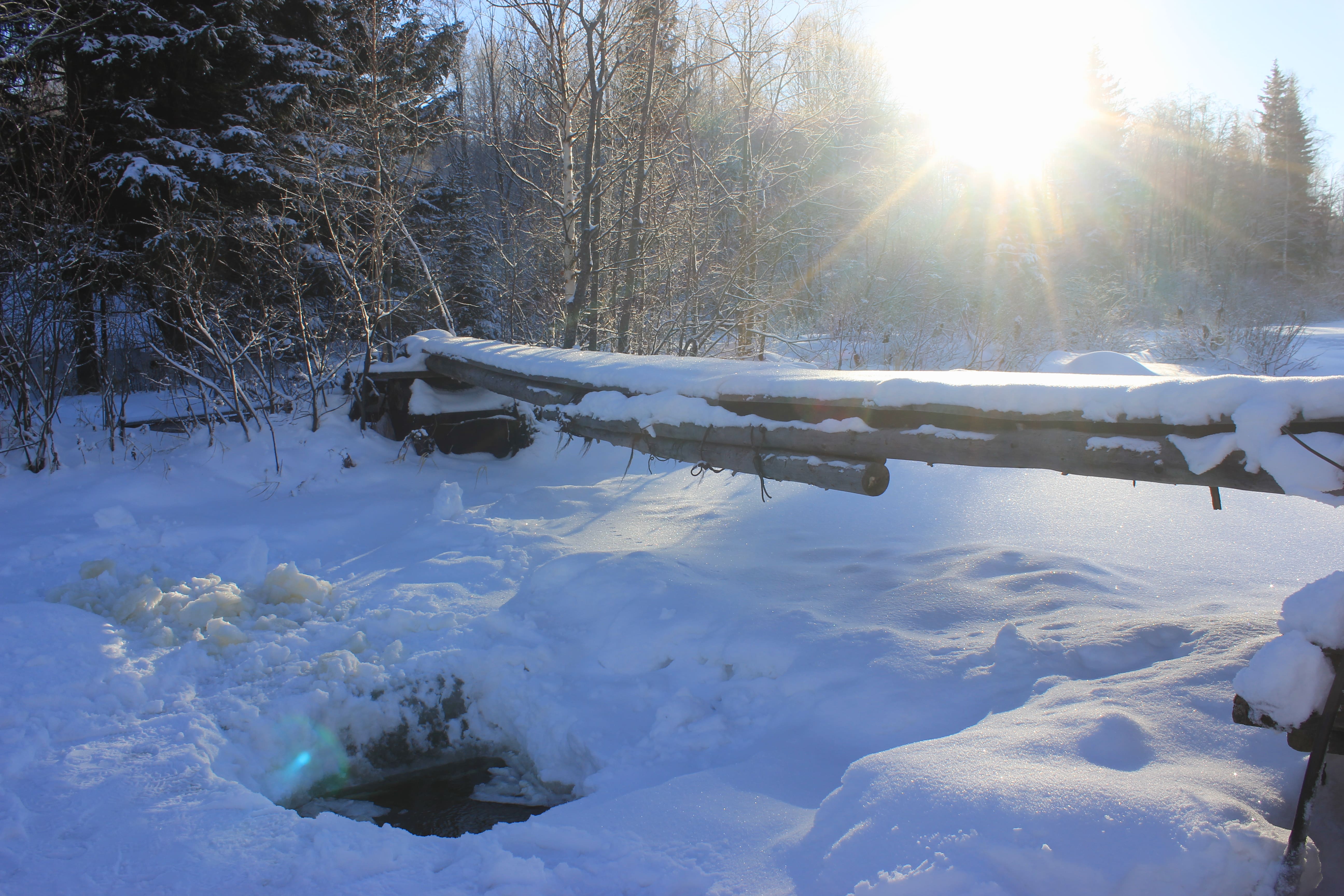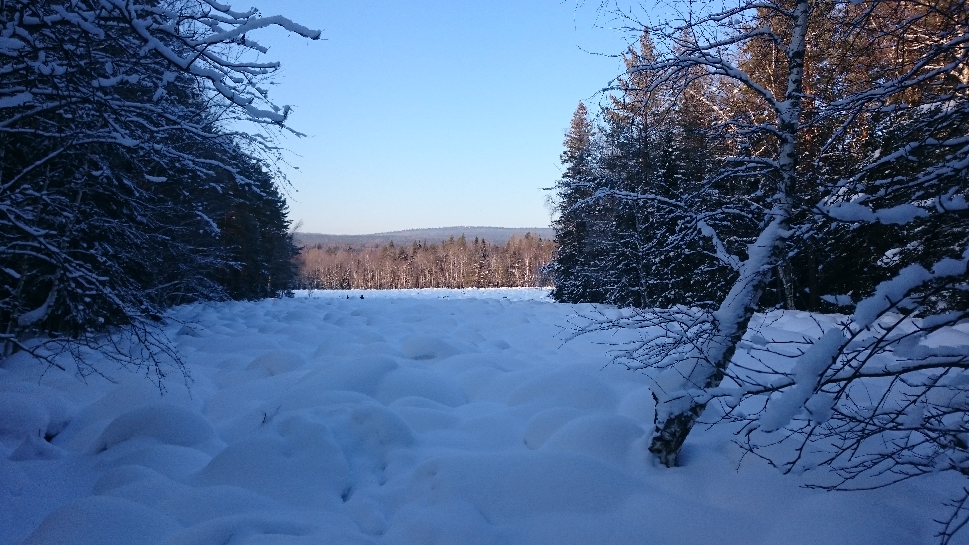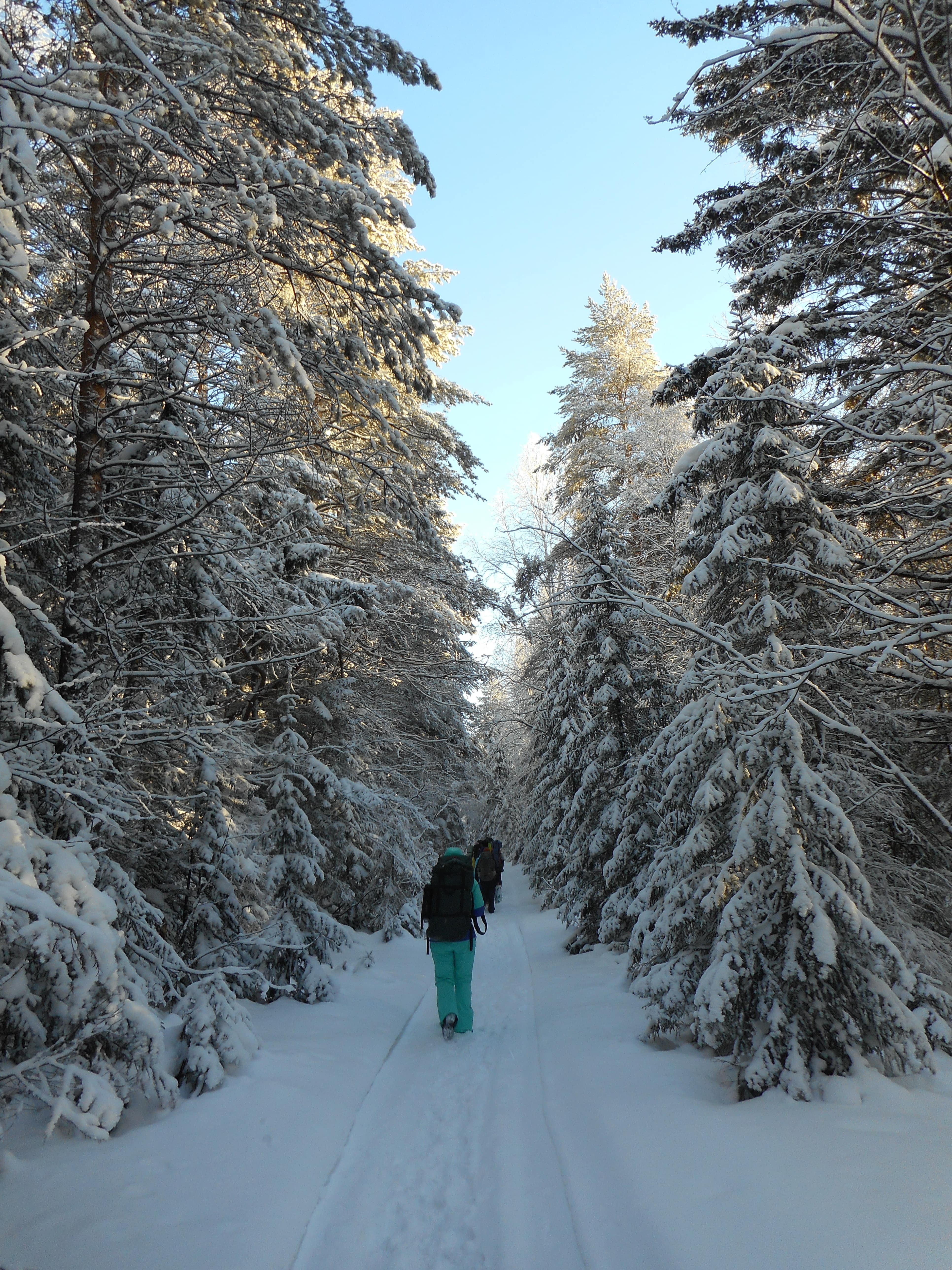 Около 9.30 утра, взвалив привычным движением свои пожитки на плечи, мы отправились в обратную дорогу под восходящее солнце. День обещал быть погожим, не смотря на легкий морозец в 13 градусов. Как ни странно, шлось мне легко: прямая широкая утрамбованная снегокатами дорога, на которой спокойно помещались 2 человека в ширину и тренированные 4мя предыдущими днями ноги, делали свое дело. Даже груз рюкзака уже не мог помешать мне наслаждаться прогулкой. Чуть ли не впервые за весь поход я смотрела по сторонам, любуясь красотами родных мне мест и даже болтала на ходу. Удивительно, как человеческое тело быстро приспосабливается ко всему.