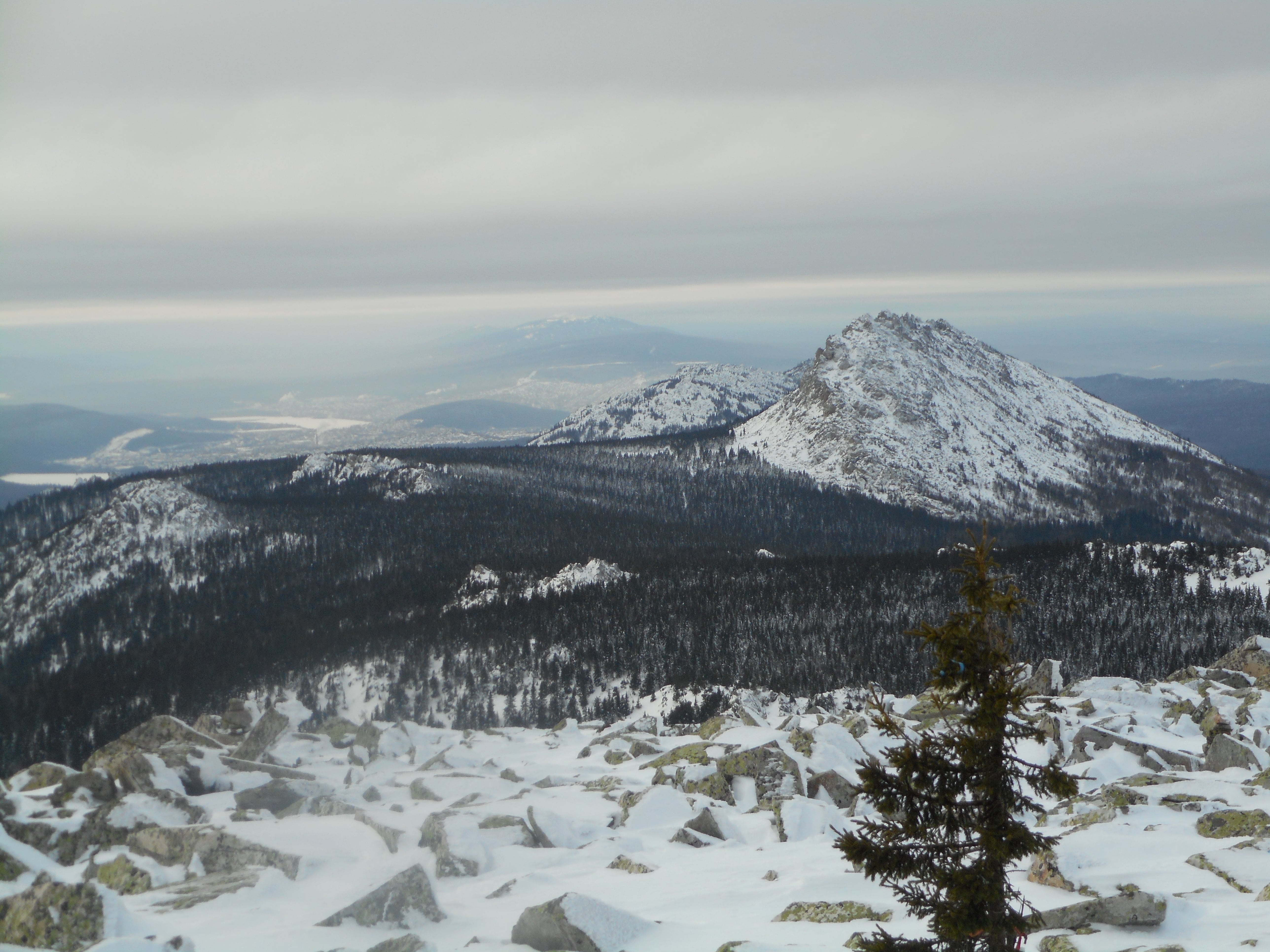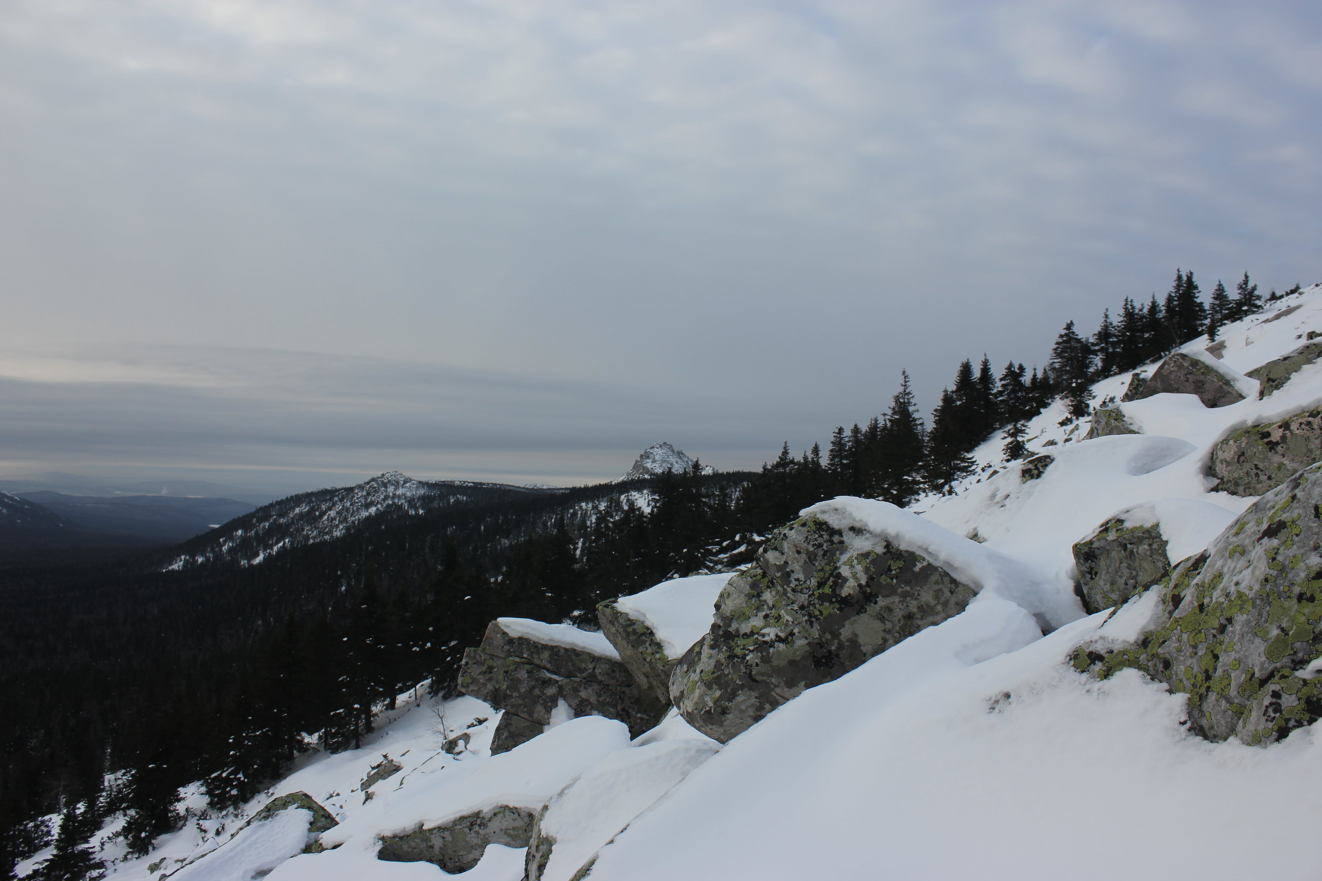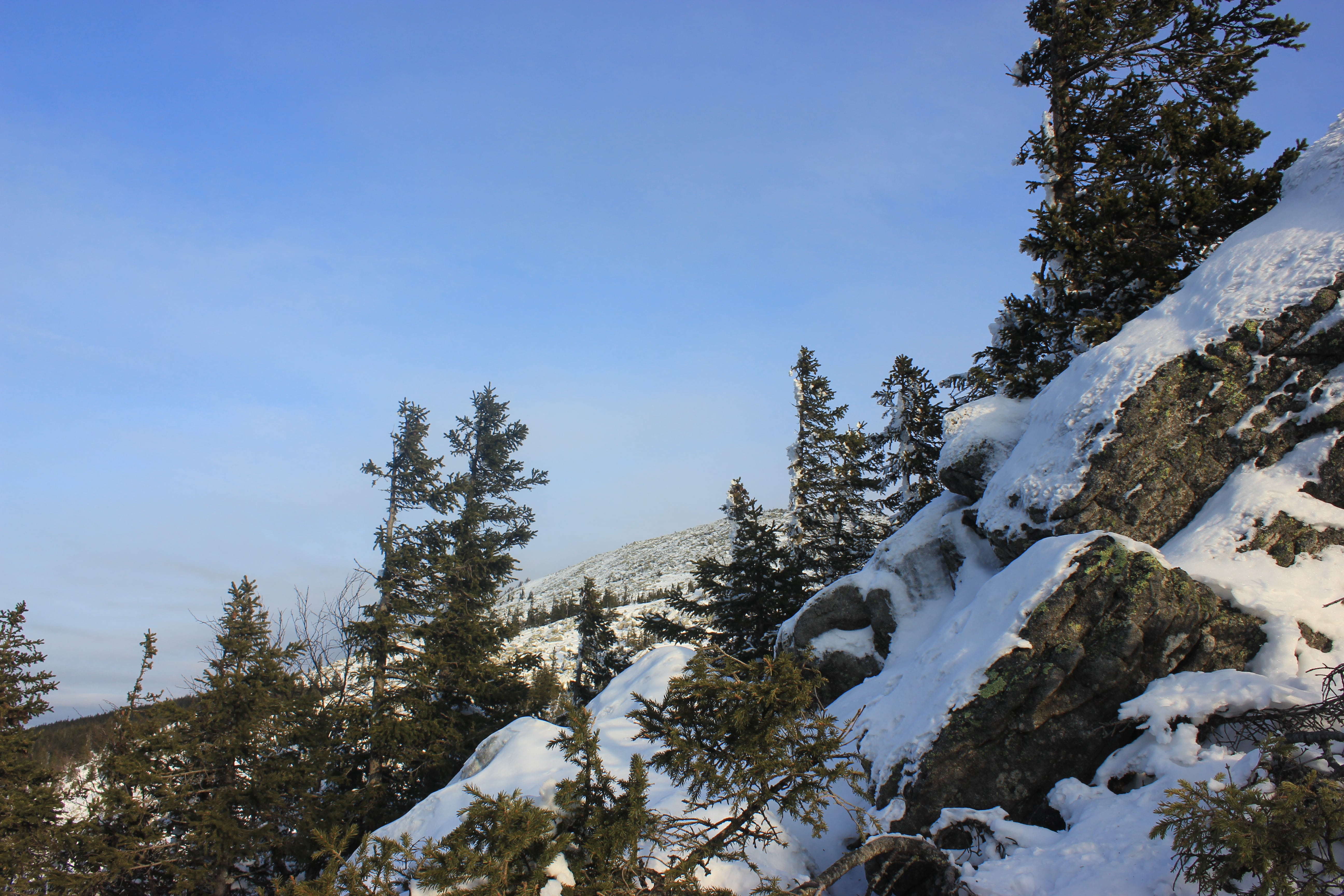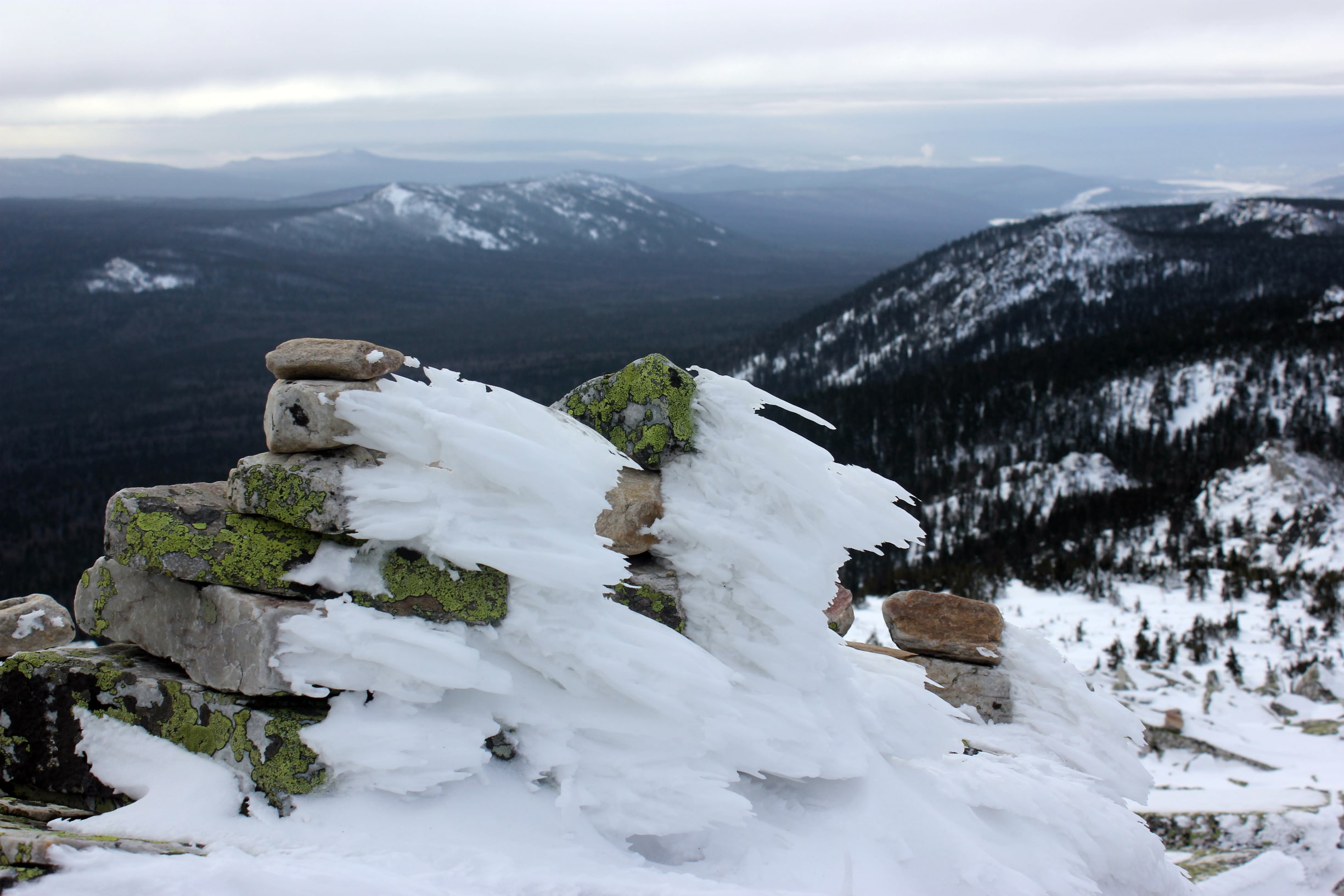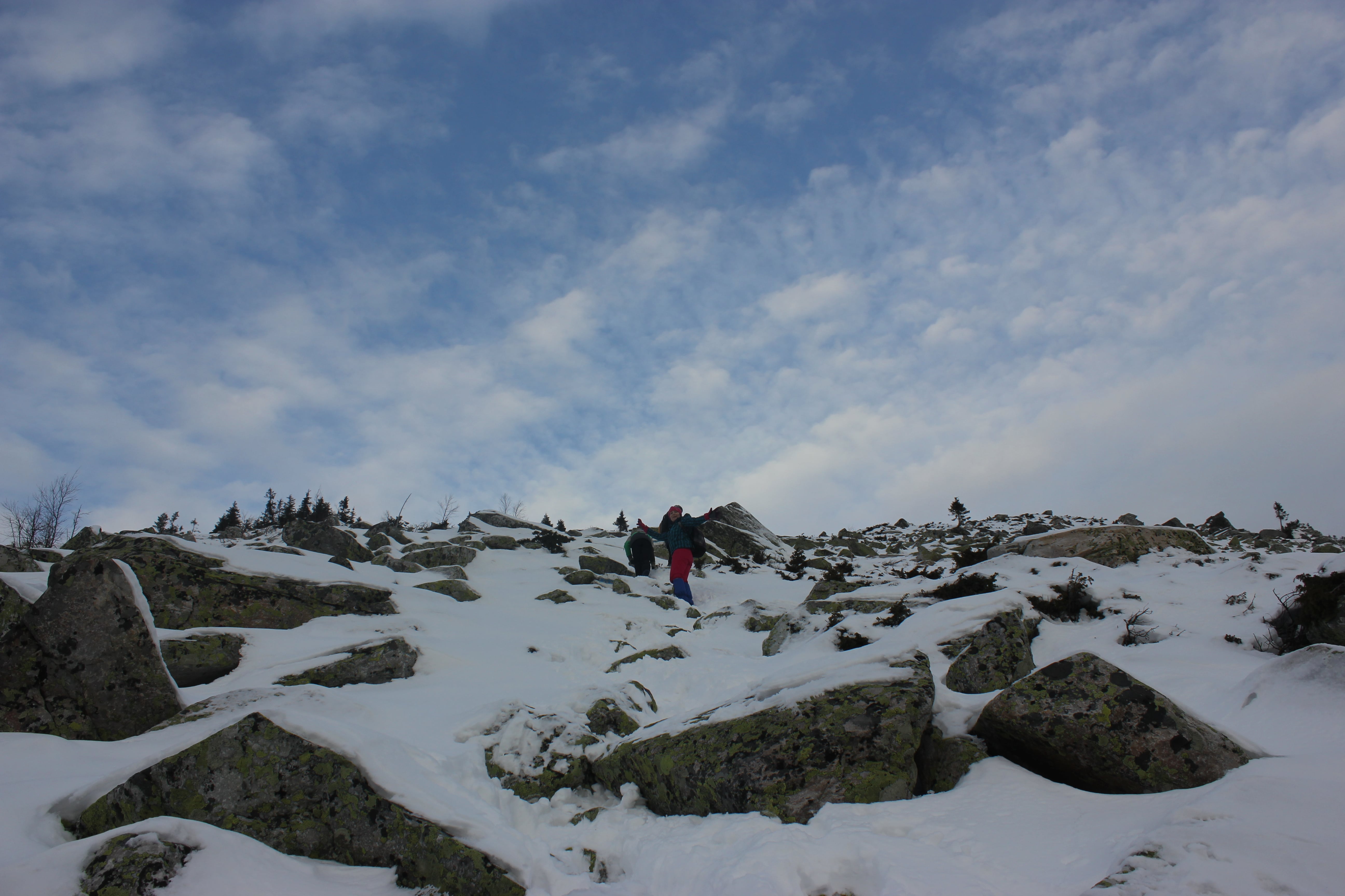 Тем не менее, как раз за этим мы сюда и пришли. Мы начали подъем, аккуратно ступая на припорошенные сугробами камни. Взбираться нужно было осторожно, потому что то тут, то там, между камнями оказывались глубокие щели, в которые легко проваливалась нога до самого пояса. Через несколько минут такого взбирания, я сдалась и встала на четвереньки. Оказалось, что карабкаться вверх на 4х конечностях намного удобнее и быстрее. Время от времени, чтобы понять куда и сколько еще ползти, я останавливалась и, оглядываясь вокруг, не верила глазам. Передо мной расстилались леса, а подо мной под снегом оставалась россыпь курумника, на которую я (сама!) только что взобралась. Вот так, сосредотачиваясь глазами, ногами и мыслями только на ближайших 2х шагах, оказывается можно совершить то, во что ты не мог даже поверить. Искусство маленьких шагов в действии!