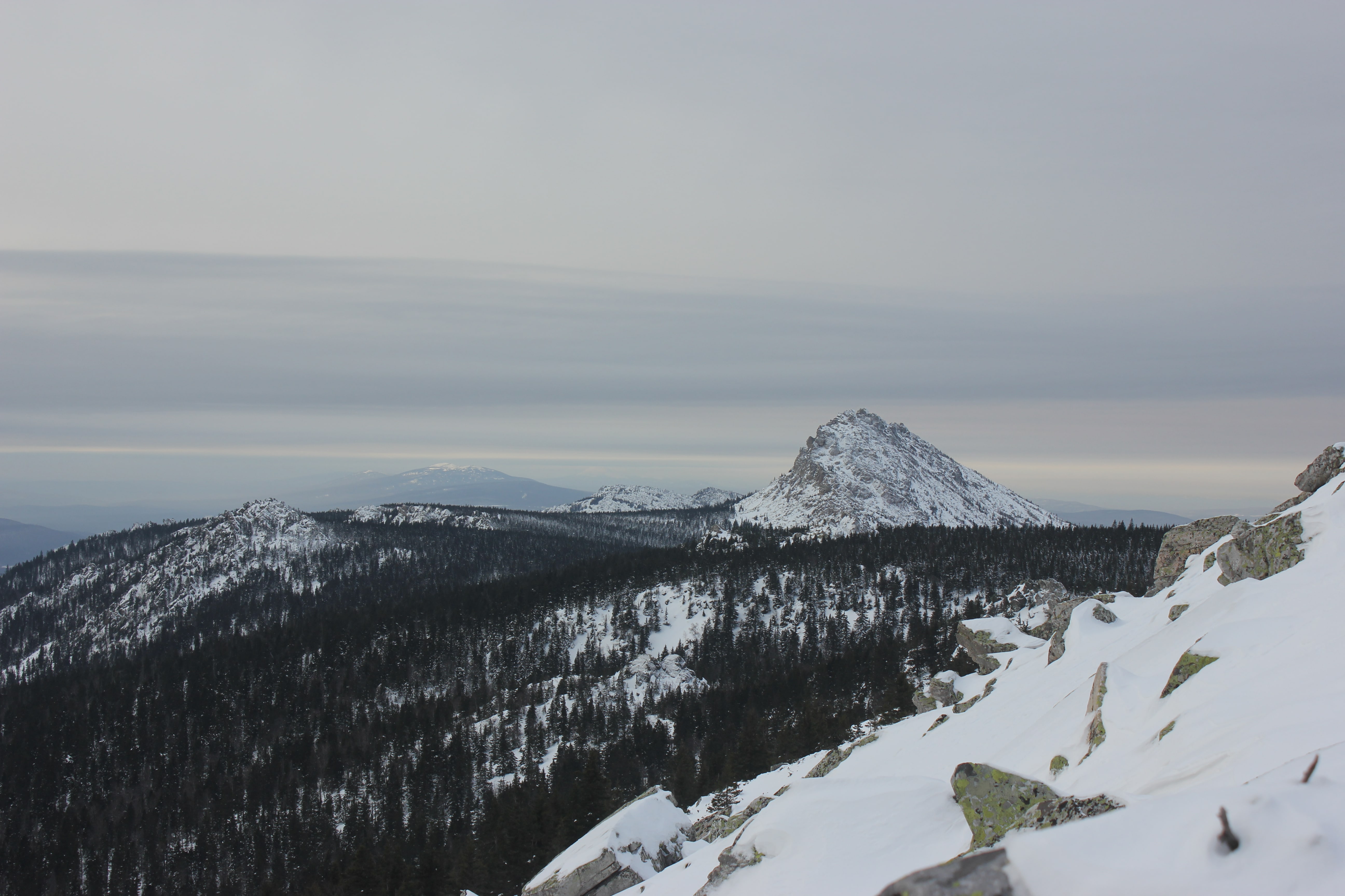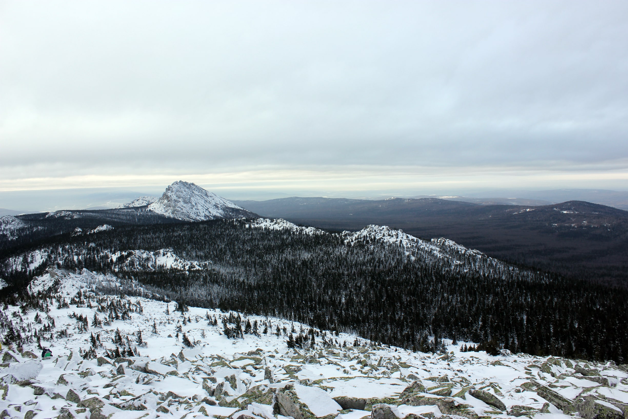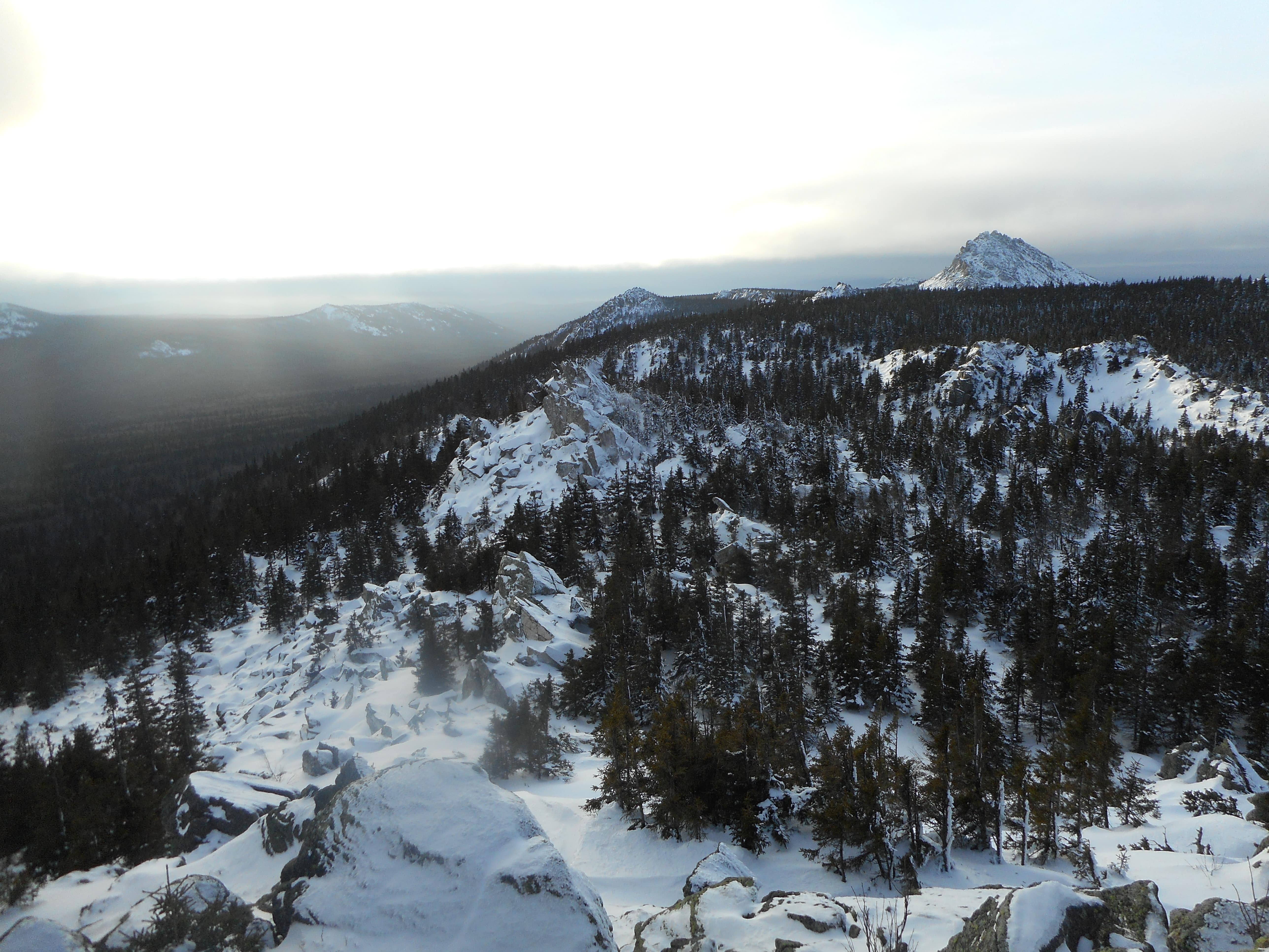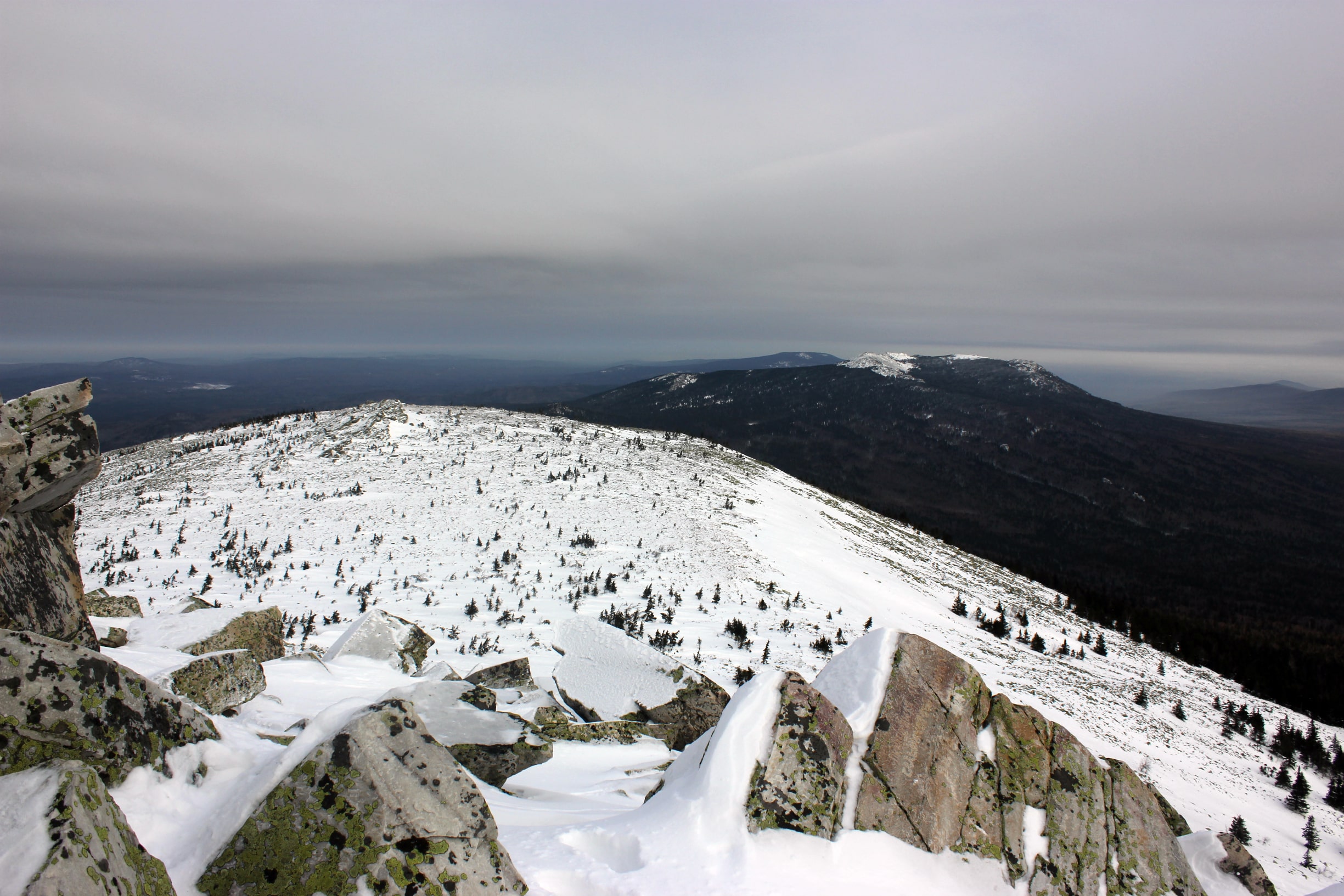 Заползши наконец на самый верх мы увидели Таганай во всей красе. Солнца не было и это было жалко, но зато и ветра не было тоже, а облака лишь усиливали впечатление высоты, как будто мы взобрались под крышу мира и вот-вот упремся макушками в небесный свод. Мы стояли на вершине, между белым небом и белой землей и смотрели на вздымающиеся в разных направлениях гребни могучих гор, ища глазами Метеостанцию, Откликной гребень, приют Таганай, Киалимский кордон и даже город Златоуст.