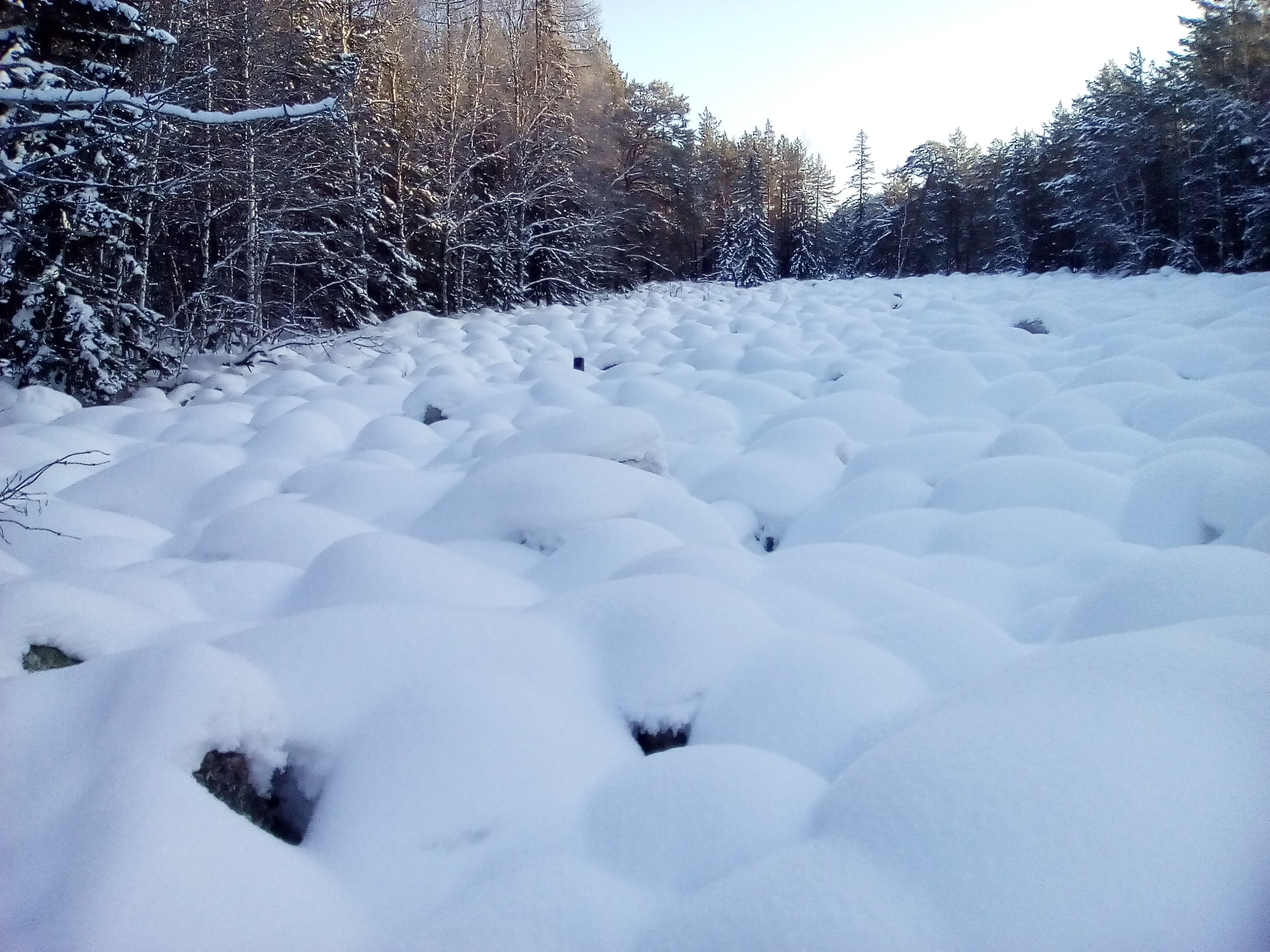 В 12.40 мы выстроились гуськом и вслед за гидом вышли на Нижнюю Тропу (хорошо, что не войны). Москвичи, как дети радовались снегу в частности и зиме вообще (природа в этом году обделила их зимой). И надо сказать вполне справедливо – погода нас действительно приятно радовала. Все вокруг было просто сказочно красивым: чистейший хрустящий снег вокруг и всюду, густо укрытые снежным одеялом кусты, искрящиеся морозные кружева на деревьях, белые снежные лапы на огромных елях, и вся эта красота при температуре всего около 4-6 градусов ниже нуля, от которых имелось приятное охлаждение и красивый пар изо рта. Поход обещал быть замечательным. Тем более, что уже по пути на первую стоянку мы пришли к Каменной Реке. Которая выглядела в точности как каменная река, то есть река, в которой вместо воды большие камни и булыжники, которые сейчас были покрыты толстыми сугробами, от чего курумник напоминал гигантский пирог “дружная семейка” щедро посыпанный сахарной пудрой.