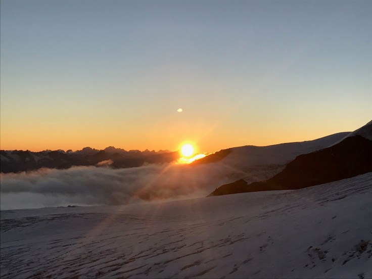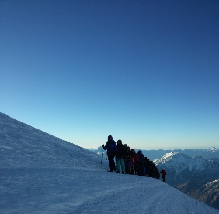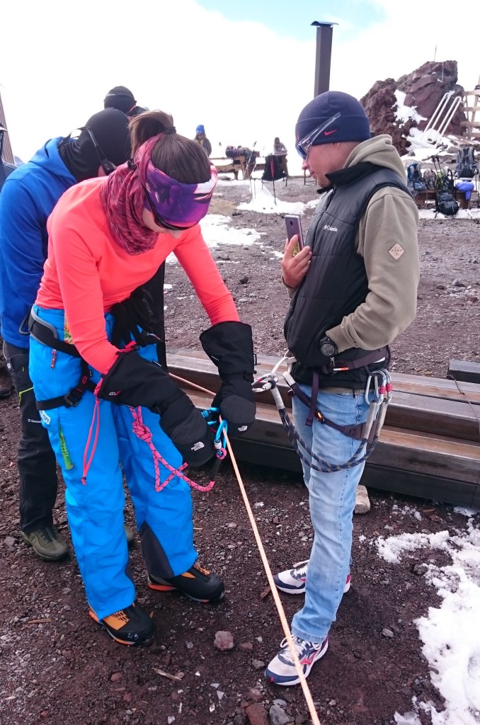 Кстати, я ни разу, ни на секунду не пожалела, что надела все в точности как сказали гиды. Форма одежды на выход была: термобелье (полный комплект), горнолыжные штаны, ходовые теплые носки, горные ботинки, тонкая флисовая кофта, горнолыжная куртка, большая пуховая куртка сверху, баффы на голове и шее, легкие шерстяные ходовые перчатки. В рюкзаке лежали на всякий случай еще и толстая флисовая кофта, пуховый жилет, ветровка, толстые рукавицы-верхонки. Дополняли экипировку: надетое “железо” (система-беседка, самостраховка, кошки), в руках были две треккинговые палки (одна из которых заменялась на ледоруб в процессе восхождения), горнолыжная маска на лице. В рюкзаке тем временем лежали: бутылка воды, еда (пара батончиков, сушеное мясо), горные очки с 4 степенью защиты, крем от загара (чтобы обновлять его на стоянках) и аптечка. В боковой карман рюкзака для удобства доставания был посажен термос с чаем, а сзади снаружи был прикреплен ледоруб. При этом лицо, уши и кисти рук были намазаны сильным кремом от загара (защита не меньше 50).