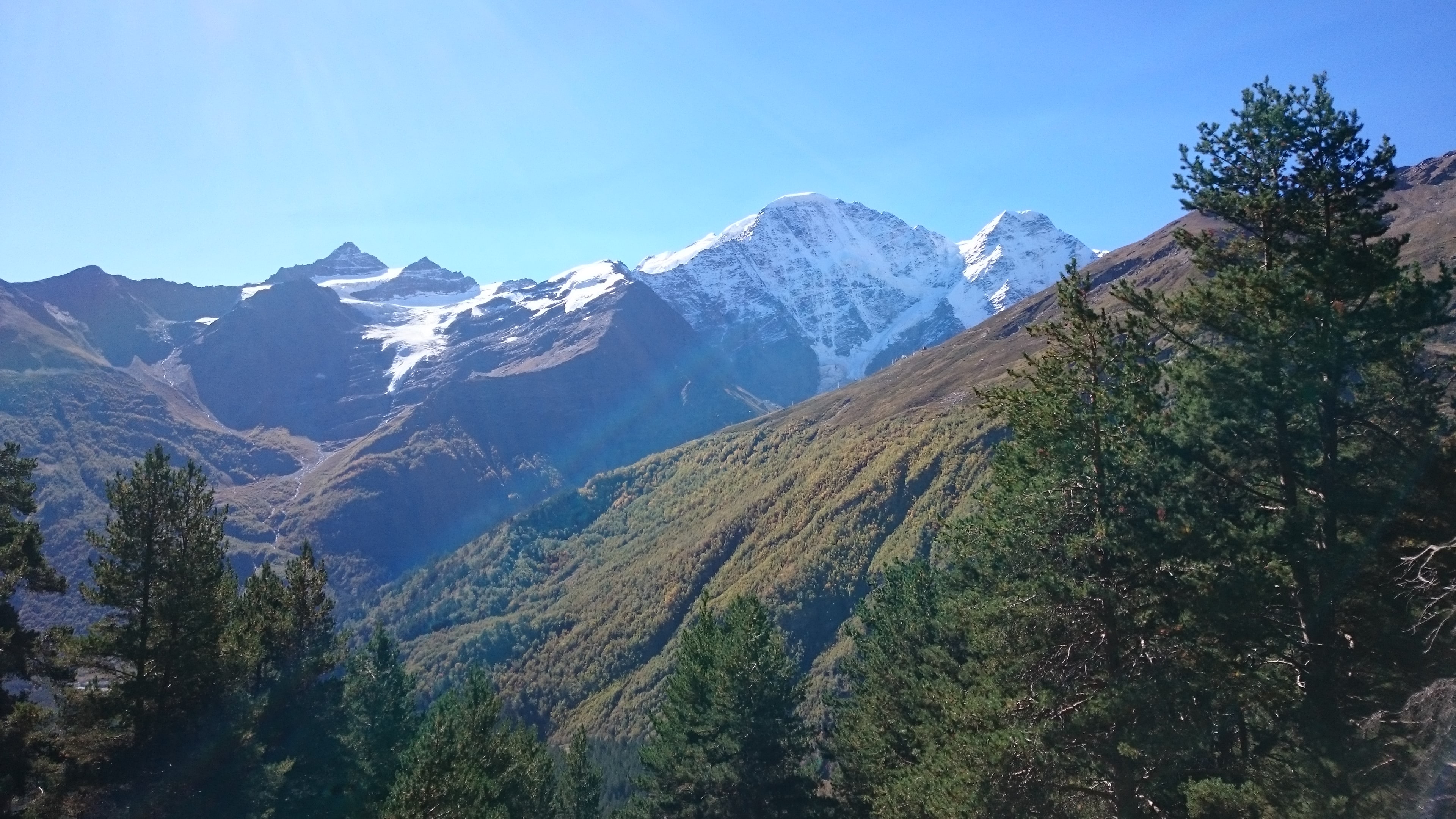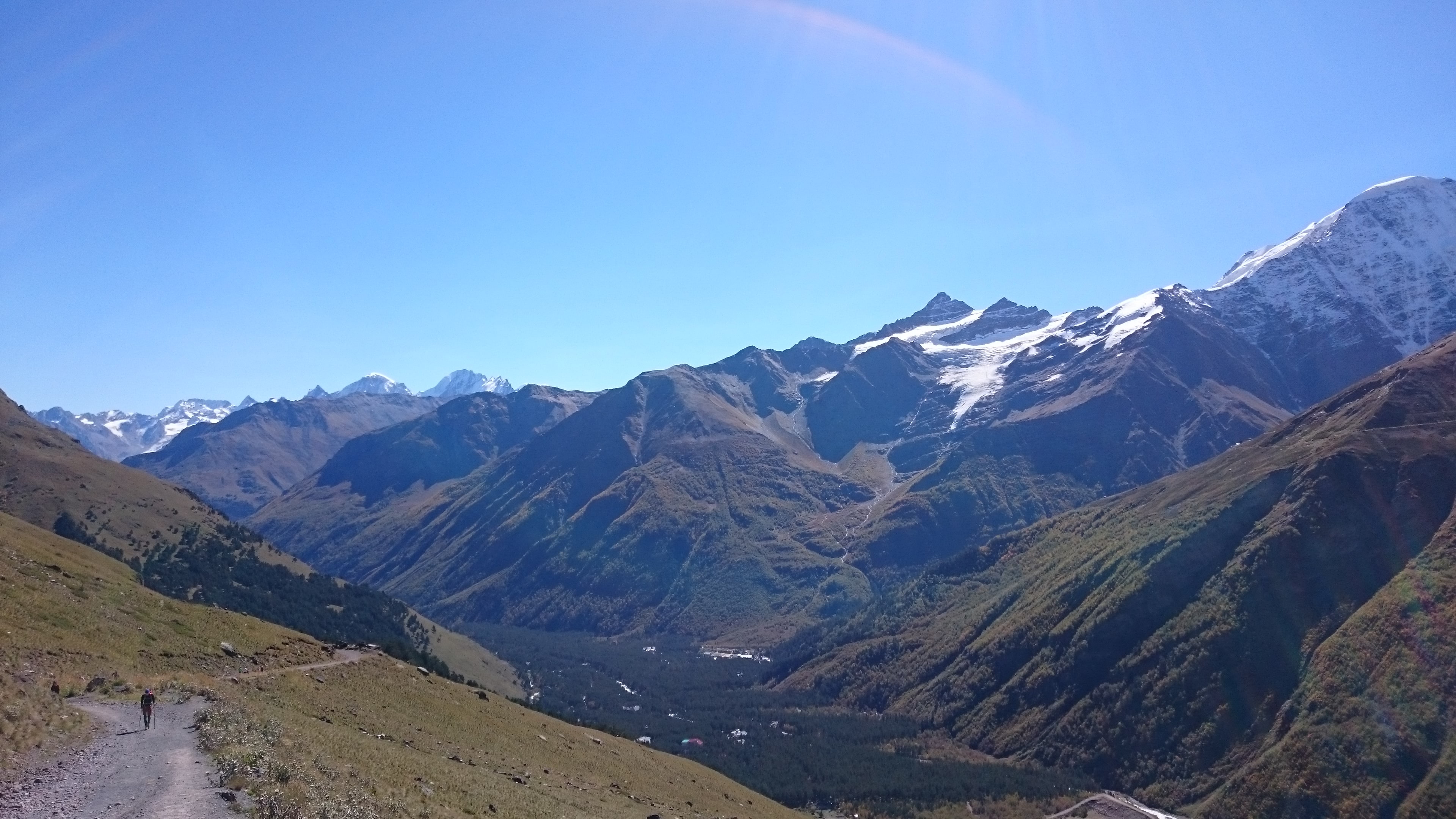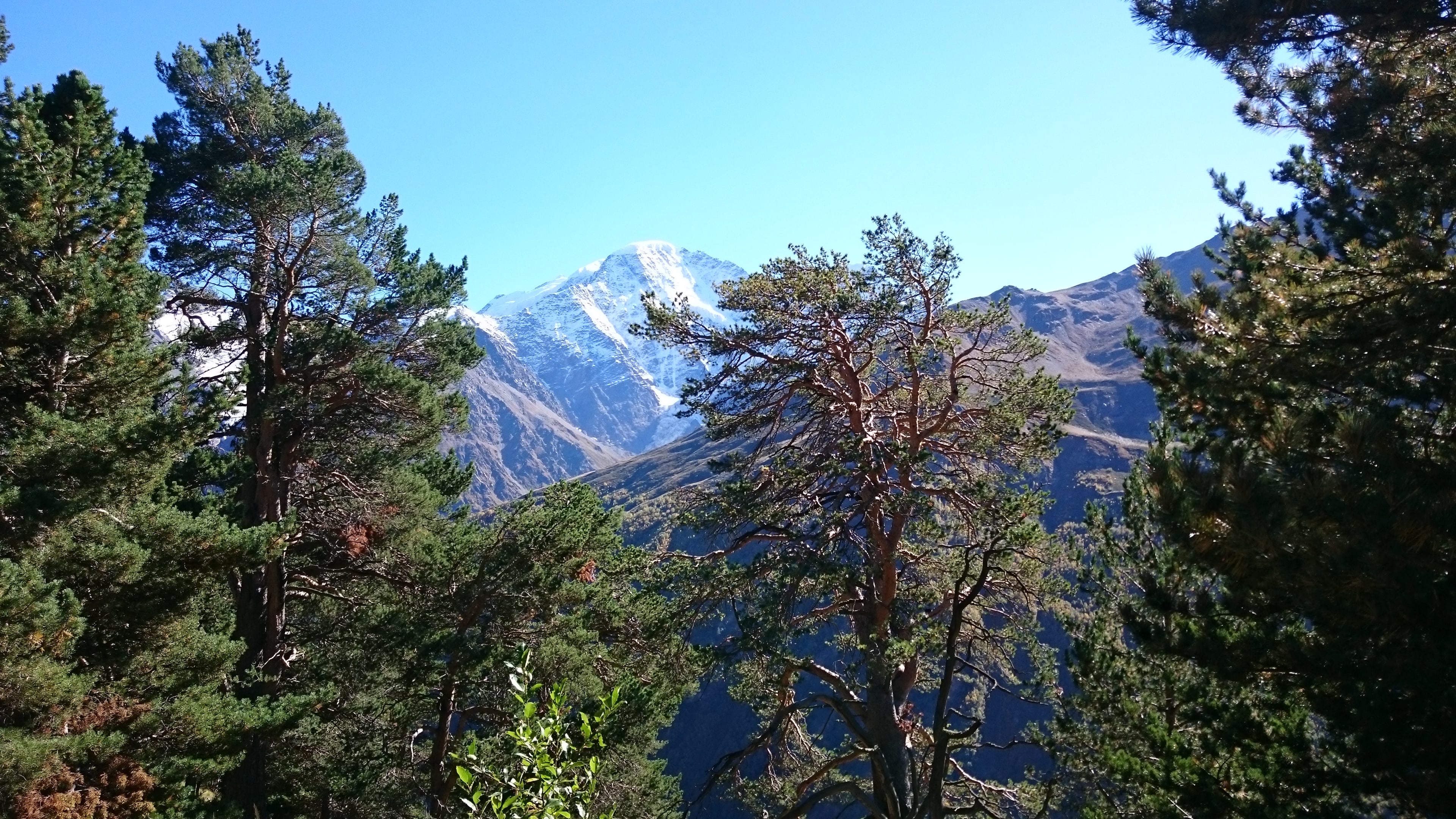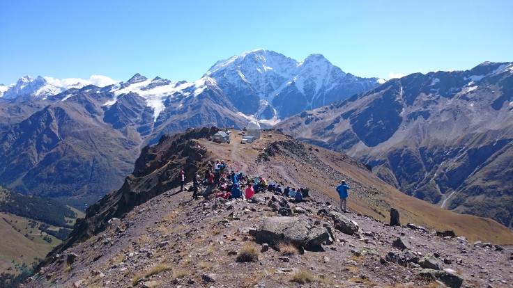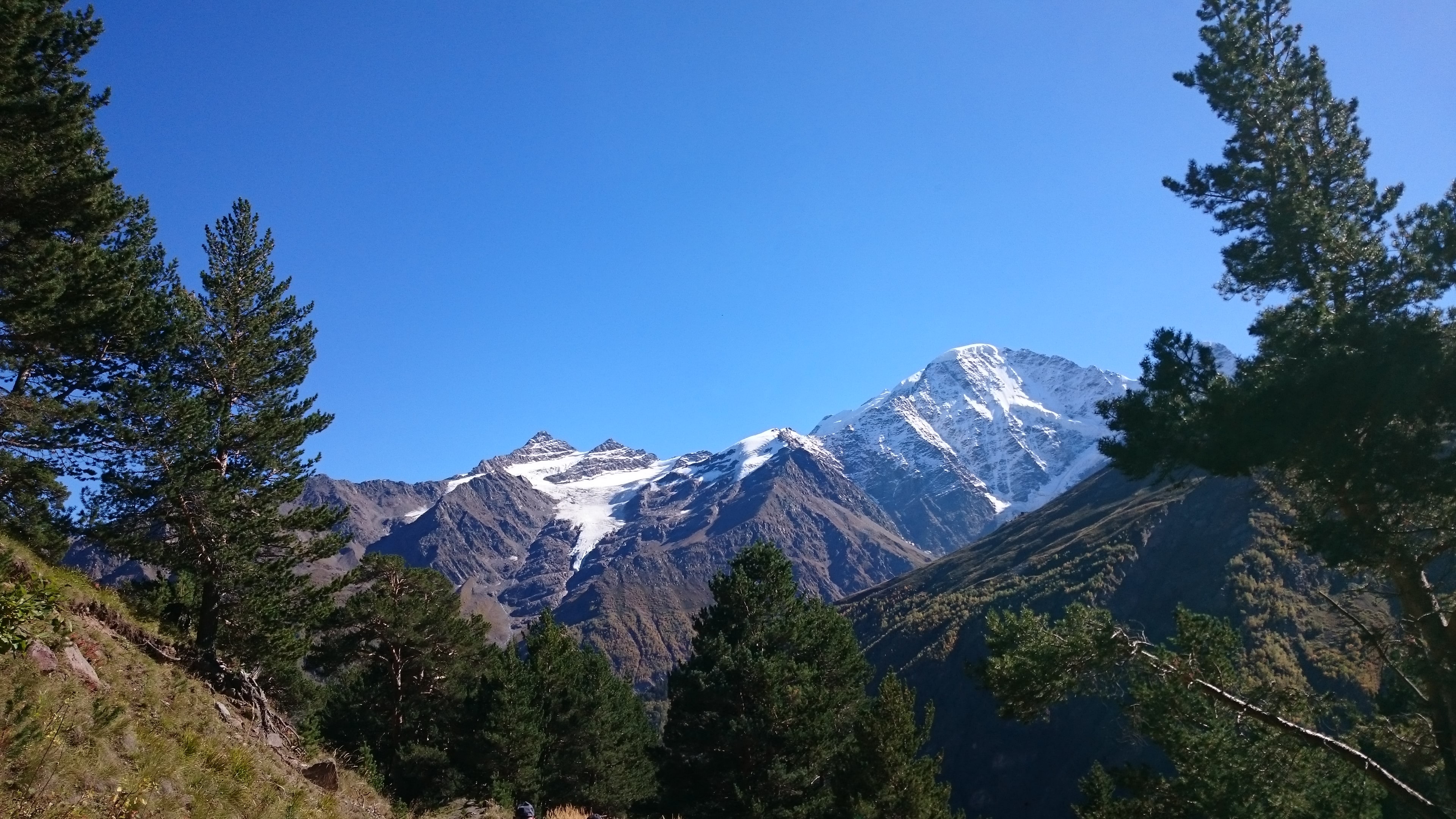 Чем выше мы поднимались, тем меньше становилось деревьев и желтее трава. Последний отрезок пути проходил по практически голым, подставленным последнему осеннему теплу бокам Пика Терскол. Миновав расположившуюся на нем международную астрономическую обсерваторию я, запыхавшись, наконец-то взобралась на 3000 метров. С небольшой площадки, напоминающей гнездо гигантского орла, во все стороны открывались потрясающие виды. Прямо перед нами, застилая горизонт, ширились голые каменистые, покрытые вечными снегами, гребни Кавказского Хребта. Ближе к левому его краю рогами ввысь тянулась Ушба – вершина, имеющая дурную славу. Позади нас возвышались две огромные заснеженные вершины Эльбруса. Справа, с них спускался ледник, превращающийся в каньоне под нами в реку Терскол.