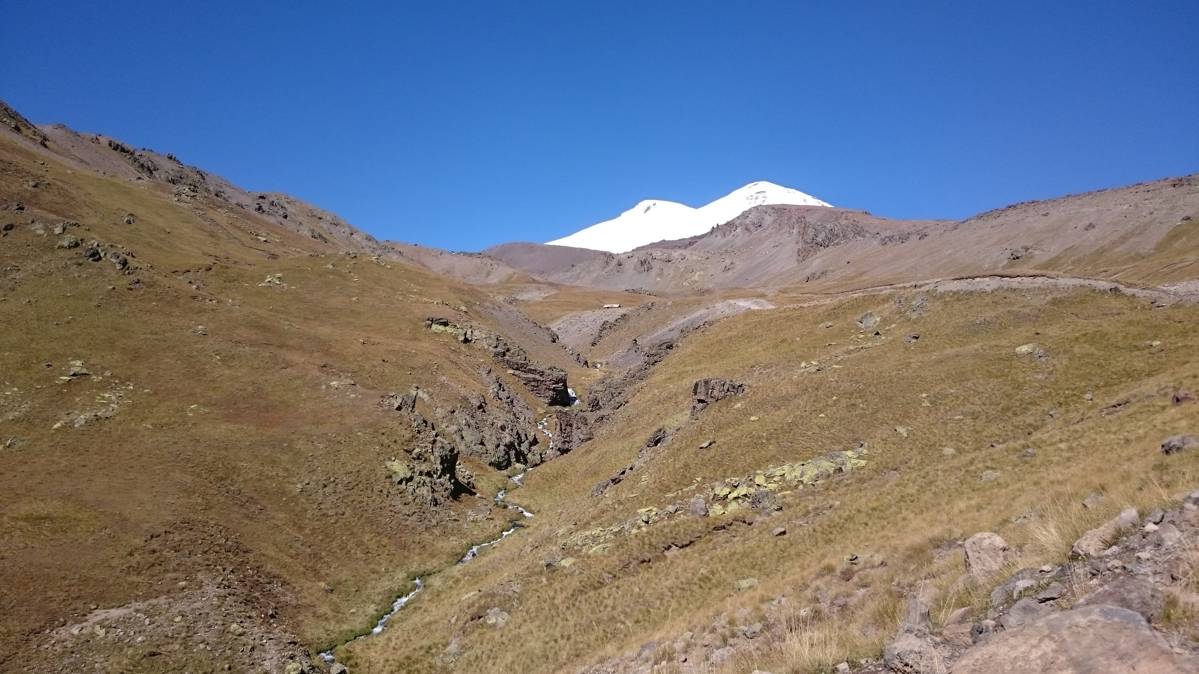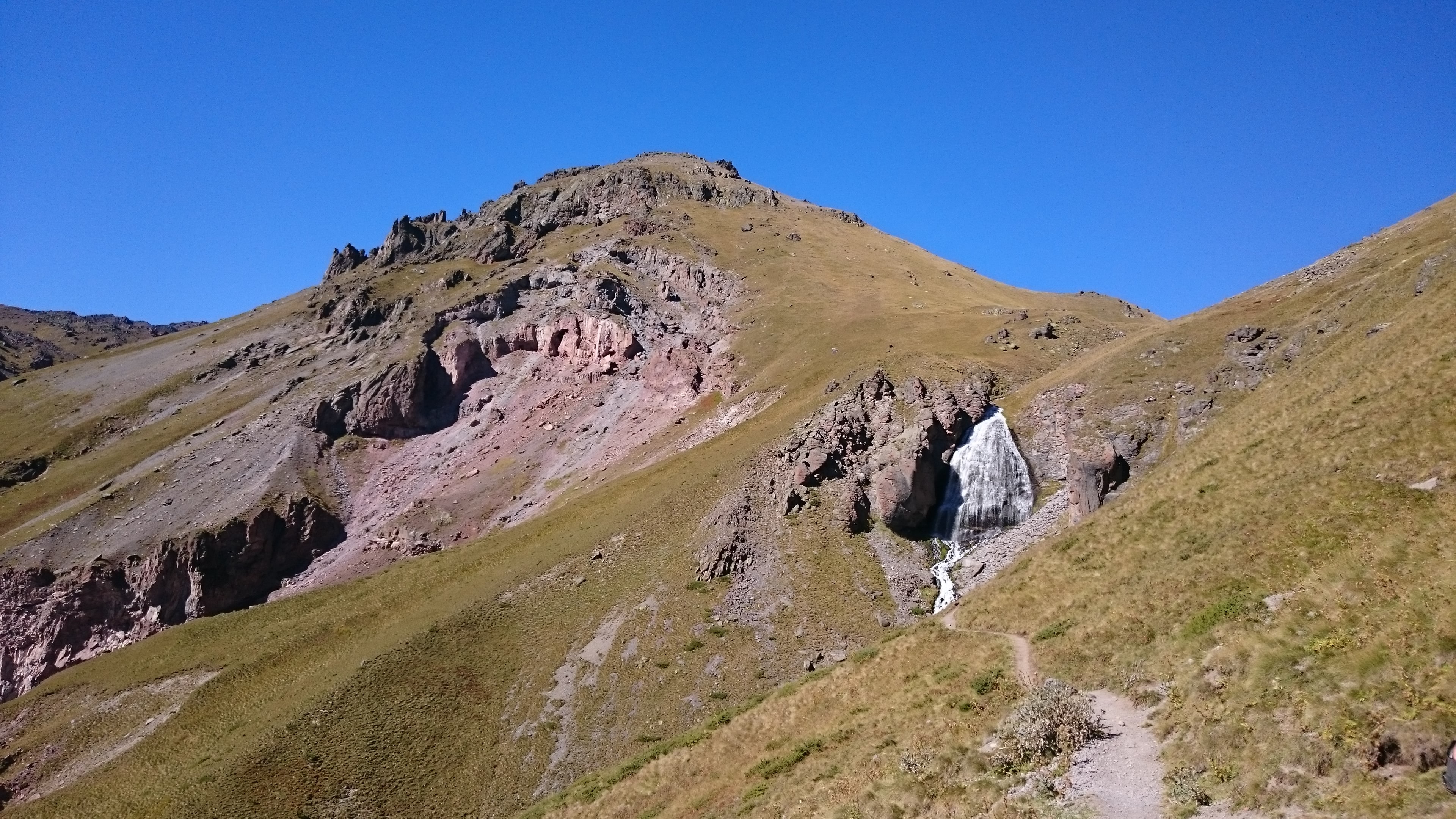 Мы прошли низиной, затем срезали по тайной тропе меж деревьев и вышли на петляющую дорогу, с которой уже не сворачивали практически до самого конца. Мы протопали мимо стада баранов, мирно пасущегося на крутых склонах. Мы сделали привал у водопада “Девичьи Косы”, полюбовавшись его красотами и напившись чистейшей леденящей горной воды. Тут Шеф-гид нас внезапно строго, но справедливо отругал за забегание вперед и постоянное фотографирование, потому как это нарушает ритм и вообще не безопасно. Ведь акклиматизационные выходы нужны не только для очевидной тренировки тела в условиях высокогорья, но и для тренировки функционирования и взаимодействия команды в условиях восхождения. Я незамедлительно устыдилась, потому что всю дорогу безбожно фотографировала. В свое оправдание могу лишь сказать, что виды открывались невероятной красоты: терракотово-коричневые громадины с белыми ледяными шапками высились во все стороны света, куда хватало глаз, а между ними вились бежево-кремовые дорожки обернутые с боков коврами зелено-желтой травы; абсолютно чистое высоченное небо заливало всю округу светом и яркое теплое солнце нахально лезло лучами в глаза и оставляло блики и разводы на фотографиях.