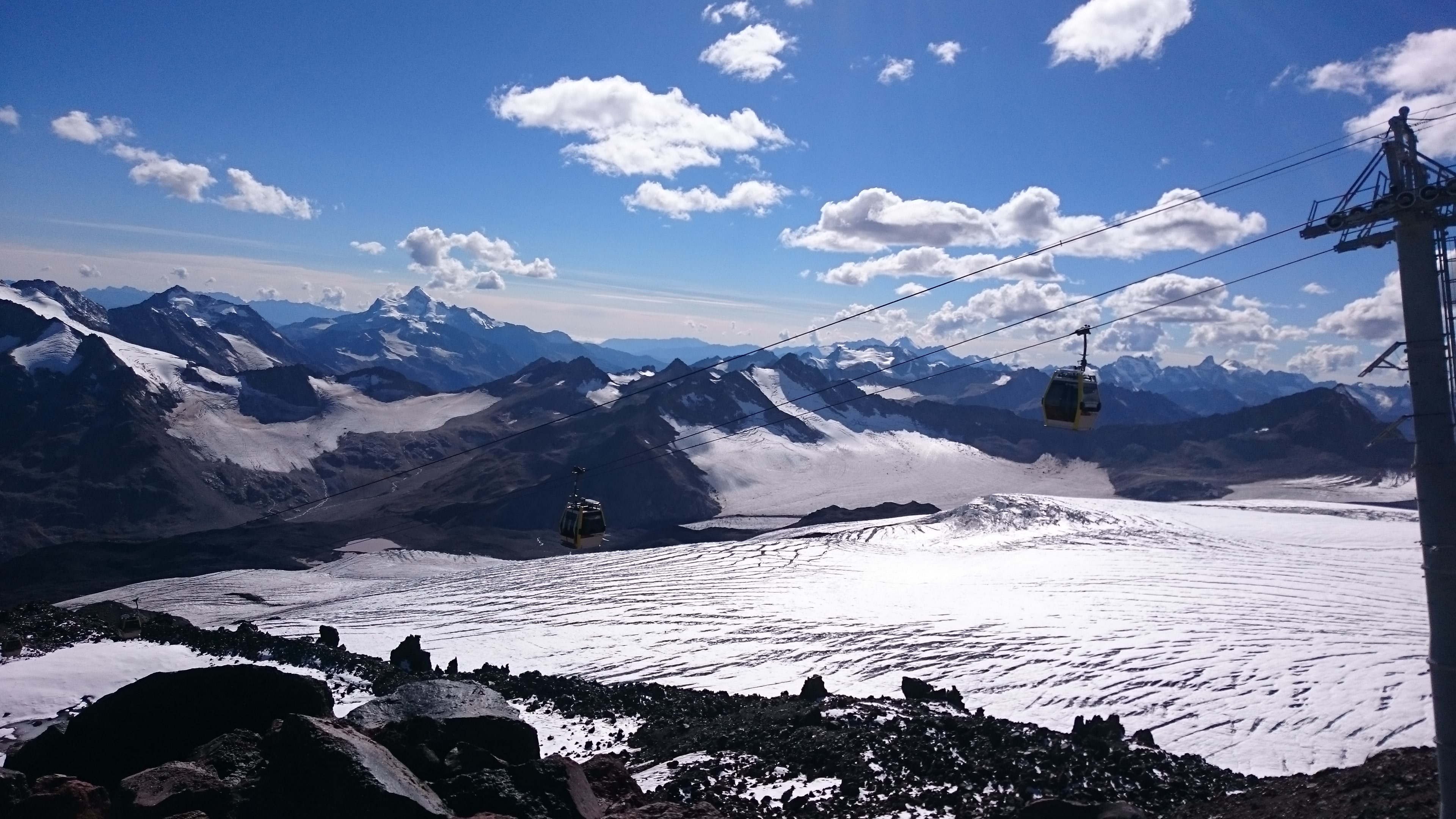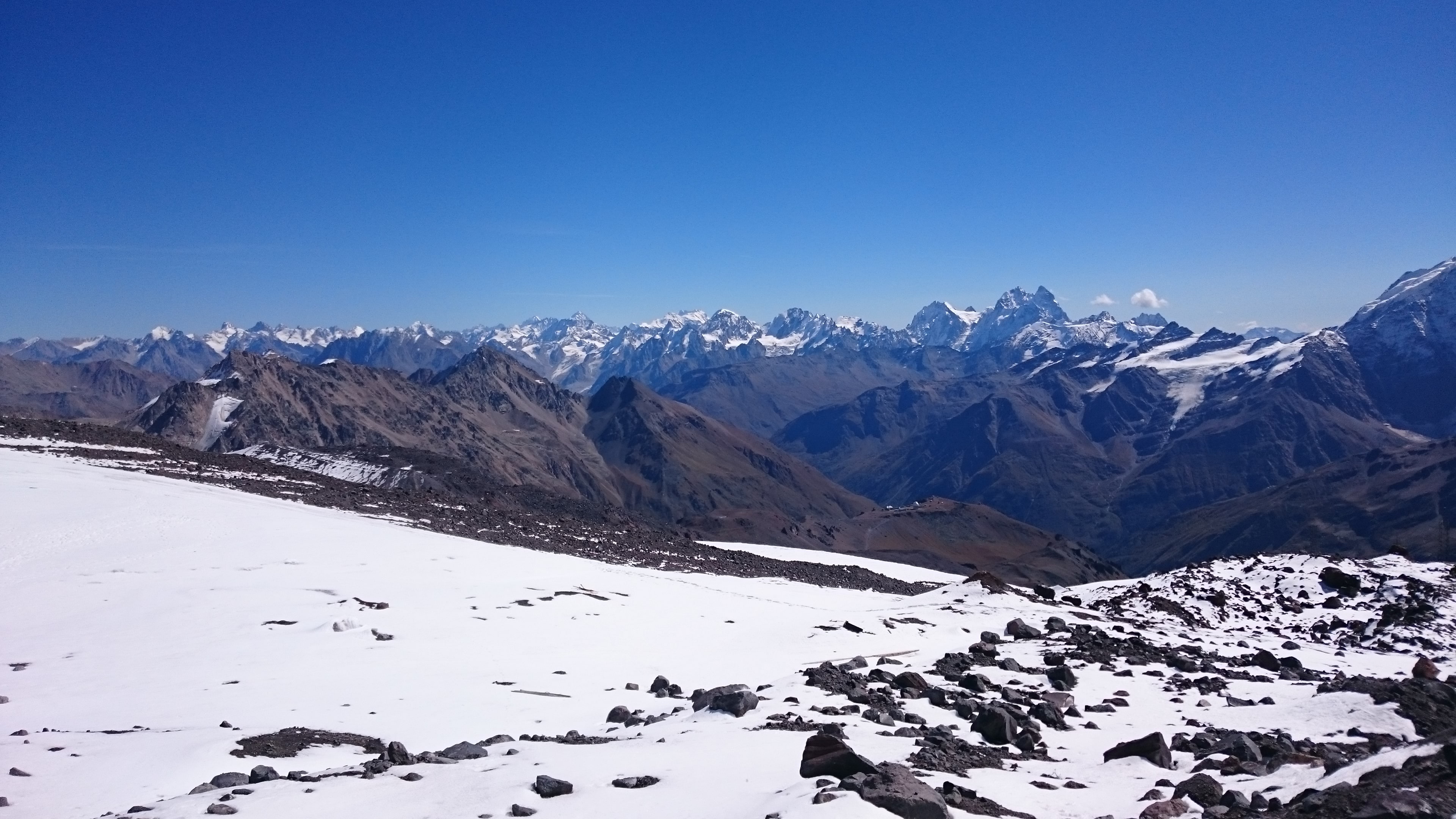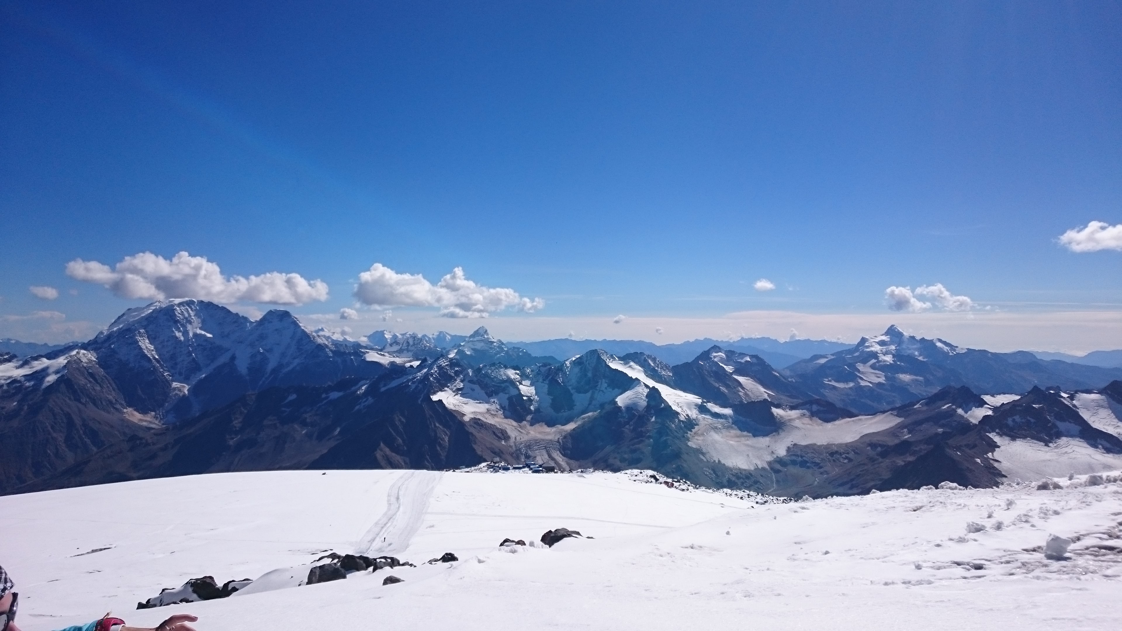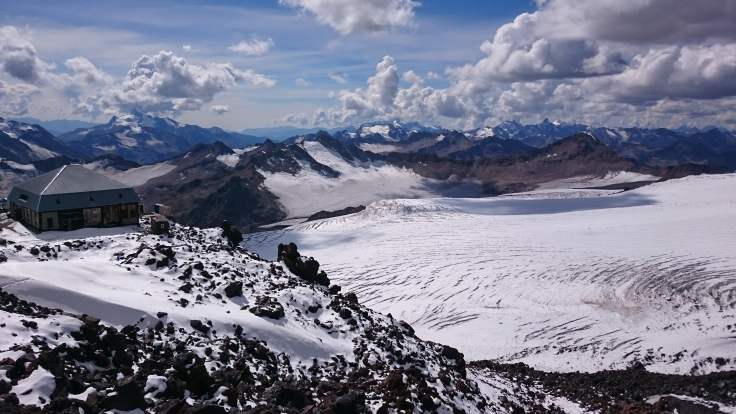 На высоте 3850 метров, на станции новой канатки Гарабаши уже лежал снег и обдувал ветерок, поэтому было приятно прохладно. Тут мы сделали привал чтобы остатки нашей команды смогли одеть горные ботинки, в то время как уже пришедшие в них – осматривались и наслаждались видами. С этих высот Кавказский Хребет, местами укрытый острыми снежными шапками, лежал как на ладони во все стороны, занимая весь горизонт. Слева от канатки сплошным морщинистым ледяным ковром полз ледник большой Азау. А впереди – ширился ослепительно белый Двуглавый Эльбрус, он казался таким обманчиво близким и при этом пугающе крутым.