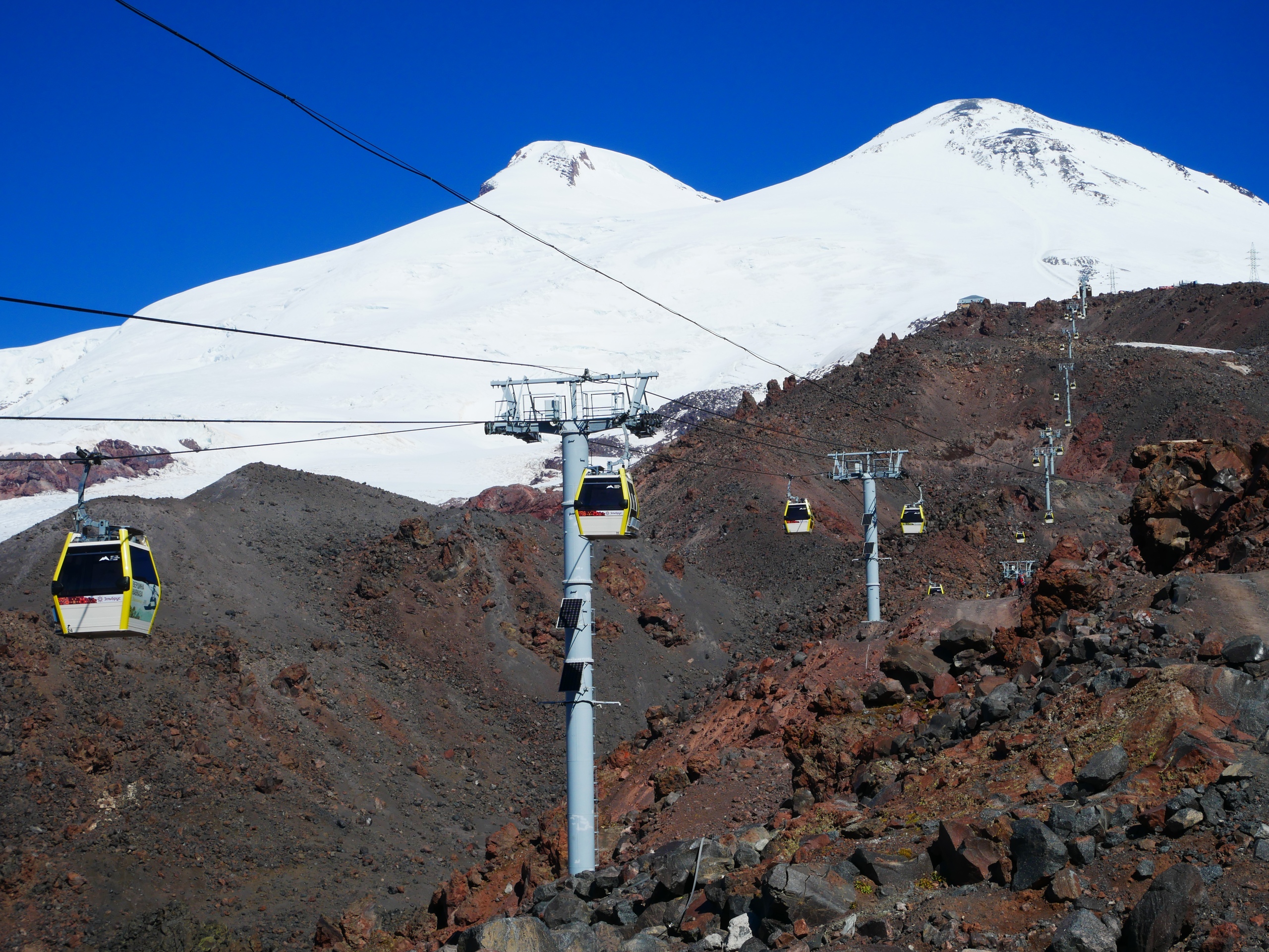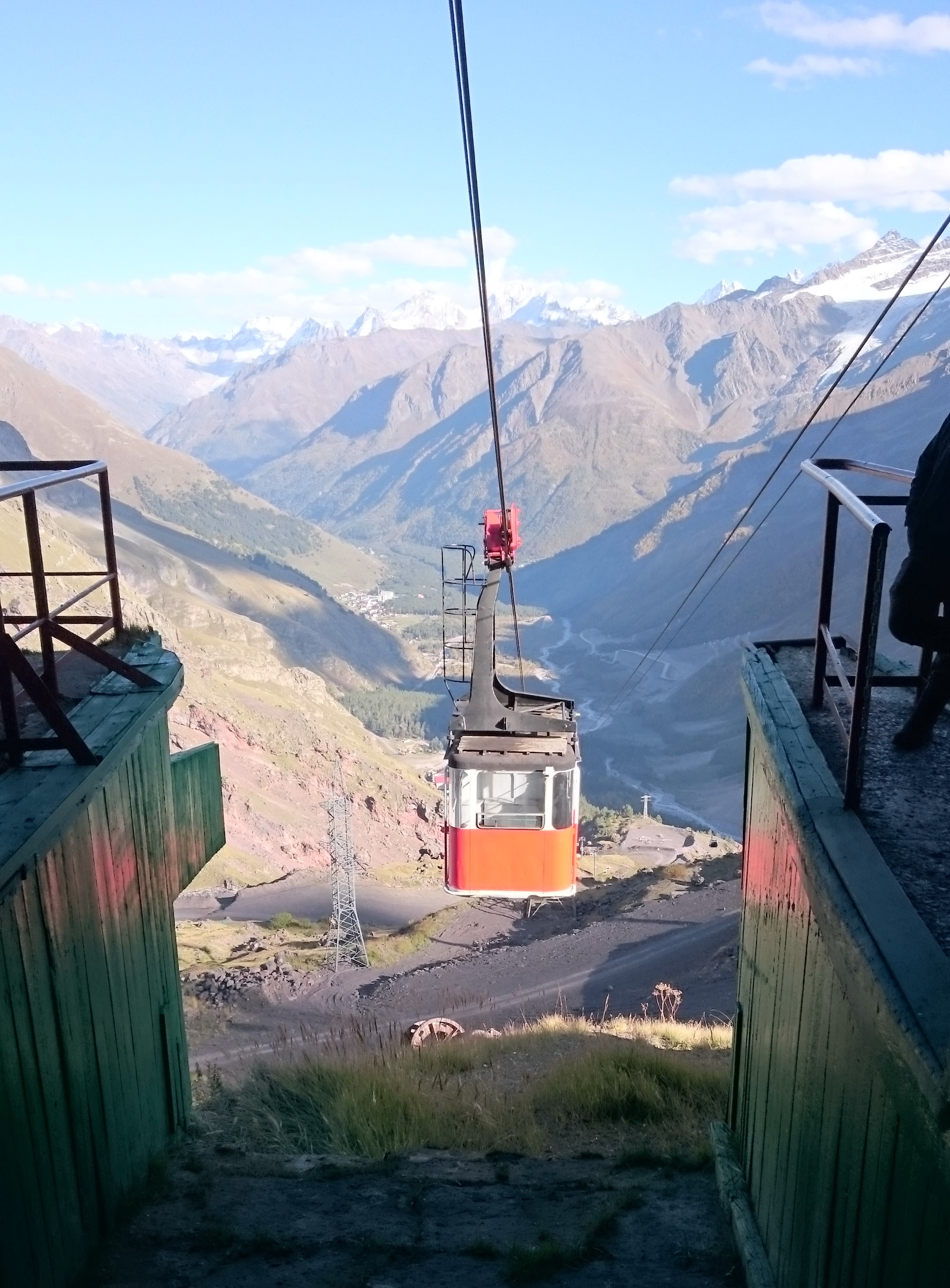 Стоимость новой канатки была более чем в 2 раза выше, но зато она довозила сразу до станции Гарабаши, что на 3850 метрах. Ну как, сразу – в 3 приема. Я бы даже сказала – в три крайне неудобных для вьючных туристов приема. Движение кабинок на местах посадки, естественно, было по дуге и непрерывным, за исключением тех нескольких случаев, когда канатка переставала работать. Правда почему-то всегда в неподходящий для нас момент. Скорость, в принципе, была не очень высокой, но, честно говоря, и не достаточно низкой, чтобы в этот краткий промежуток четверо или пятеро из нас успели бы впихнуть свои располневшие баулы (в количестве от 2 шт на душу) и успеть впрыгнуть в кабинку целиком (далеко не всегда изящно) перед тем, как двери закроются. И это было только треть дела, ибо на каждой станции, а их было 3 в общей сложности, мы должны были в точно таких же условиях выпрыгивать и выпихивать свои вещи наружу, чтобы не отправиться обратно. Плюс, на каждой промежуточной станции (Кругозор и Мир) нам нужно было перебираться с одной секции на другую по узким извилистым проходам, что несколько нервировало. Из-за всех этих передряг новая канатка не произвела на меня благоприятное впечатление, хотя сами кабинки были довольно комфортными, а открывающиеся из них виды, как всегда – прекрасны.