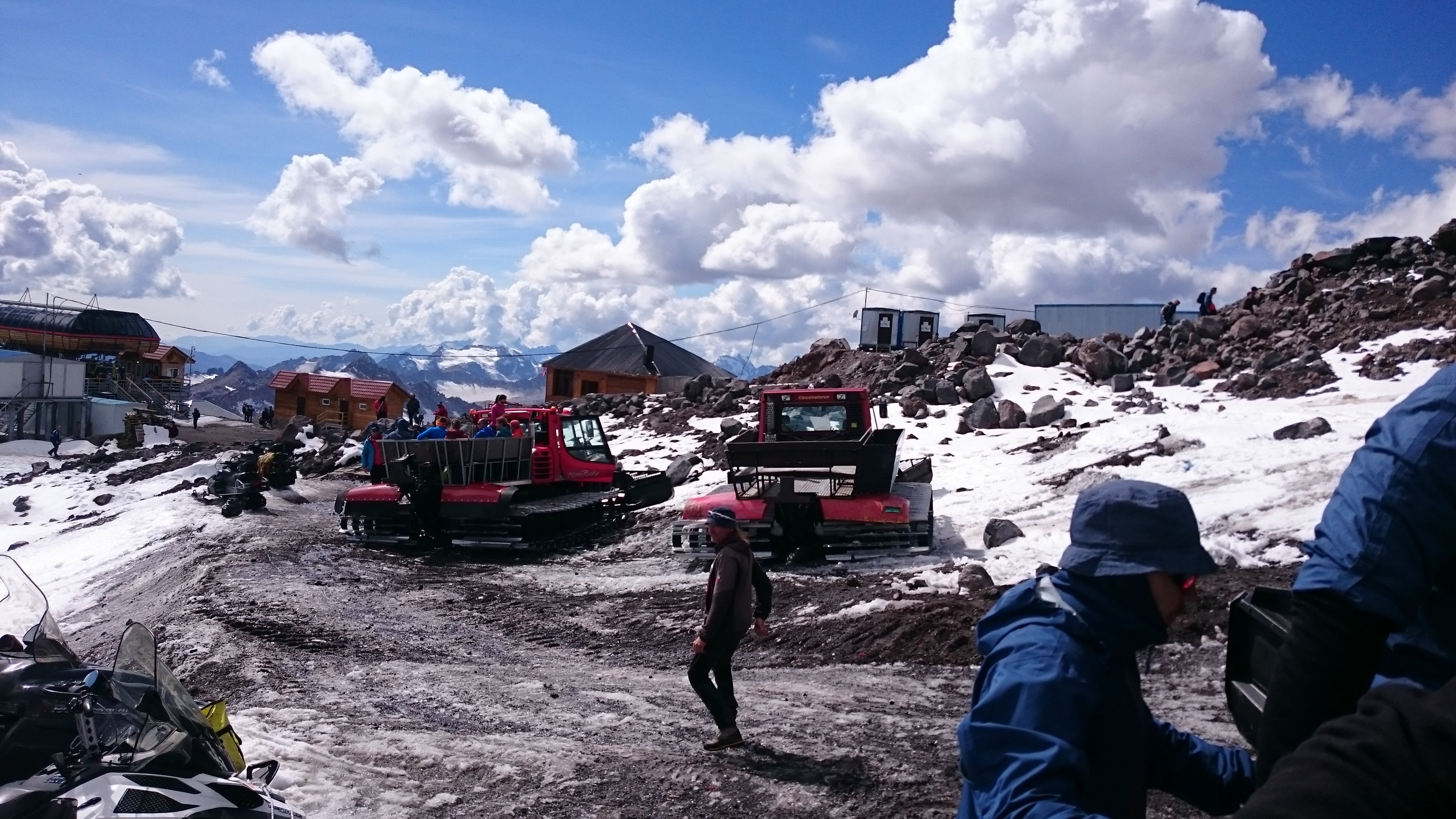 Собравшись наконец, всеми 30 человеками на конечной станции мы разбились на 2 группы: 10 человек поселялись тут же, в приюте “Сердце Эльбруса”, а 20 человек (в том числе и я) продолжали путь в “Лепрус”, находившийся выше, на 3900 метрах. Поэтому, в то время как Сердечники уже счастливо пошли обустраиваться, мы пошли на ратраки, что должны были нас довезти до места.