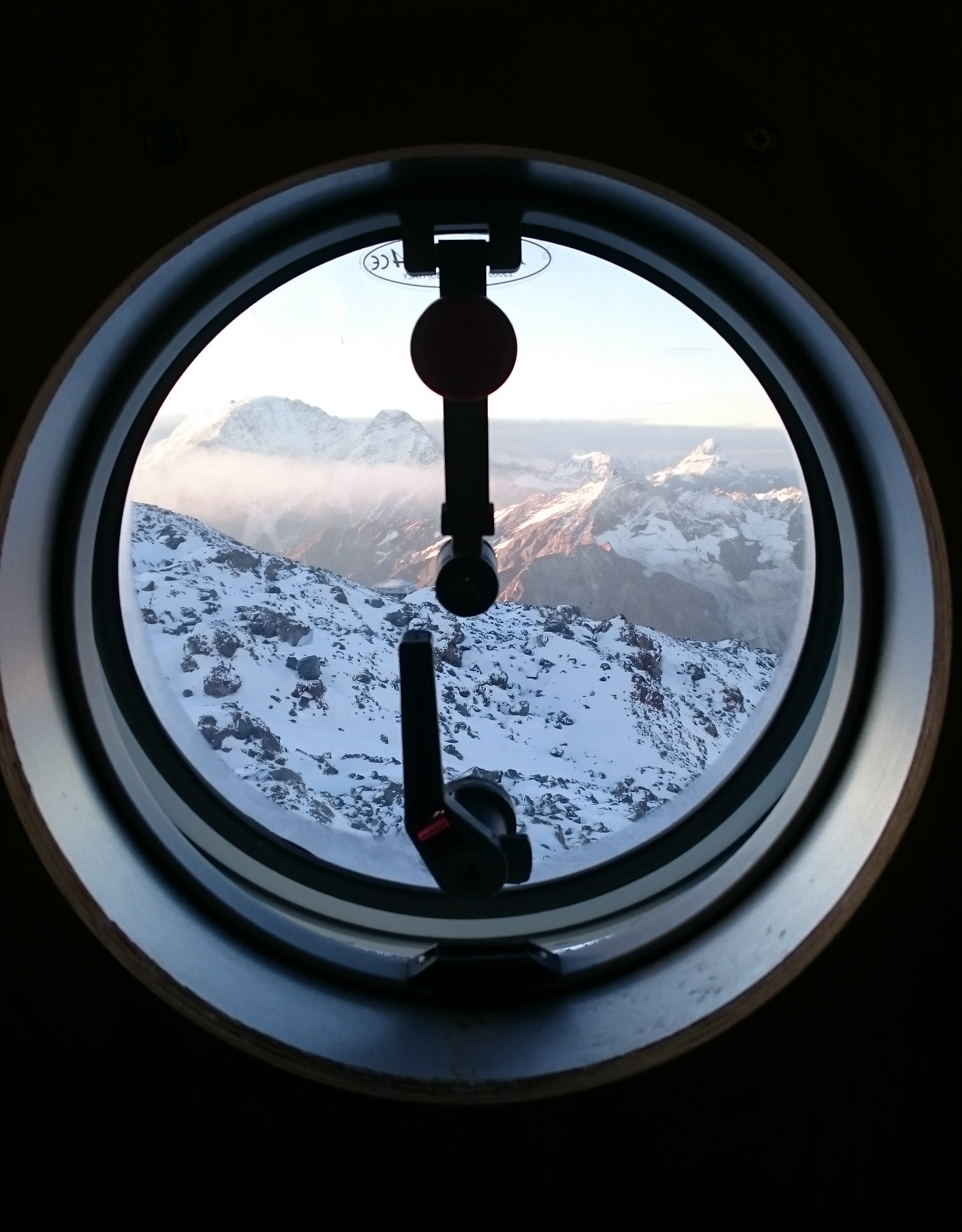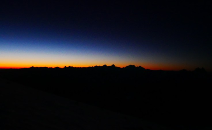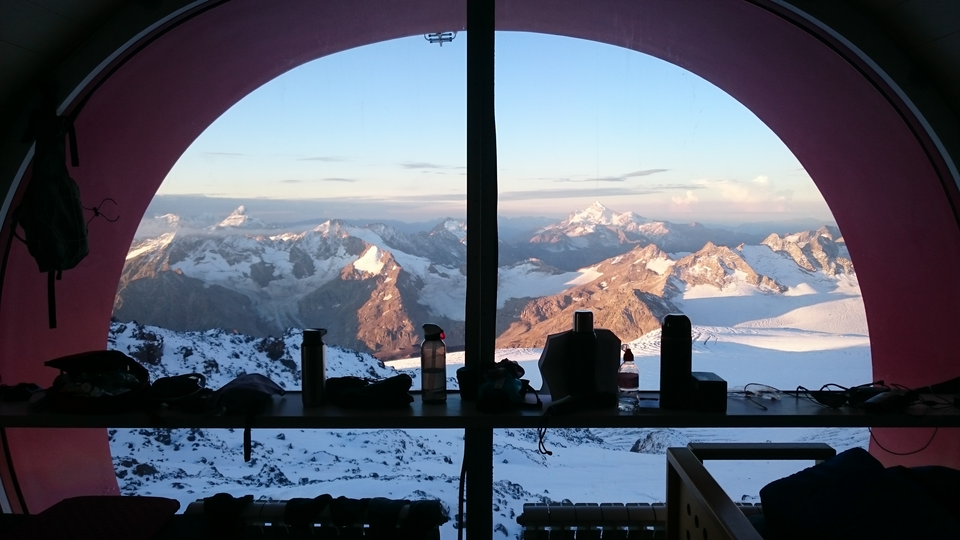 К вечеру, в мыслях о Восхождении и из-за отсутствия полезных дел, которыми можно было бы себя занять или хотя бы отвлечь, наше волнение стало просто нестерпимым. Переживали его все по-разному, но общий нервный фон буквально электризовал воздух. Мы слонялись туда-сюда, сидели в интернете, травили байки, собирали рюкзаки и готовили одежду, питье и еду на завтра, жевали орехи и конфеты, ждали ужин… На закате, уставшие от тревоги и завороженные открывшейся наконец-то панорамой, мы сели в кают-компании у большого окна и в темноте и каком-то странном трансе, просто смотрели под музыку как садится солнце и появляются звезды. В какой-то момент получилось так, что в окнах слева засветила полная луна, в панорамном окне над горами зажглись звезды, а в окнах справа еще отгорал оранжевым сиянием закат. Этот момент безвременья между днем и ночью, между “еще не” и “уже да” был действительно каким-то необыкновенным.