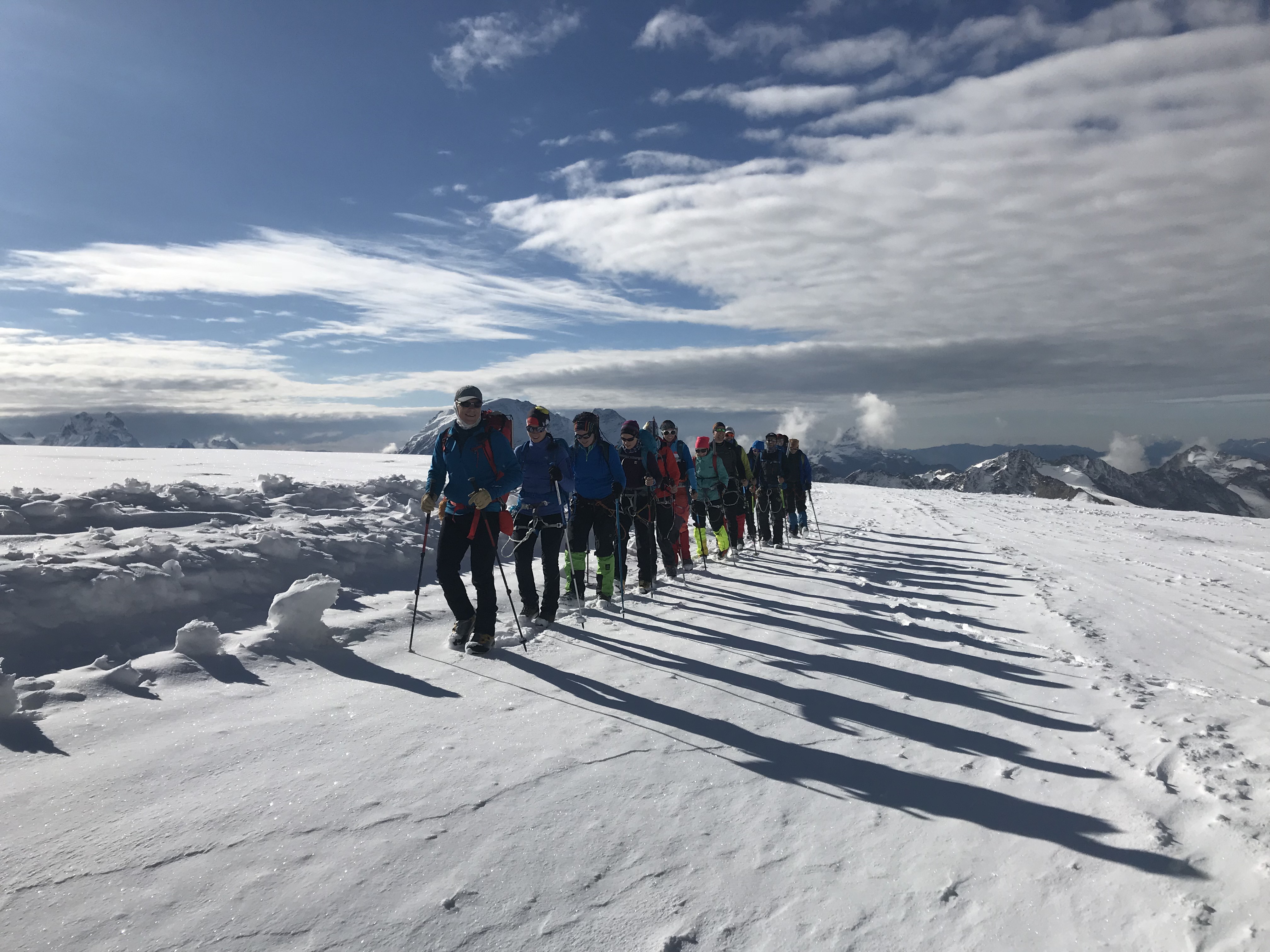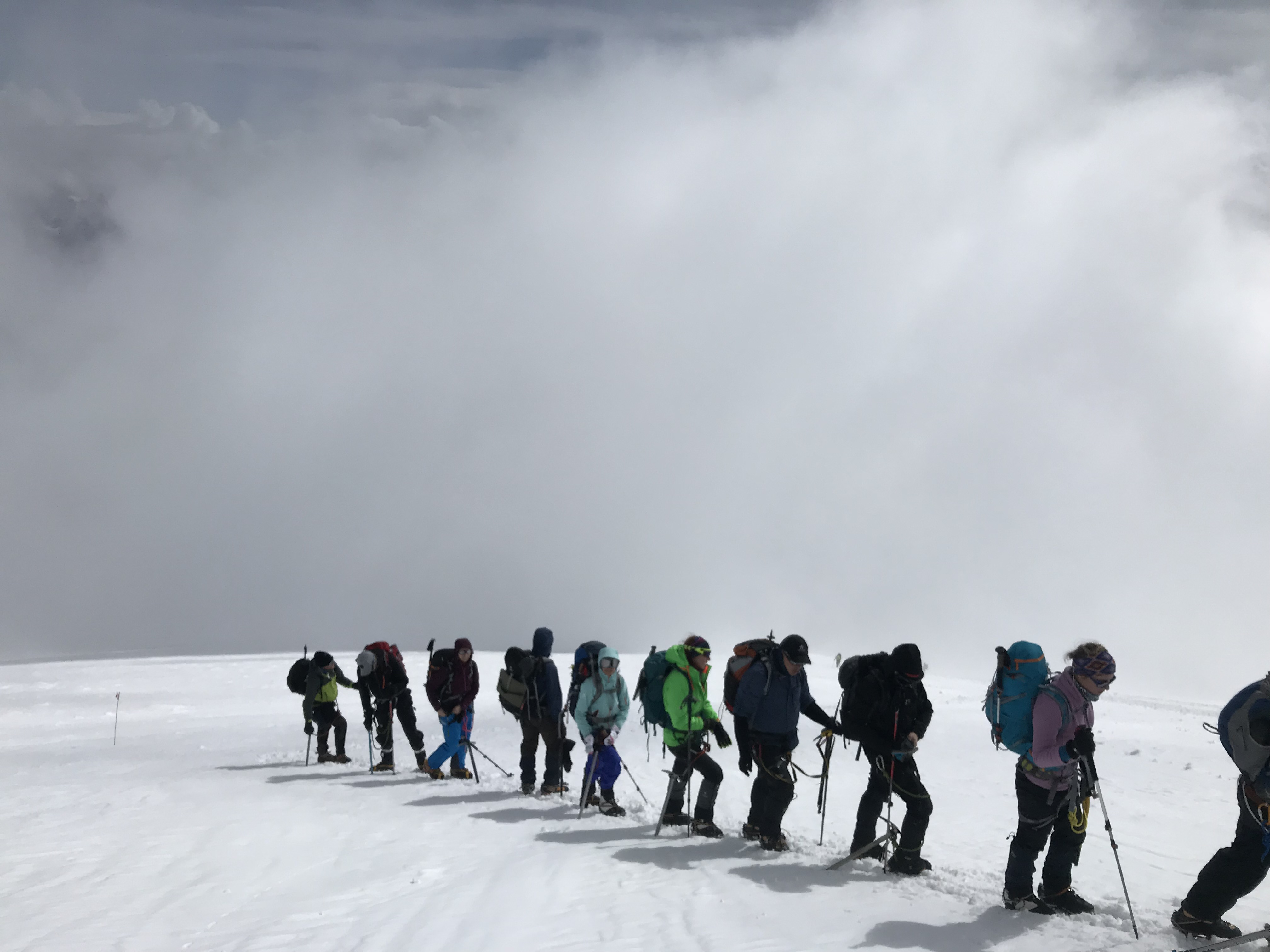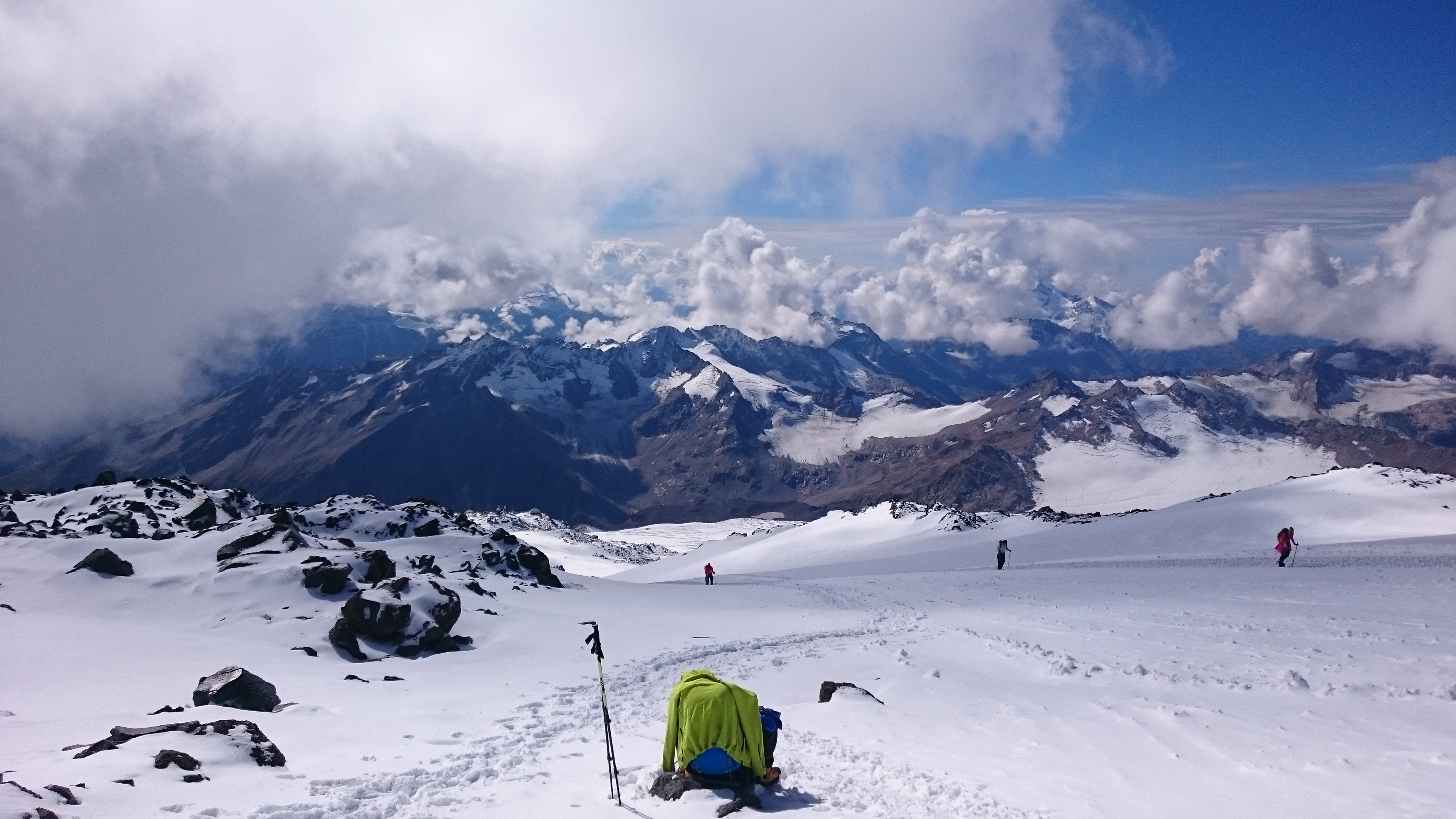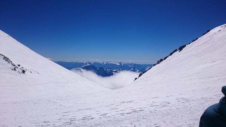 На верхней точке Скал Пастухова на 4750 метрах мы наконец вышли из нижней границы облака, а может просто их к этому времени разогнал ветер. Это было невероятно впечатляющее зрелище: мы выходили из тумана, а под нами возникали горные вершины освещенные солнцем. Мне вдруг стало очень понятно, почему некоторые народы селили своих богов именно на самых высоких горах. Если бы я не чувствовала себя такой уставшей и каждое движение не давалось бы мне так тяжело, то я могла бы почувствовать себя Олимпийским Богом, спускающимся из своих Небесных Чертогов на Землю.