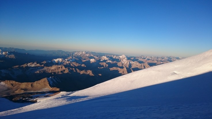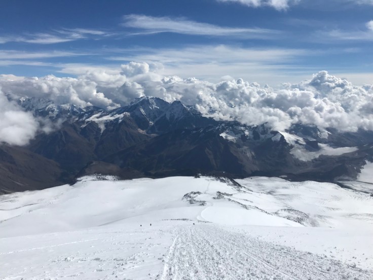 И вот, после стольких дней длинных акклиматизационных выходов, после трудно переносимого отсутствия хорошего сна и душа, после всех этих медленных и тяжелых подъемов и спусков, физического и морального напряжения, преодоления себя, я наконец-то находилась на самой высокой точке Европы. После 6,5 часов выматывающей дороги мы стояли на занесенным снегом, обдуваемом всеми ветрами куске камня, а перед нами лежала покрытая глубокими старческими морщинами Планета, Мир Без Теней. Все, абсолютно все вокруг было ниже нас, даже белые пики Кавказских гор, даже облака, проплывающие над их вершинами, даже горизонт, белесой полосой отделяющий Земную твердь от Небесной. Выше нас была только пустота неестественно темно синего неба и самое яркое солнце, которое я только видела в жизни.