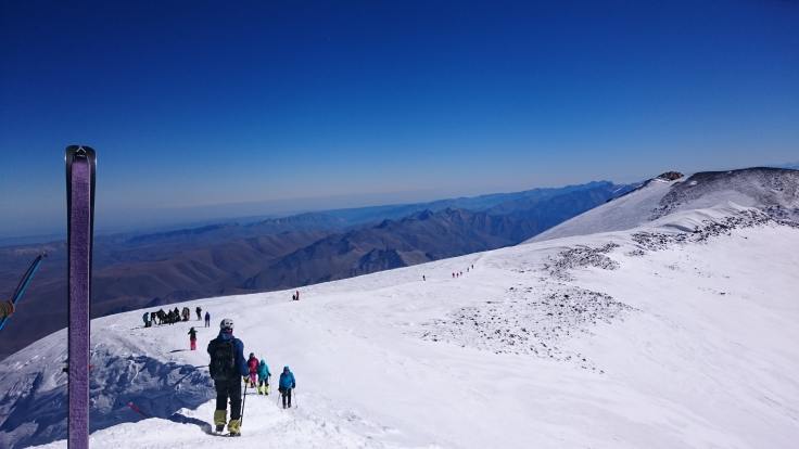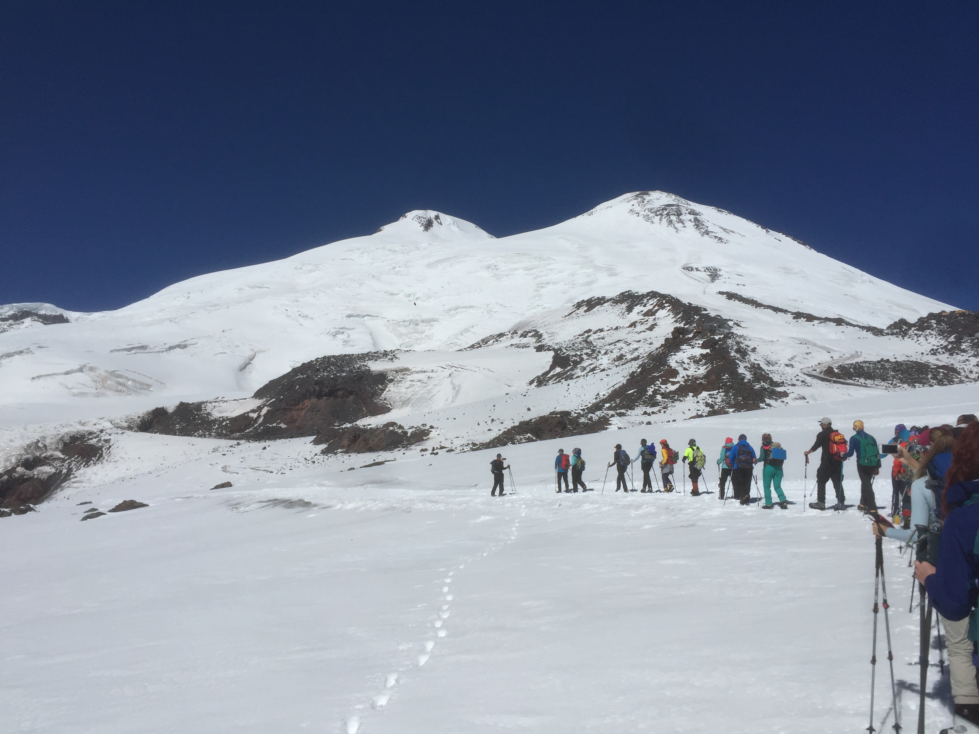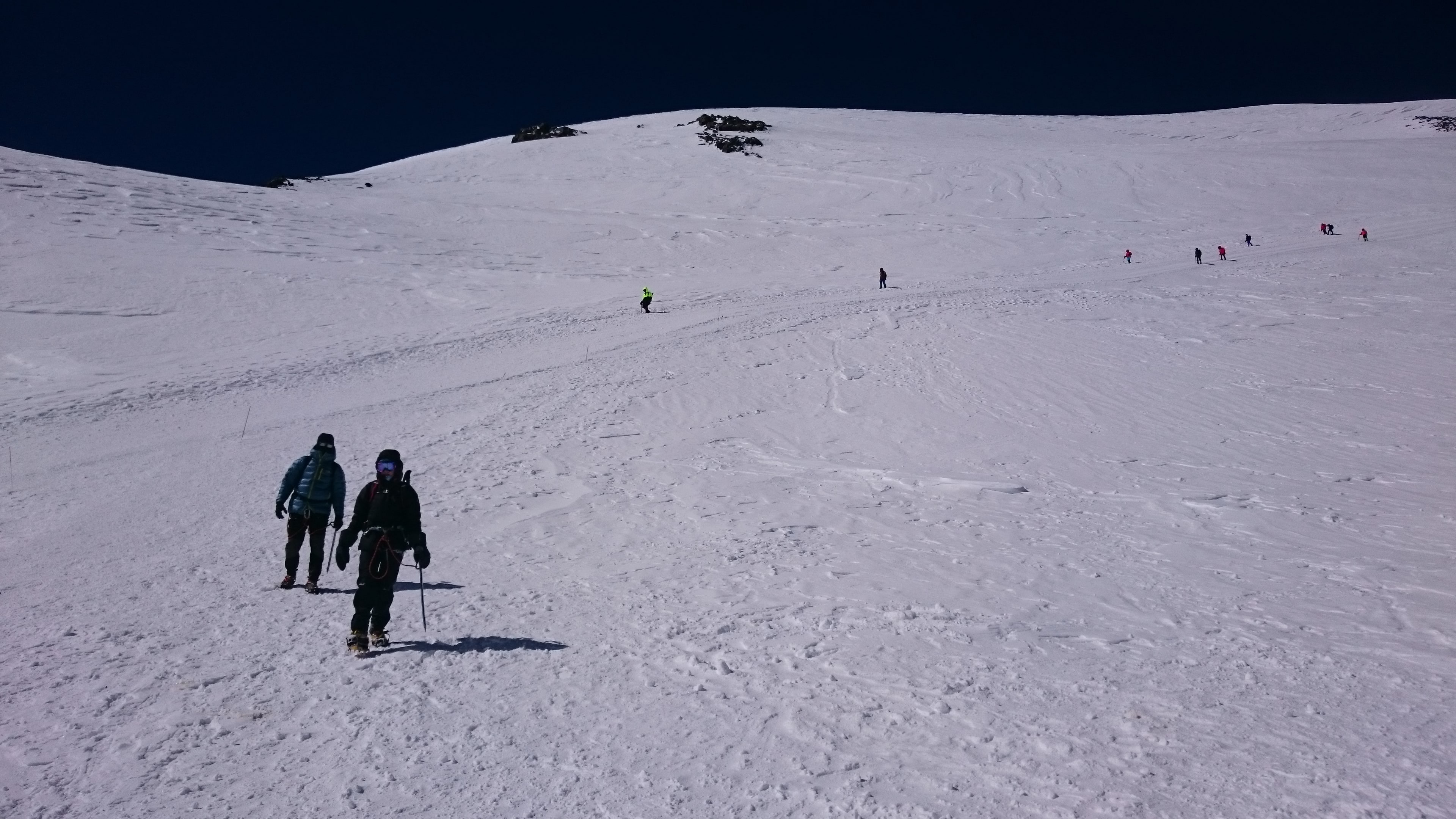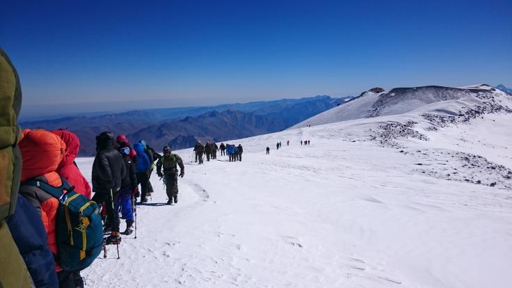 Потихонечку (прямо очень потихонечку) мы дошли до Седловины – развилки между западной и восточной вершинами на 5300 метрах. Мы сделали очередной привал, чтобы отдохнуть, подкрепиться и набраться сил, потому что усталость и Горняшка уже взяли свое. Конечно же мы не были единственной группой восходившей в этот день и мы уже встречались с компаниями пока шли по Косой полке, но тут, на Седловине, как на перепутье, можно было увидеть и оценить весь масштаб восхождения на Эльбрус в конце сезона: тонкими дырявыми муравьиными цепочками люди медленно пребывали на Седловину, там и сям оседая на привал, а потом поднимали себя и двигали дальше на вершину. В этот день, вместе с нами взошли около 200 человек.