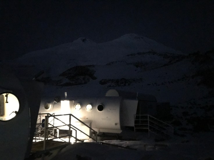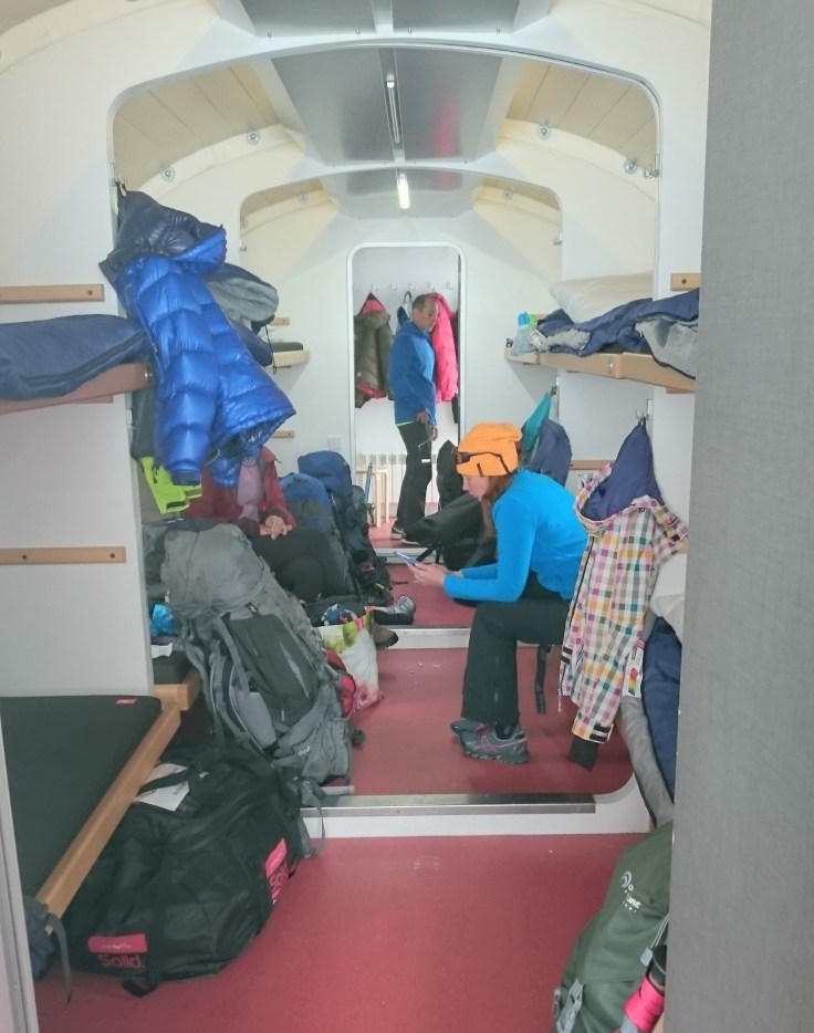 Наш приют состоял из 2х жилых бочек с двухуровневыми нарами и кают-компанией с панорамным окном с торца, бочки-столовой с панорамными окнами во всю стену выходящими прямо на Эльбрус и санитарного вагончика с туалетными кабинками и умывальниками с горячей водой. Поселение прошло интенсивно: в жестокой конкурентной борьбе мне досталась правая нижняя ближайшая к выходу нара (зато будет проще выбегать в туалет, подумала я), а на обед у нас был шикарный (для данных условий) шведский стол из домашней еды.