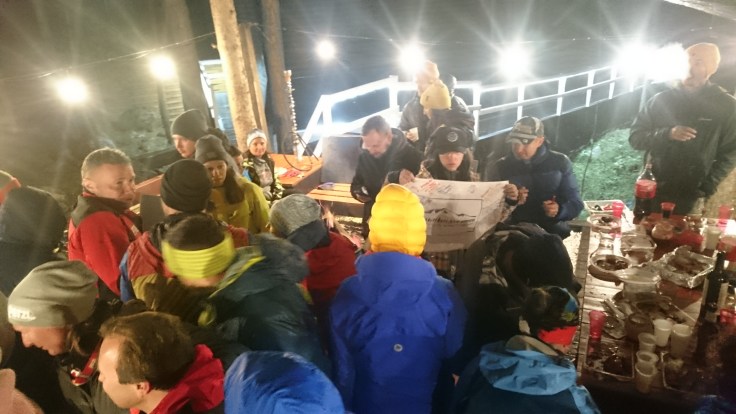 После подробных объяснений Шеф-гид выстроил в ряд нескольких человек в качестве столбиков, дал им в руки веревку и скомандовал старт тренировки. Для пущей надежности мы надели перчатки и варежки, в которых планировали восходить, чтобы натренироваться быстро и четко отвинчивать, открывать и завинчивать карабины, ведь на маршруте времени на это будет не много. Как обычно весело, с шутками и дурачеством мы опробовали процедуру. Когда же Шеф-гид остался доволен и отпустил нас, мы пошли в приют к Сердечникам, посмотреть как они живут и посидеть у них в баре (о да, у них есть бар). Через какое-то время, поскольку пить алкоголь “до горы” было нельзя, а нервозность перед завтрашним днем надо было куда-то девать, мы самостоятельно и очень дисциплинированно выстроились гуськом и вернулись обратно наверх, в наш приют.