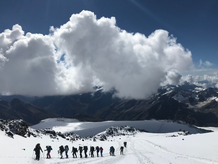 Сказать, что я нервничала – не сказать ничего. Я была практически в ужасе и в полушаге от истерики. Во-первых, идти нам нужно было в одну сторону – 6 часов (с привалами, конечно), в гору с уклоном от 20-35 градусов до 5000 метров, где погребенный под снегом лежал старый ратрак. Во-вторых, если кто-то (например я) не смог бы подняться до верха, то думать о вершине было бы просто бессмысленно. В-третьих, нас предупредили, что как раз ближе к 5000 метрам Горняшка (горная болезнь) покажет себя во всей красе на всех и каждом. В-четвертых, практически все из нас (в том числе и я) уже ходили с ногами залепленными пластырем (благослови Господь фирму Compeed!) или кашляли. В-пятых, сама по себе перспектива 6 часов к ряду идти в гору в тяжелом снаряжении и одежде, задыхаясь от нехватки кислорода и страдая от горной болезни была не то чтобы непривлекательной, а невероятно, потрясающе отталкивающей. Дом в Екатеринбурге и простая комфортная городская жизнь казалась отсюда каким-то дразнящим обманчивым сном. Но отступать, заплатив уже такие деньги – было поздно, а отказываться не попробовав – глупо, так что я собралась и пошла на встречу своей судьбе.