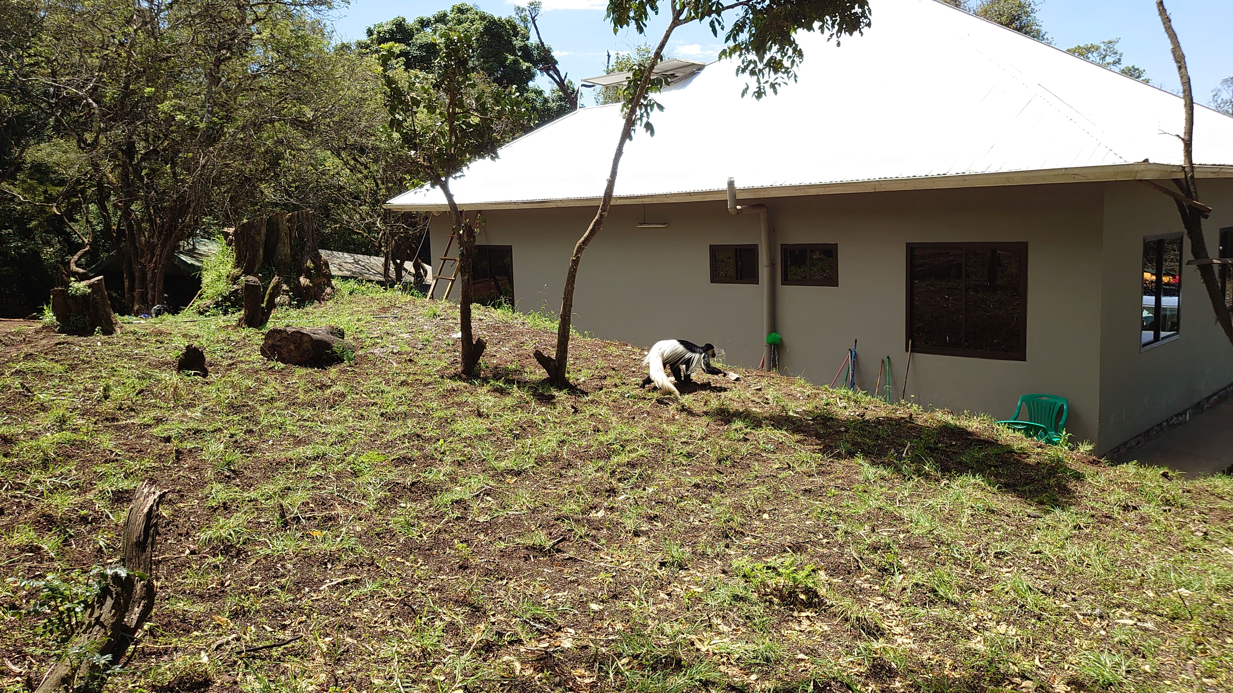 Мы выгрузились на западных воротах, начале тропы Лемошо. Тут небольшой лагерь с несколькими маленькими одноэтажными бетонными зданиями, одно – хозяйственное, другое – туалет, и ещё есть открытая беседка. В приложении и в качестве моральной поддержки к началу восхождения здесь обитает небольшая семья чёрно-белых, очень волосатых обезьян, мирно пасущихся на границе с лесом.