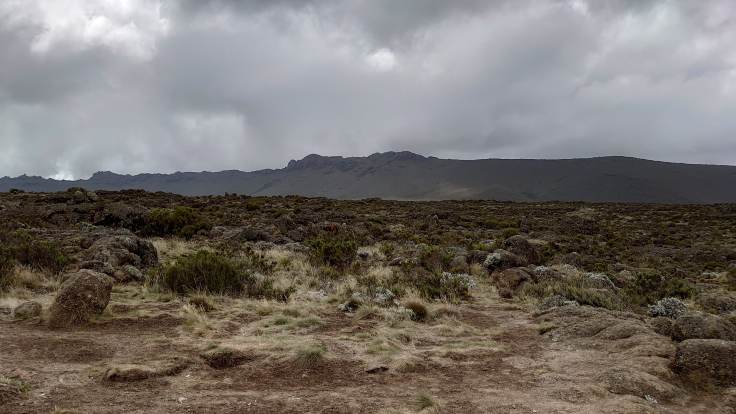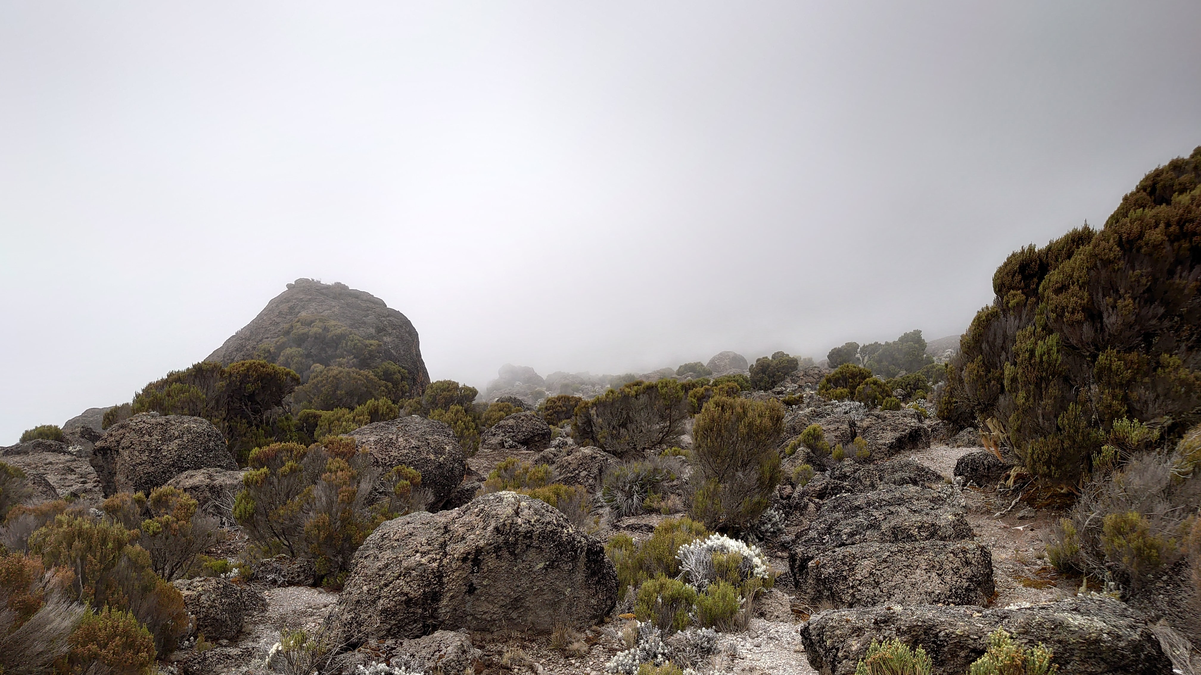 Скорость сегодня мы взяли чуть быстрее, чем вчера, так что бодро шли 4 часа кряду. Дорога идёт в гору и по камням, я начинаю уставать. Окружающая нас местность уже изменилась: мы перешли в Полузасушливые вересковые пустоши (3 – 4,2 км), тут заметно прохладнее – градусов 15, особенно учитывая сплошную облачность, вокруг нас плотный буровато- и беловато-зеленый кустарник и вездесущие кочки жухлой травы. Картина сама по себе не очень радостная, тем более в сравнении с тропическим лесом, из которого мы только утром вышли, а в добавок ещё наши гиды оказались страшными болтунами. Они беседуют о чем-то не прерываясь почти всю дорогу. Как у них только хватает легких. Если бы они параллельно переводили на английский, то я легко могла бы выучить суахили за это восхождение.