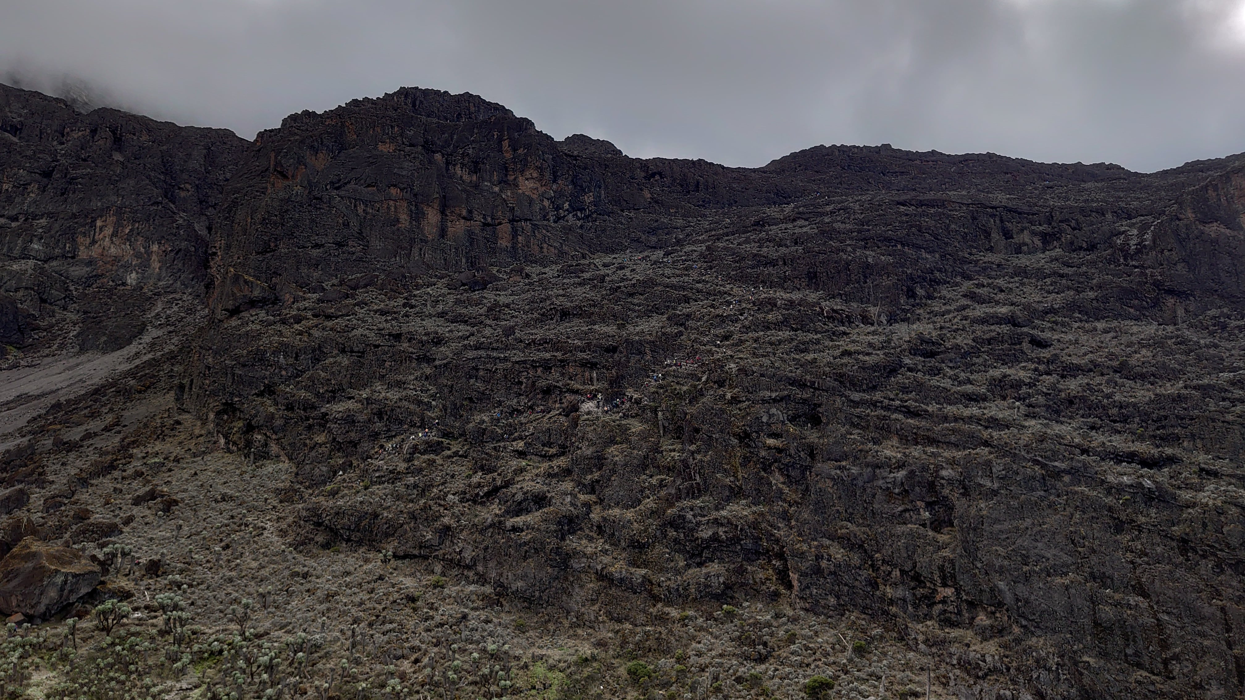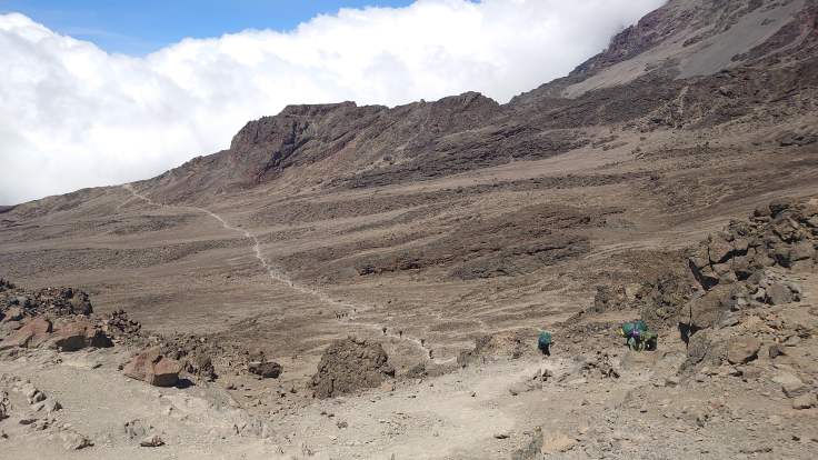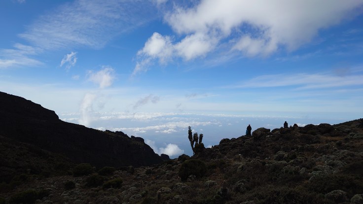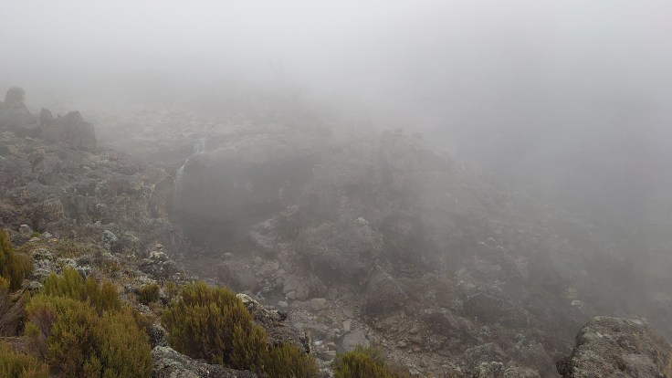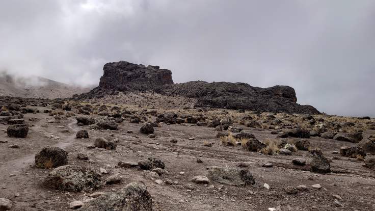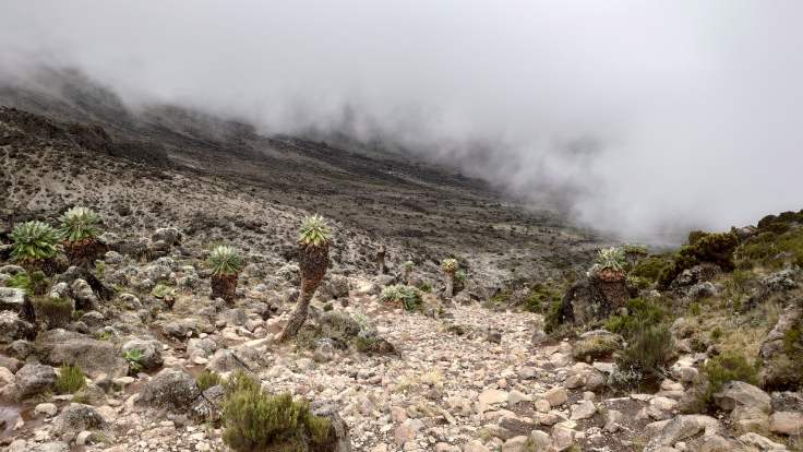 Теперь мы находимся в Афро-альпийской пустыне (4,2 – 5 км), температура днем тут может быть до 15°С, а ночью лишь около 0°С, растительность тут уже совсем скудная, если не сказать никакая: даже жалкие пучки желтой травы и те стали редкостью, вокруг – сплошные голые камни и скалы, без намека даже на лишайники. Под ногами – мелкая серая, будто цементная, пыль и осколки камней, которые, отскакивая из-под ботинок, звучат как черепки древней керамики. Наверное примерно так и выглядела вся Земля до того, как растения вышли на сушу: безвидно и пусто и солнце над бездною…