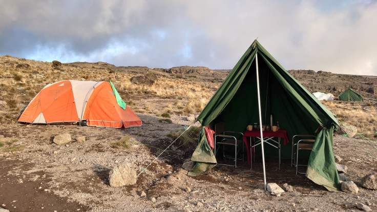 Пришли на новую стоянку. Тут мы заночуем и завтра отправимся в штурмовой лагерь. Как же всё-таки приятно идти по дороге, когда светит солнышко, даже если приходится надевать очки. Сегодня мне шлось намного легче, даже учитывая подъём на скалу, то ли вчерашняя акклиматизация сработала, то ли сон, то ли обилие суккулентов по маршруту, которые создавали впечатление какой-никакой, но всё же растительности, а может и всё вместе взятое.